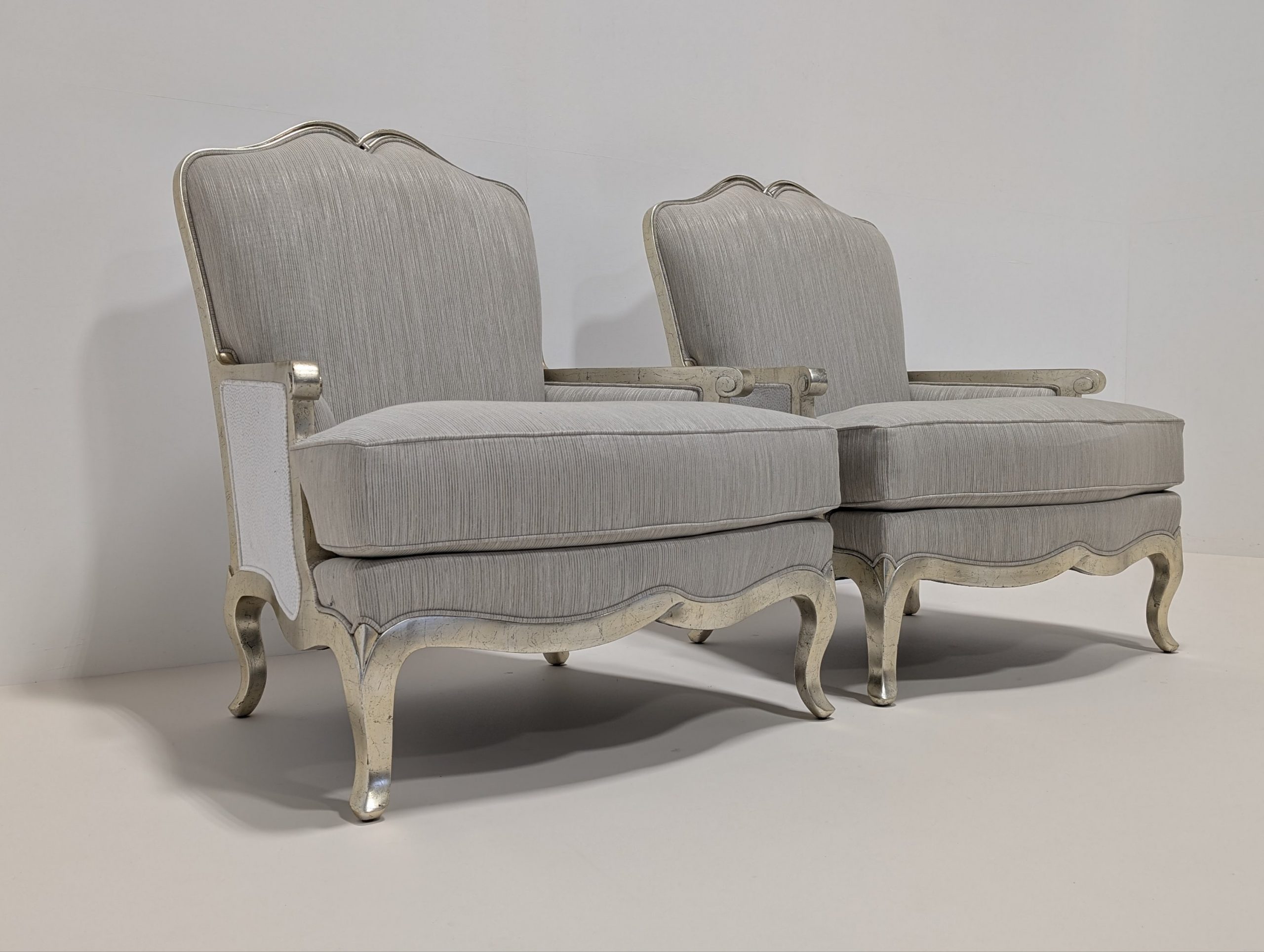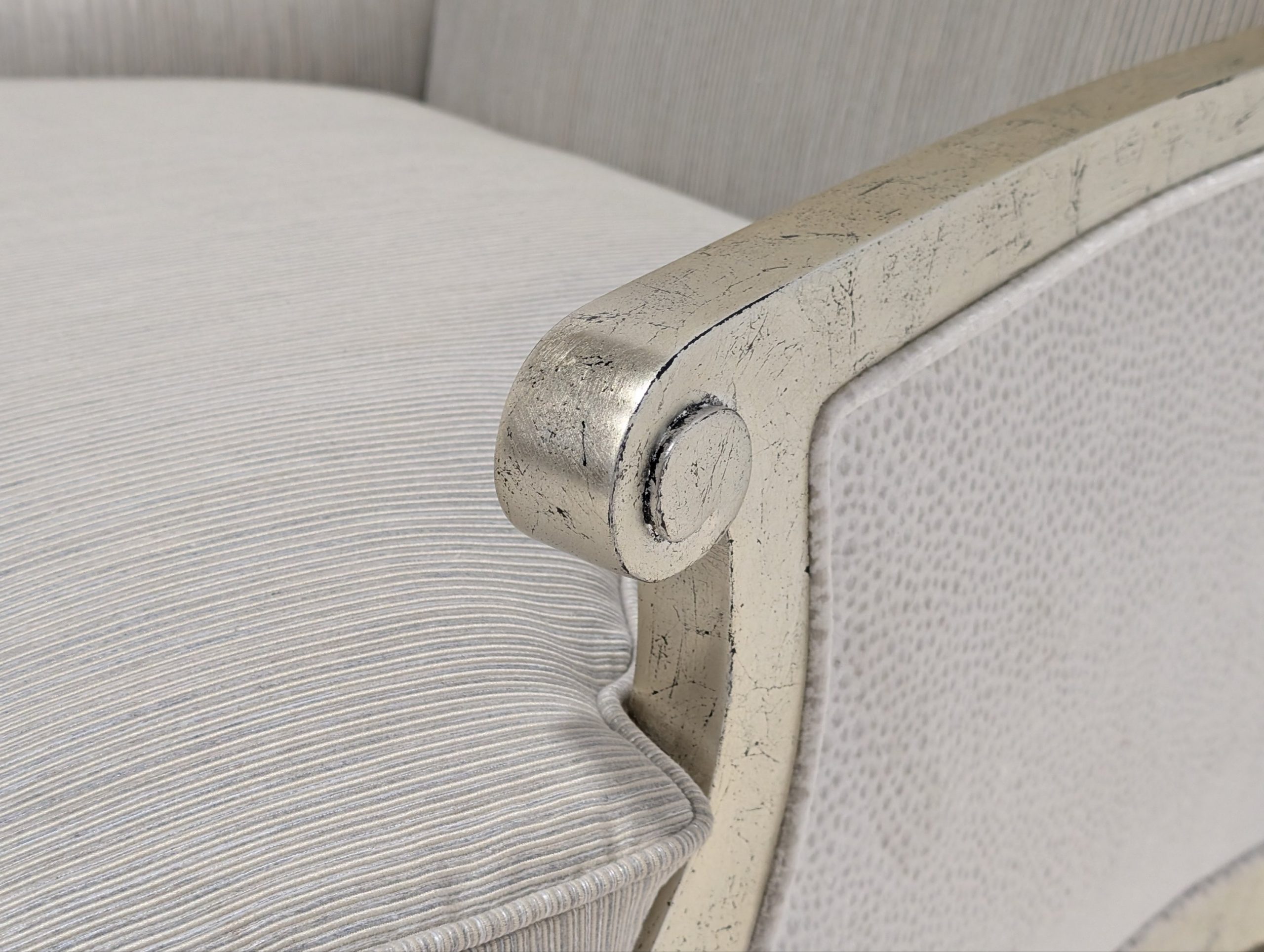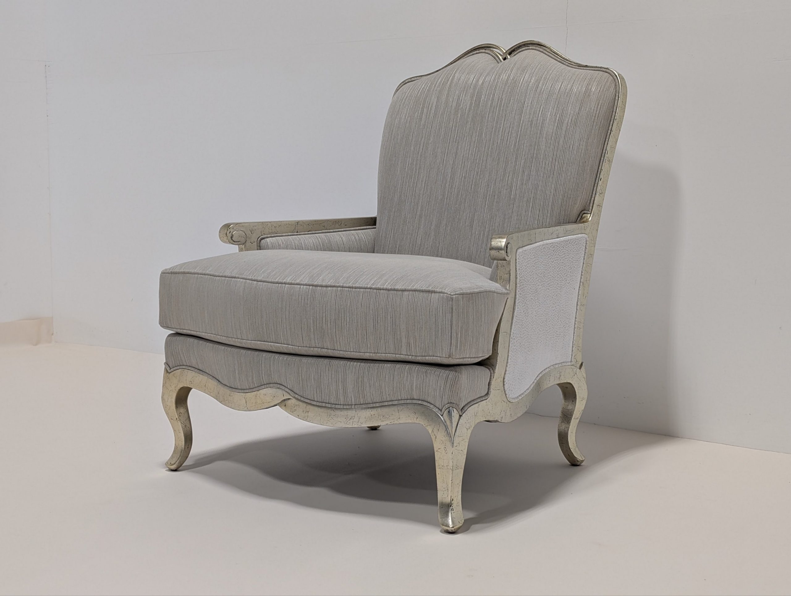 Displaying a fresh take on timeless elegance, these Christopher Guy lounge chairs feature open arms with graceful scroll detailing, a signature love heart-shaped backrest, and a sculptural bow-shaped base. Crafted from solid mahogany and finished in a striking Black Sea Silver Leaf, this design blends classic charm with a modern edge, embodying the brand’s signature sophistication.