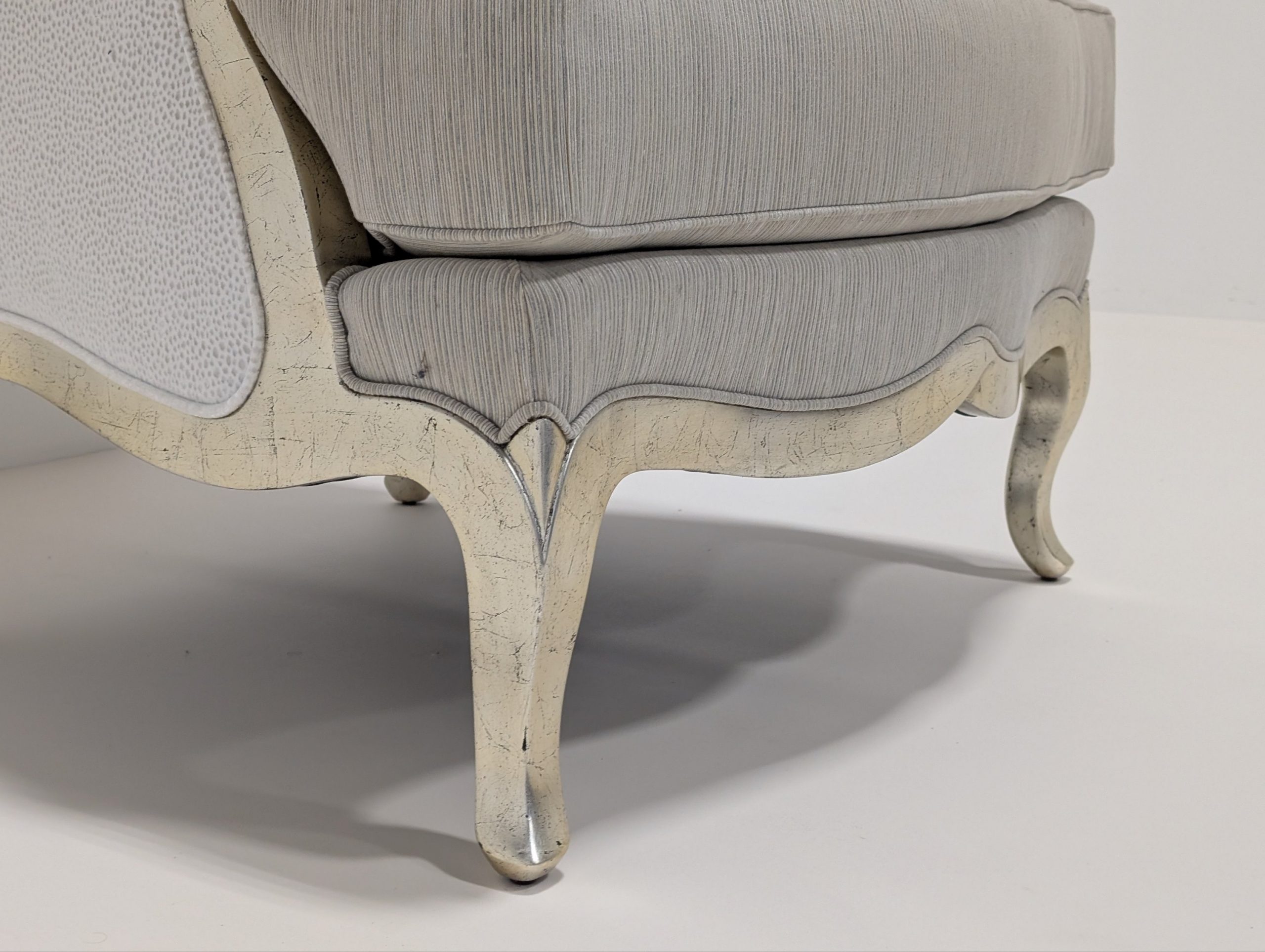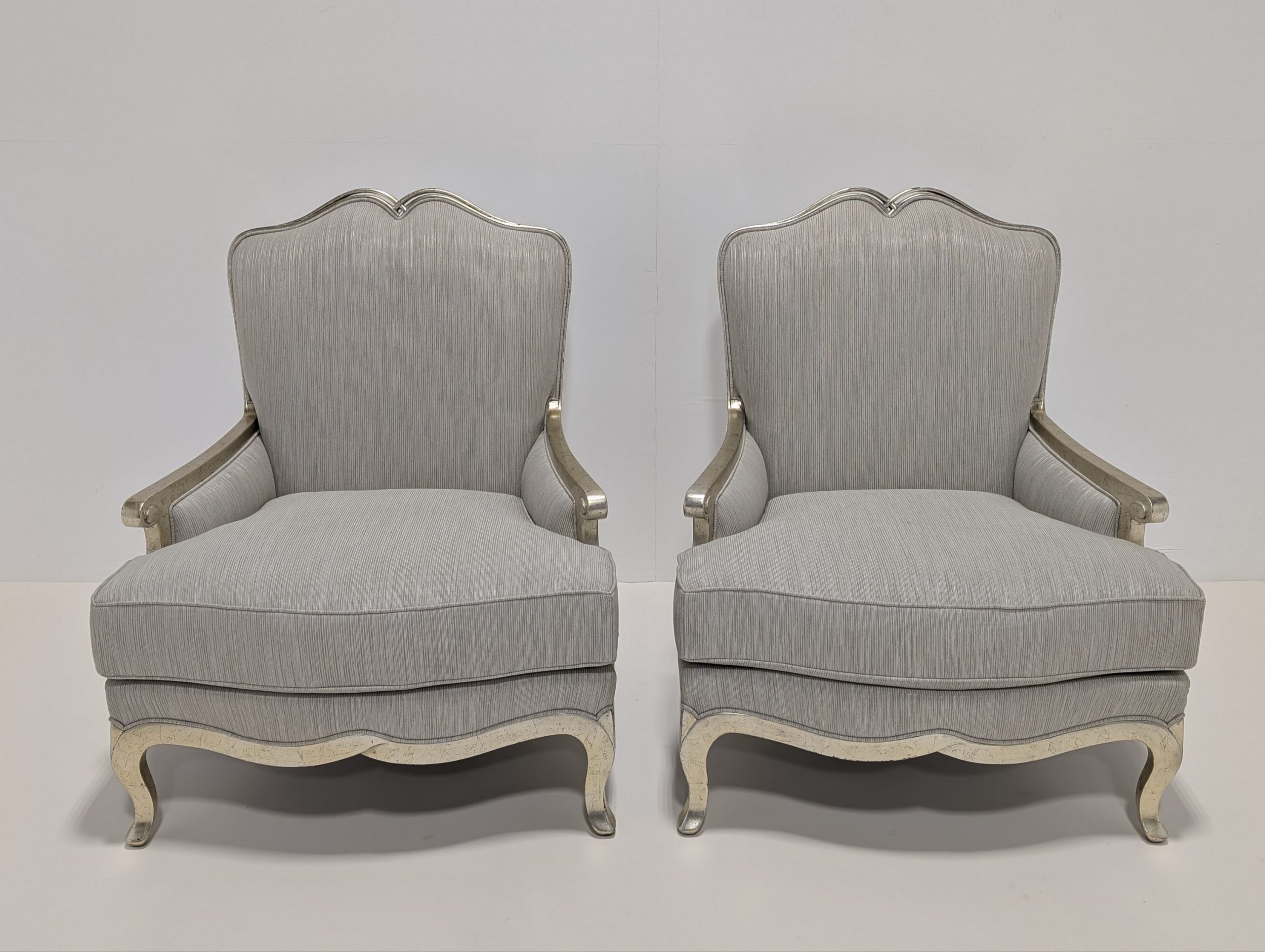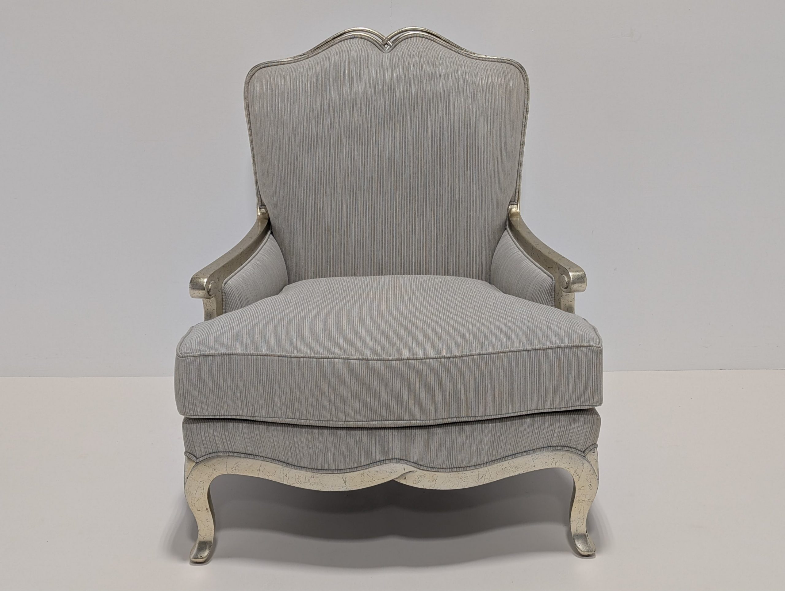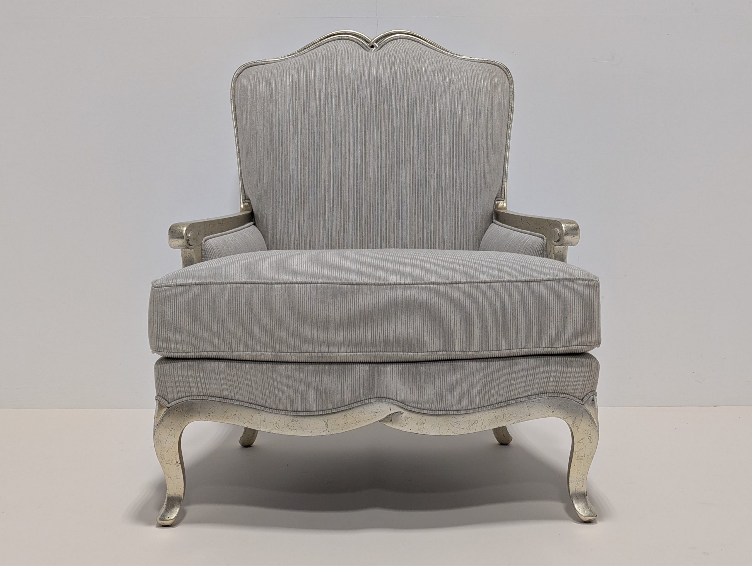 Displaying a fresh take on timeless elegance, these Christopher Guy lounge chairs feature open arms with graceful scroll detailing, a signature love heart-shaped backrest, and a sculptural bow-shaped base. Crafted from solid mahogany and finished in a striking Black Sea Silver Leaf, this design blends classic charm with a modern edge, embodying the brand’s signature sophistication.