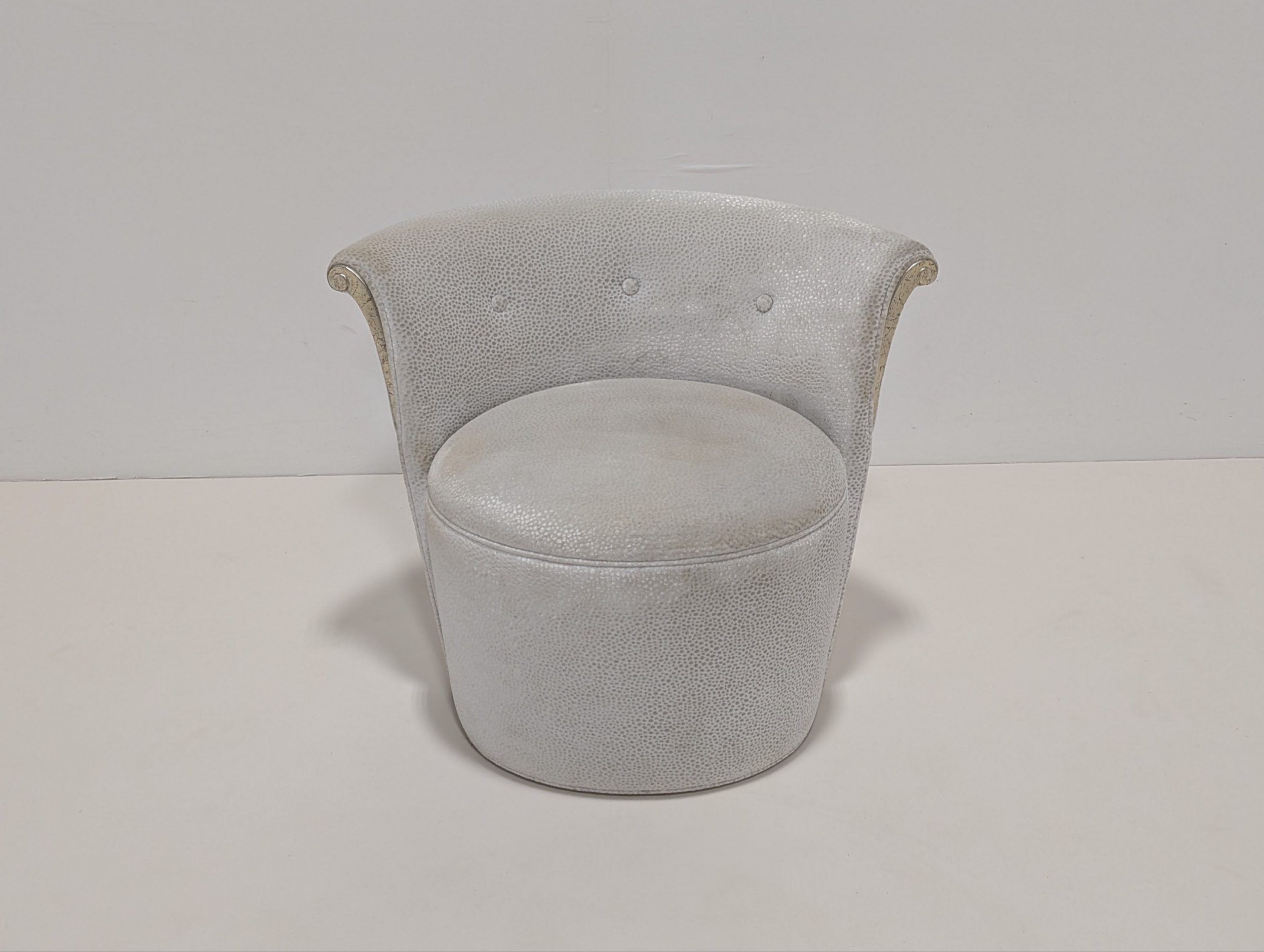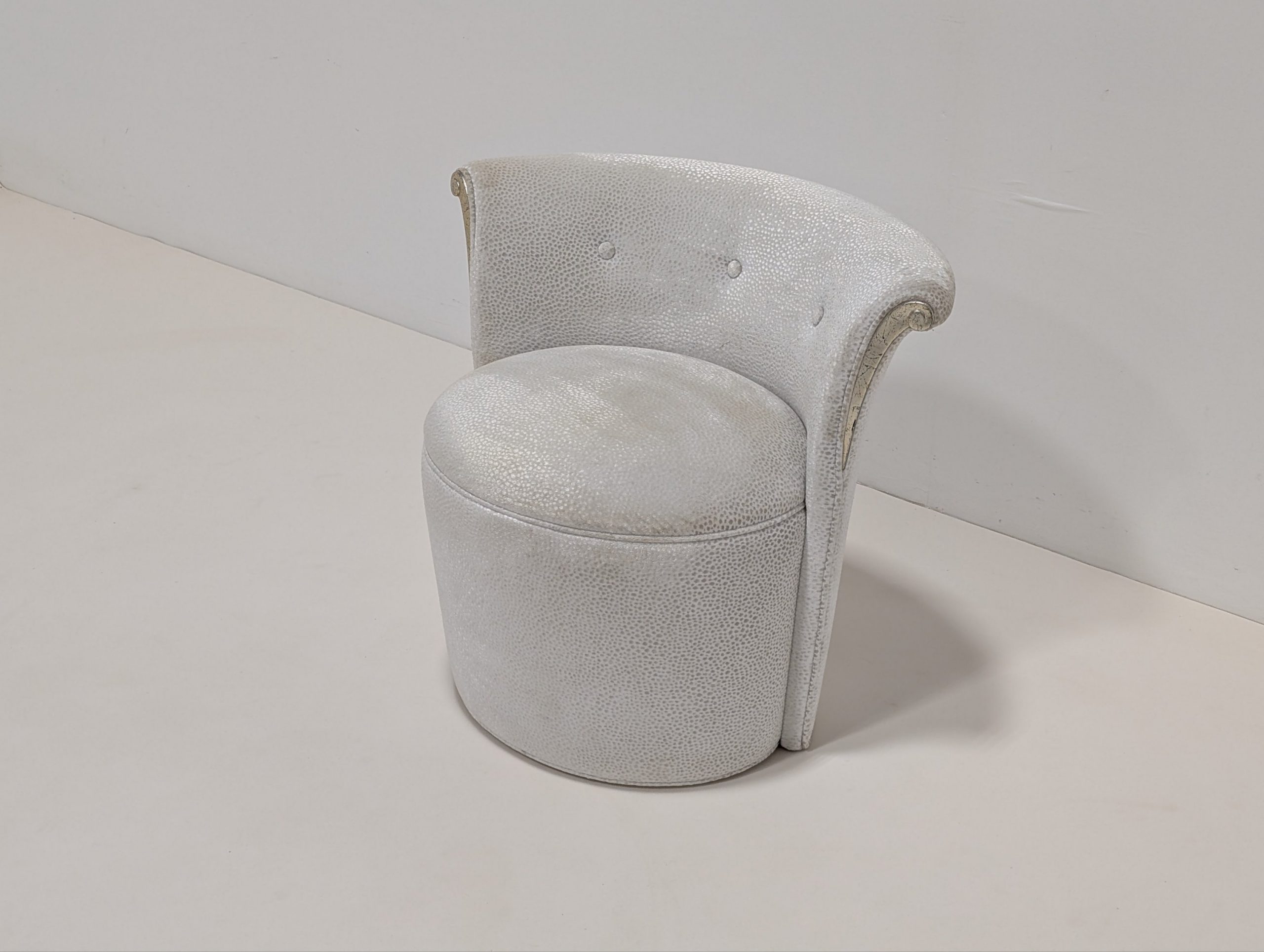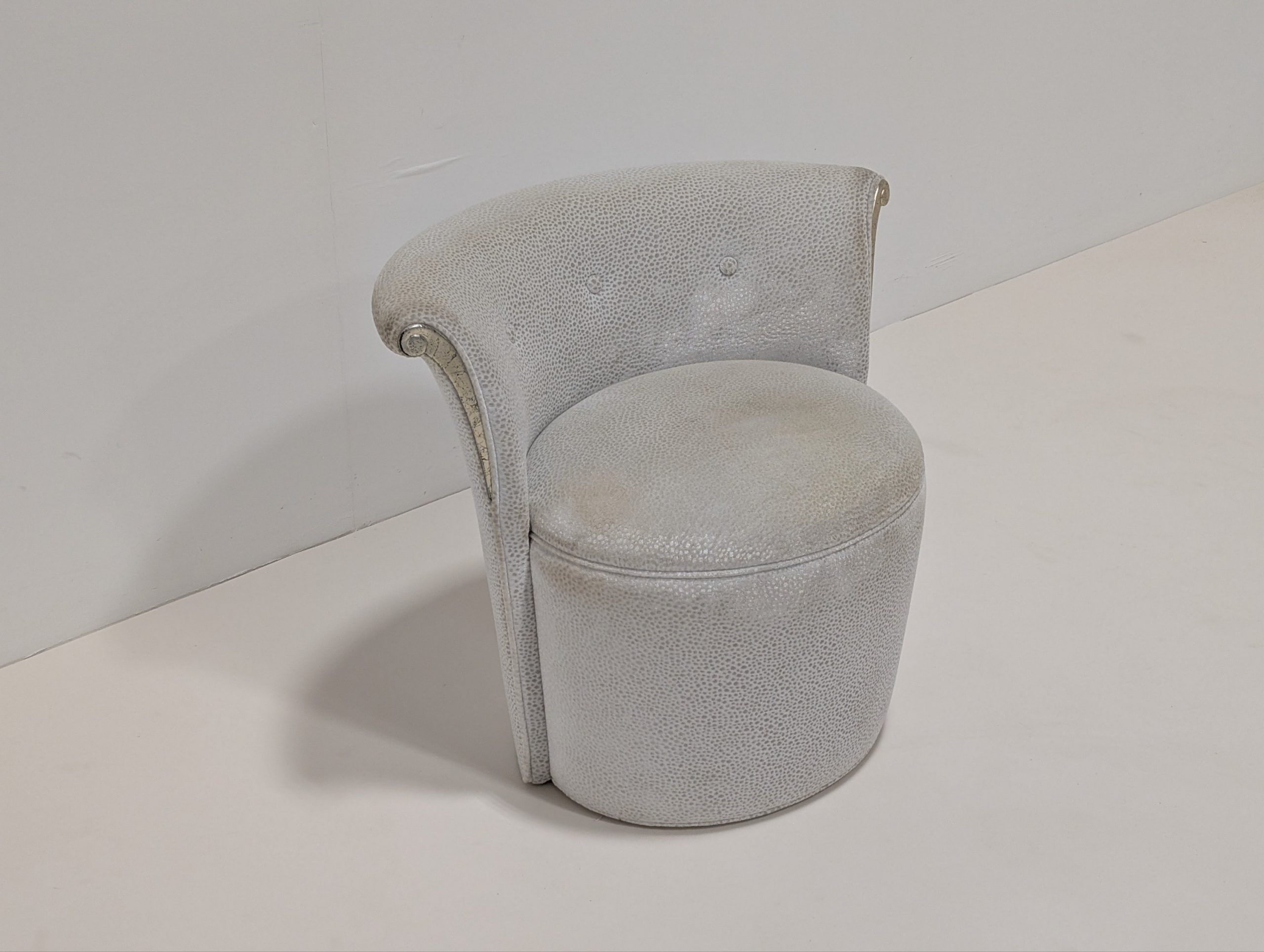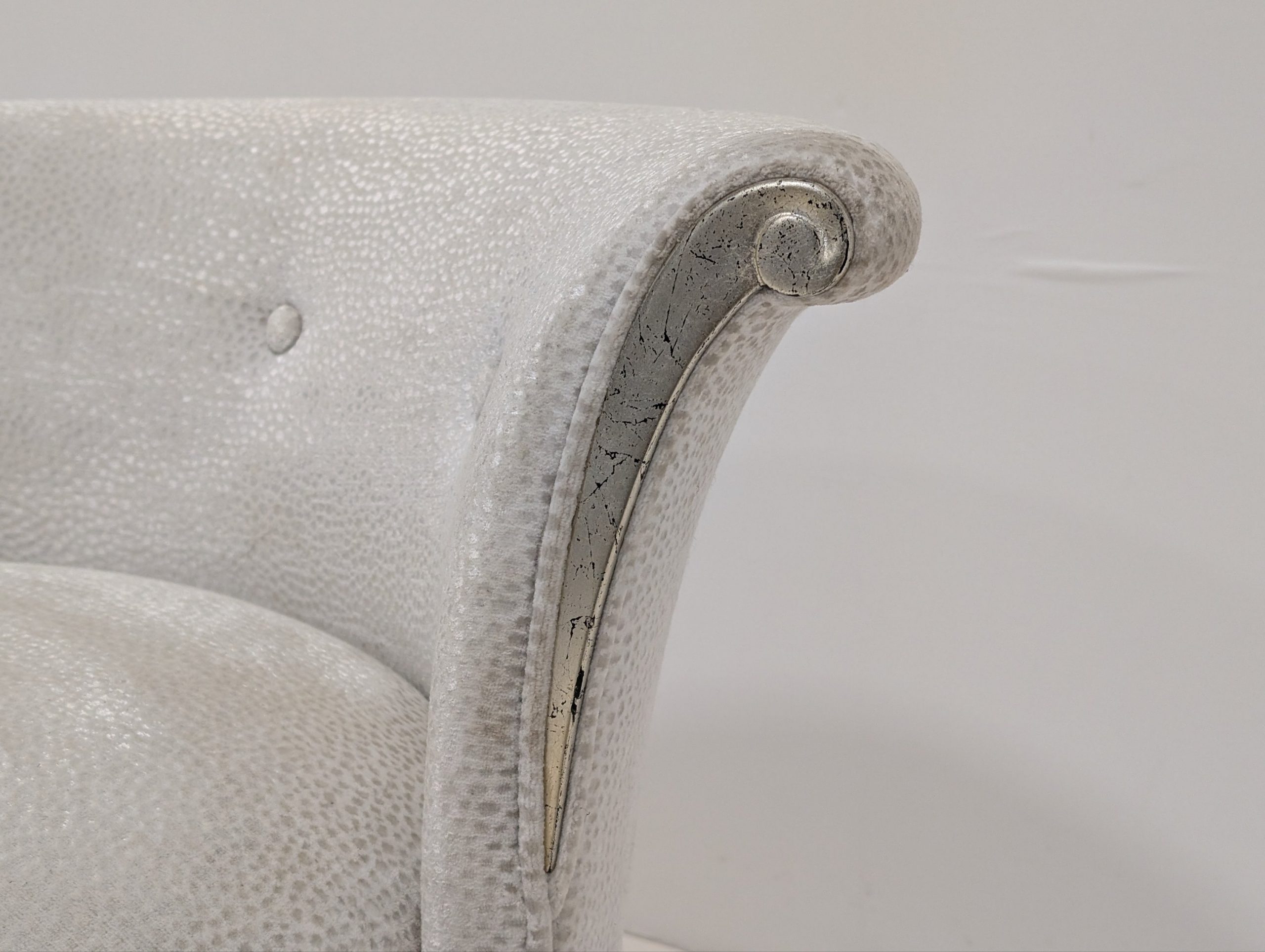 This elegant low-back pouf with subtle tufting and delicate silver leaf.carving adds a touch of femininity to any room.