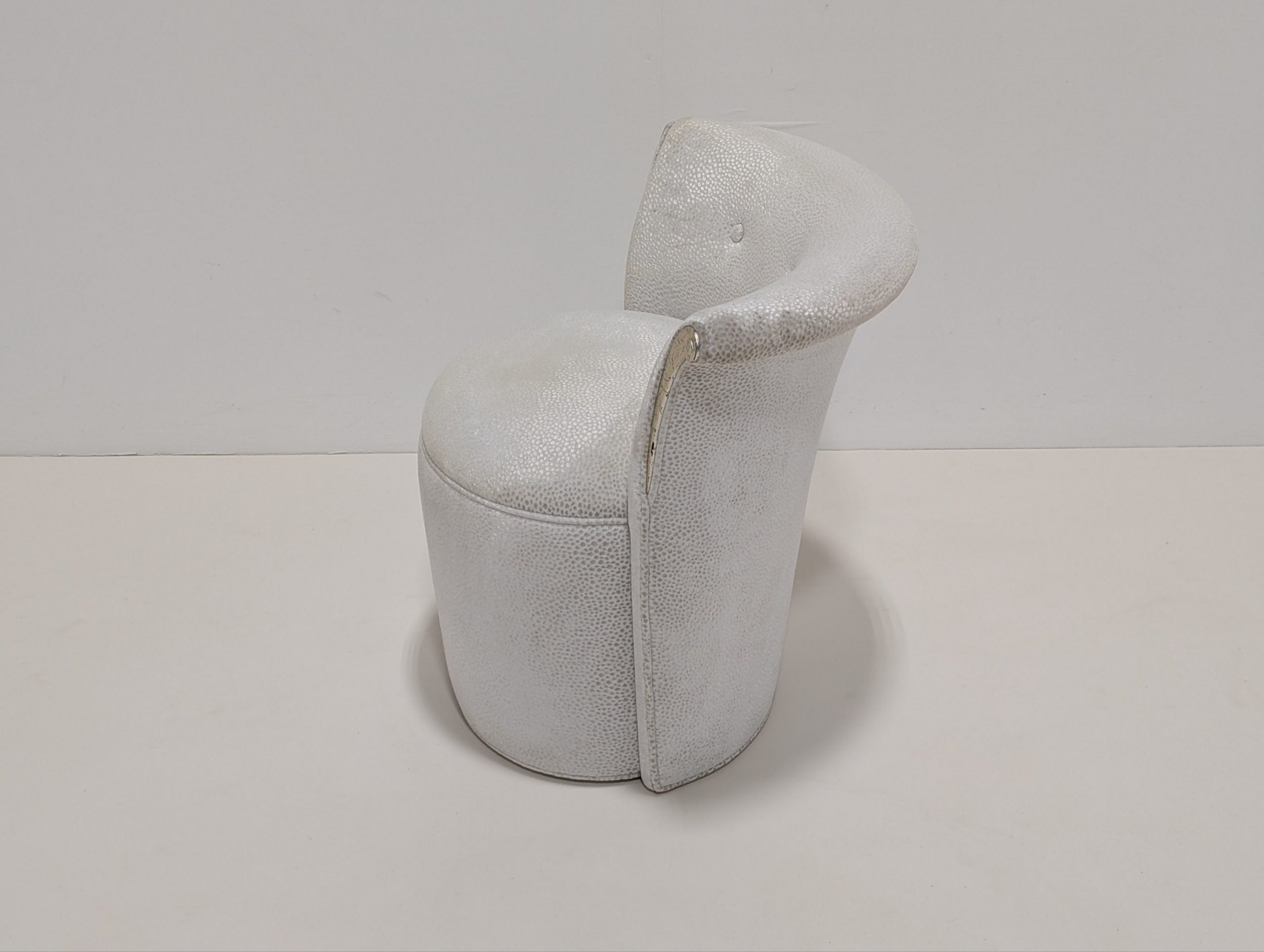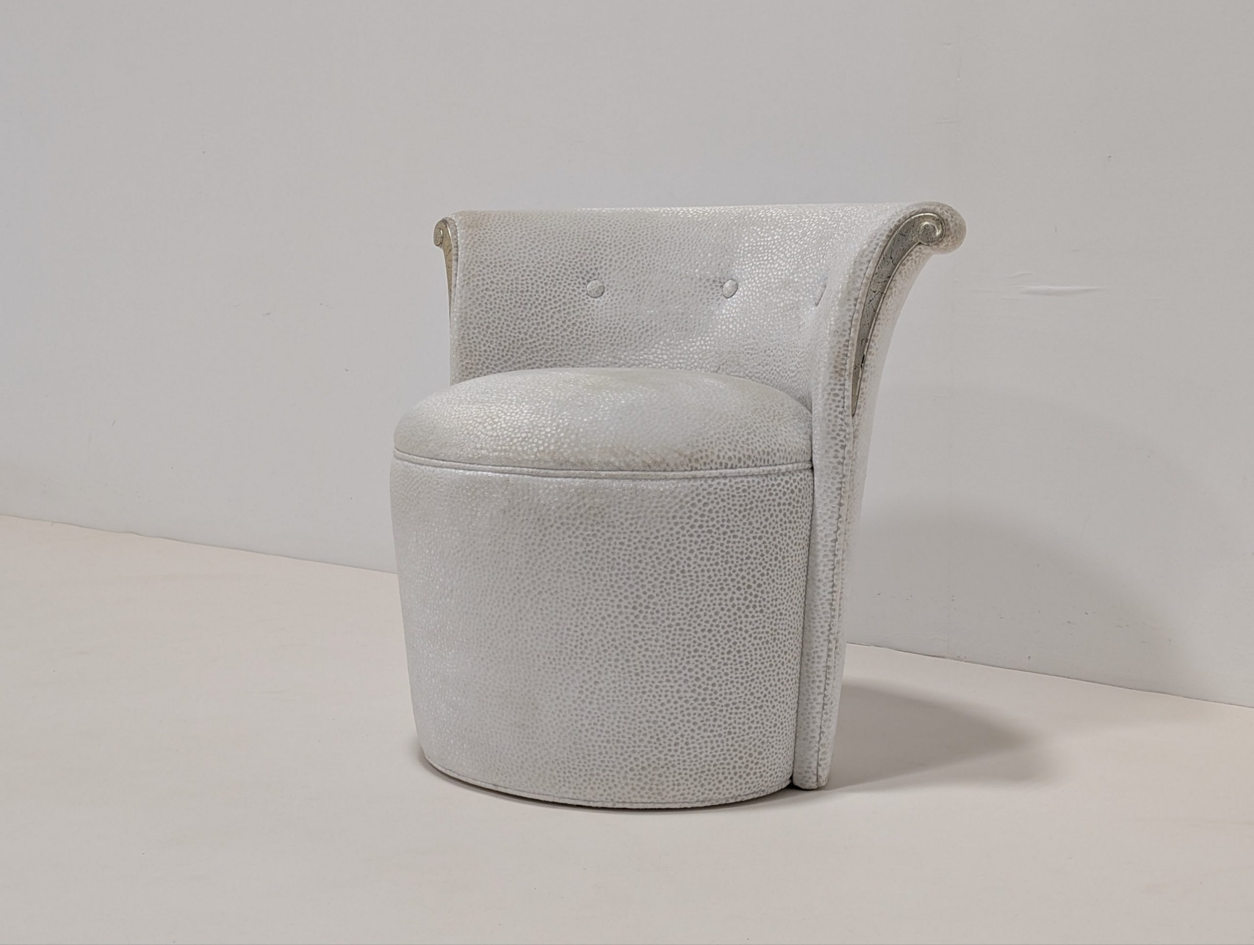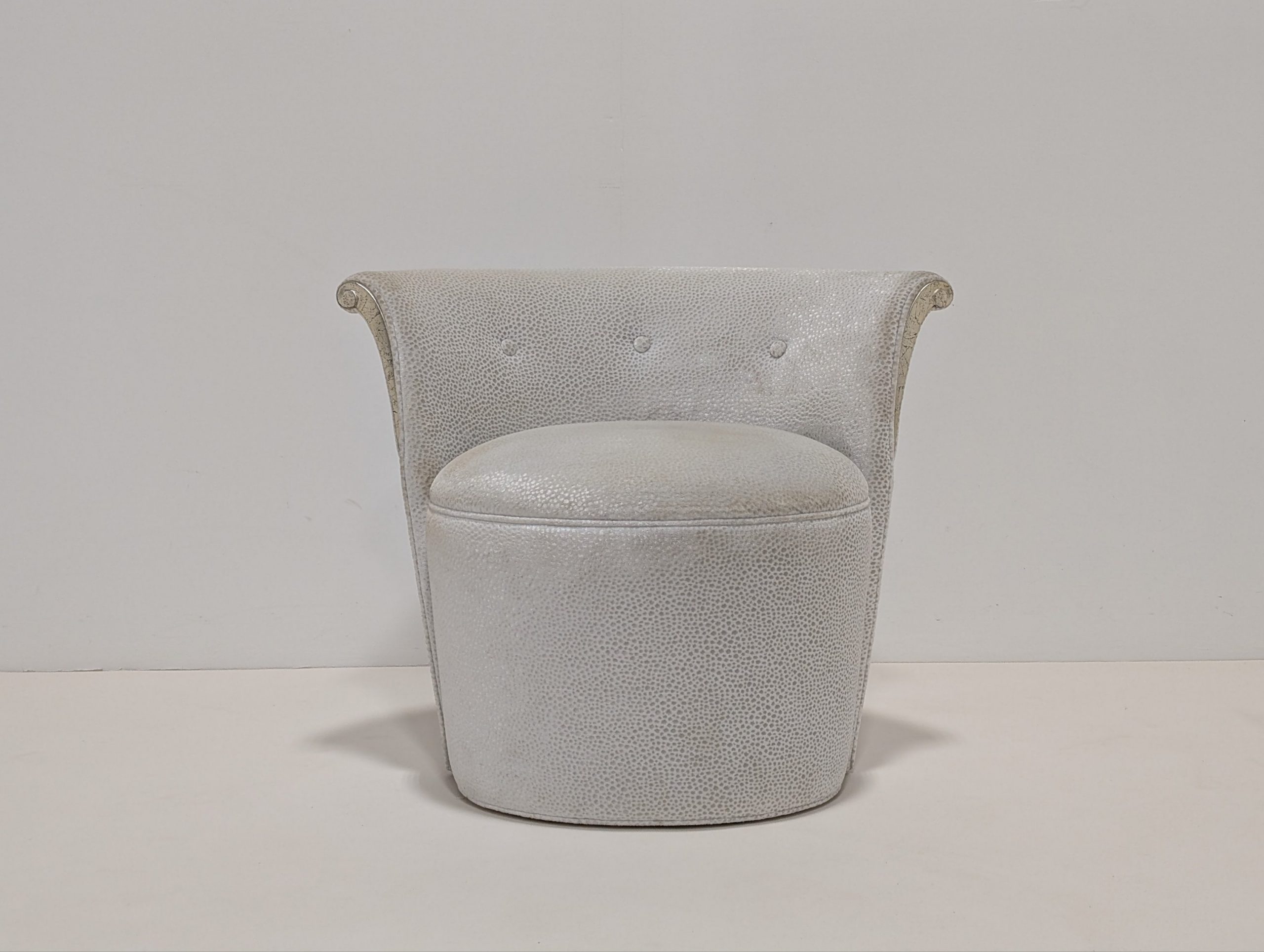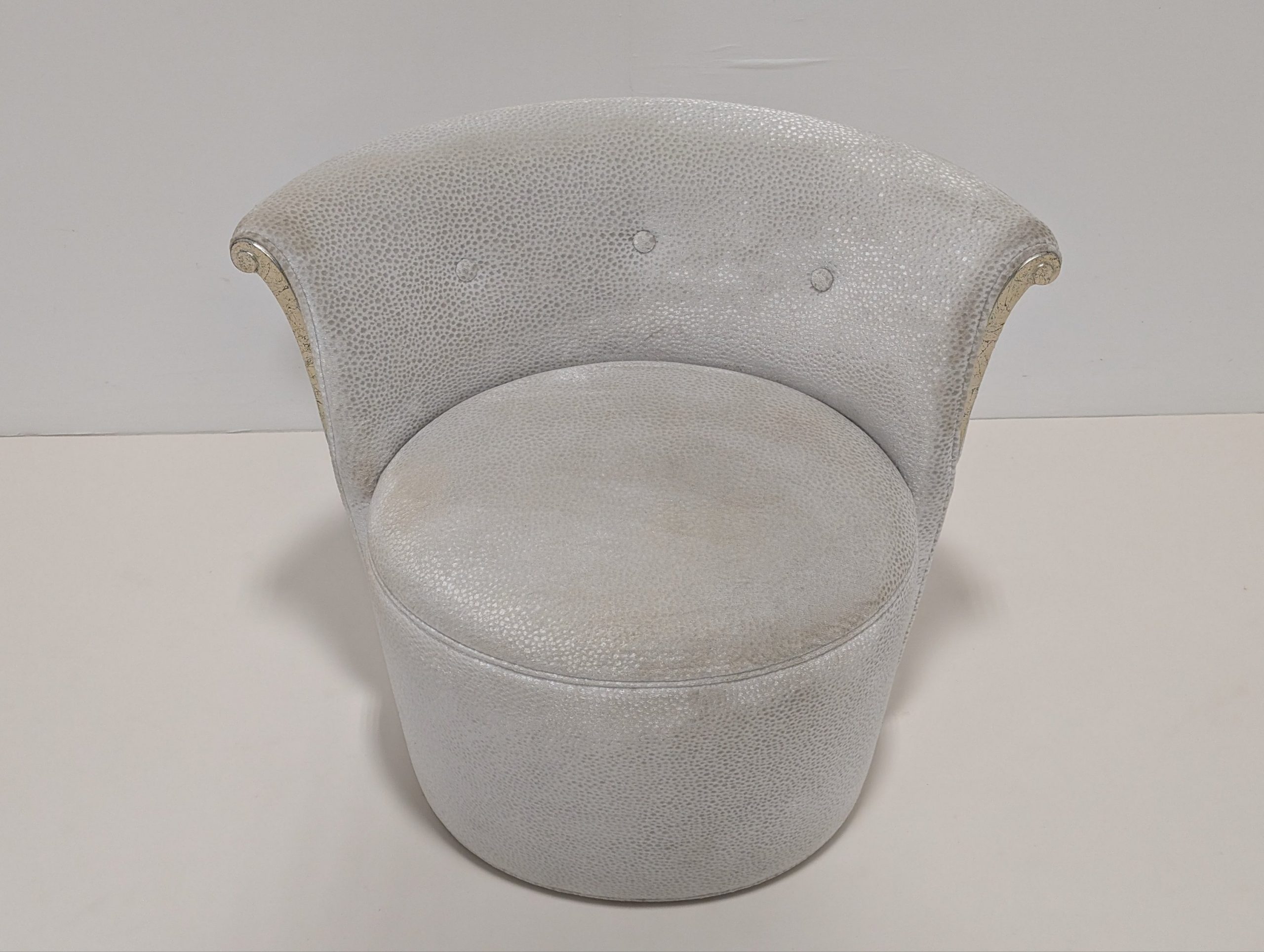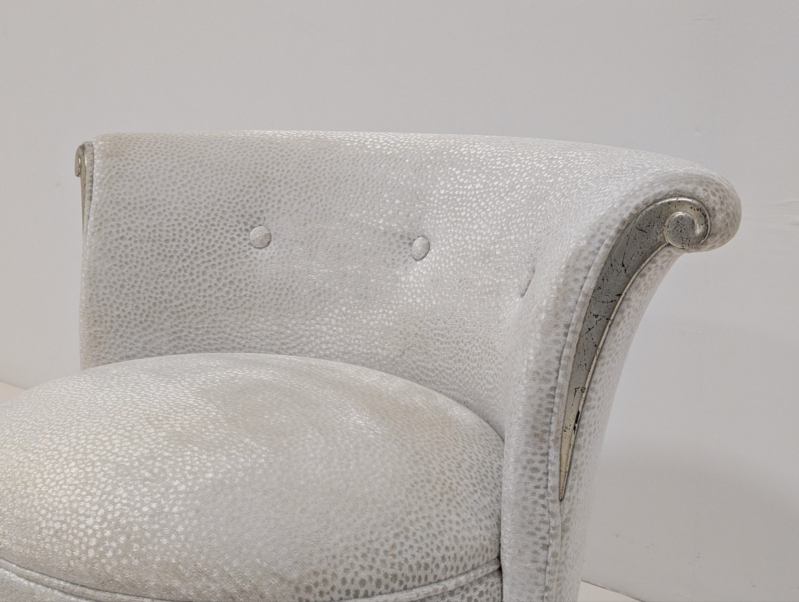 This elegant low-back pouf with subtle tufting and delicate silver leaf.carving adds a touch of femininity to any room.
