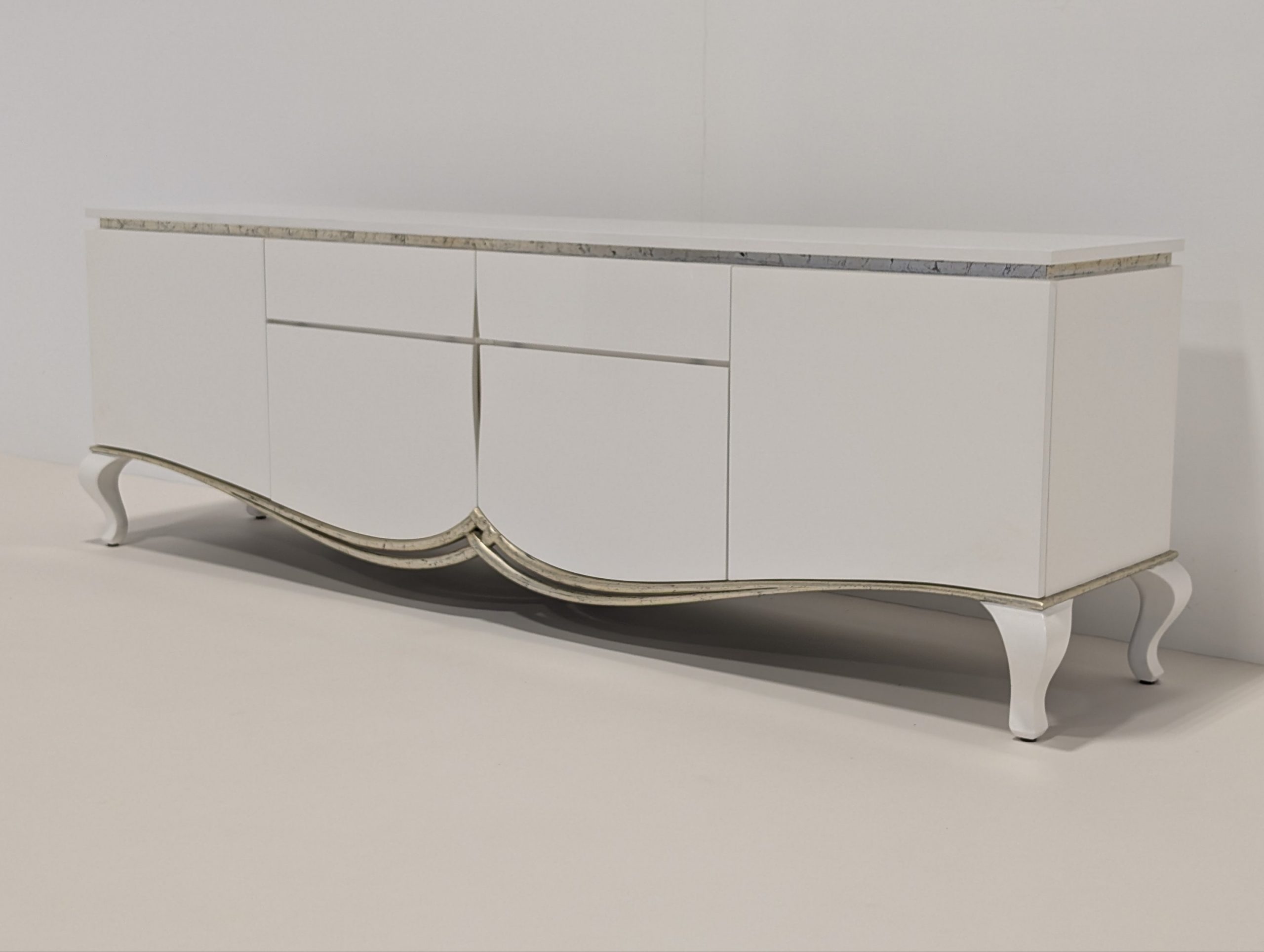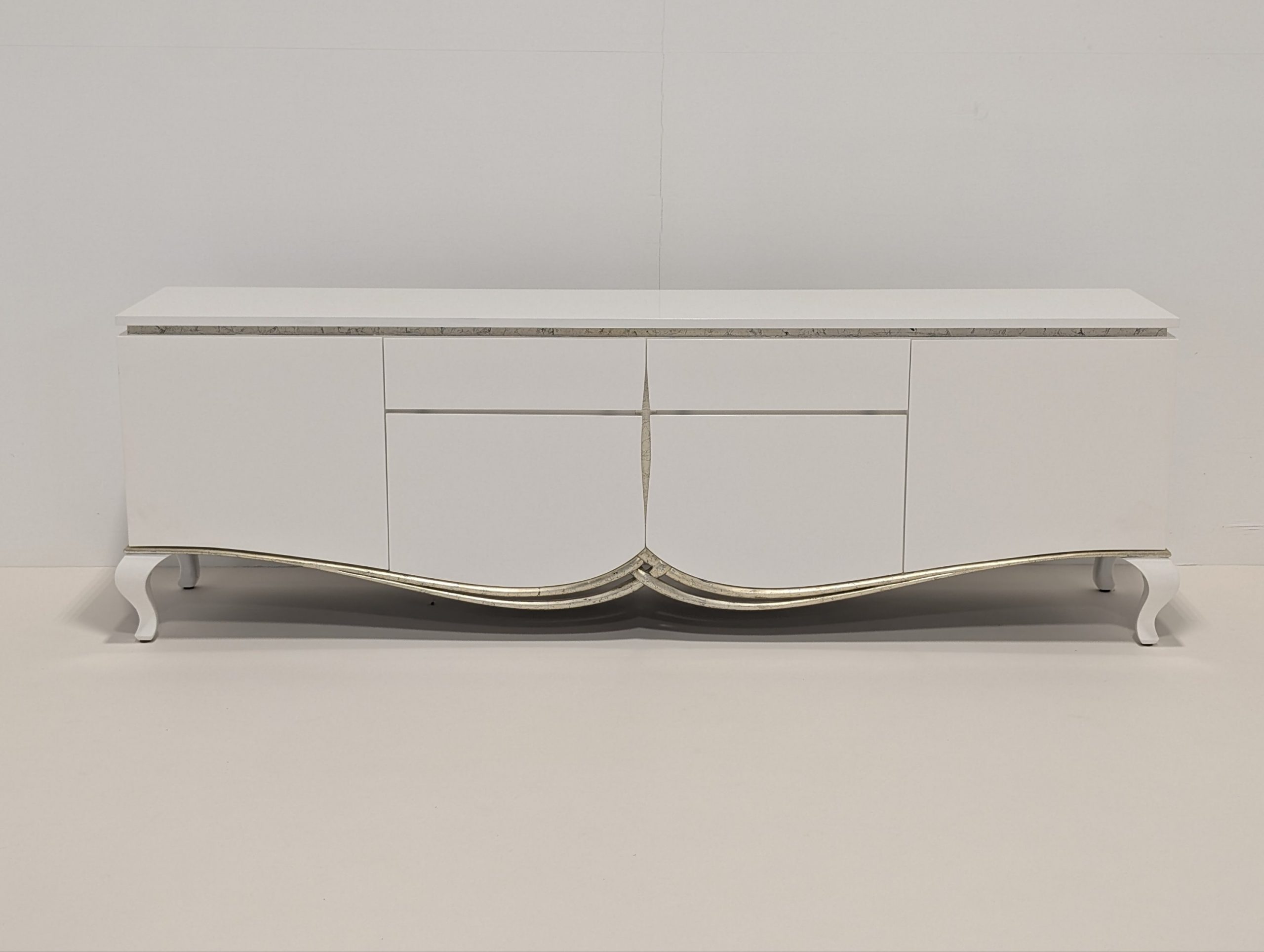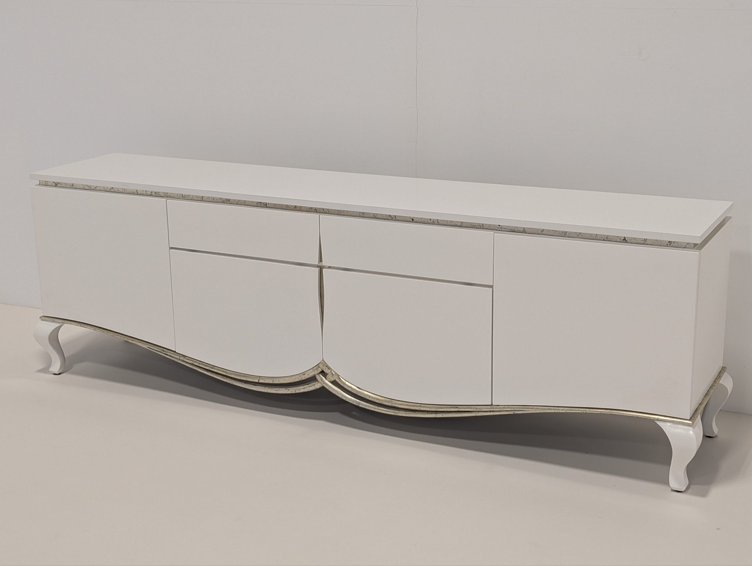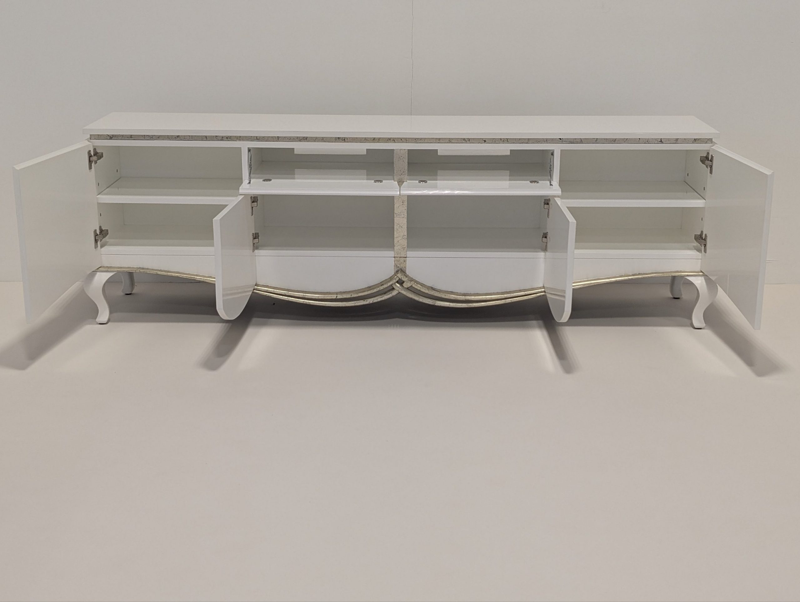 An elegant solution with smart metal finish tipped feet to hide all those home entertainment pieces. Contains two dropdown drawers, and four cabinet doors. Custom finished trim and legs in