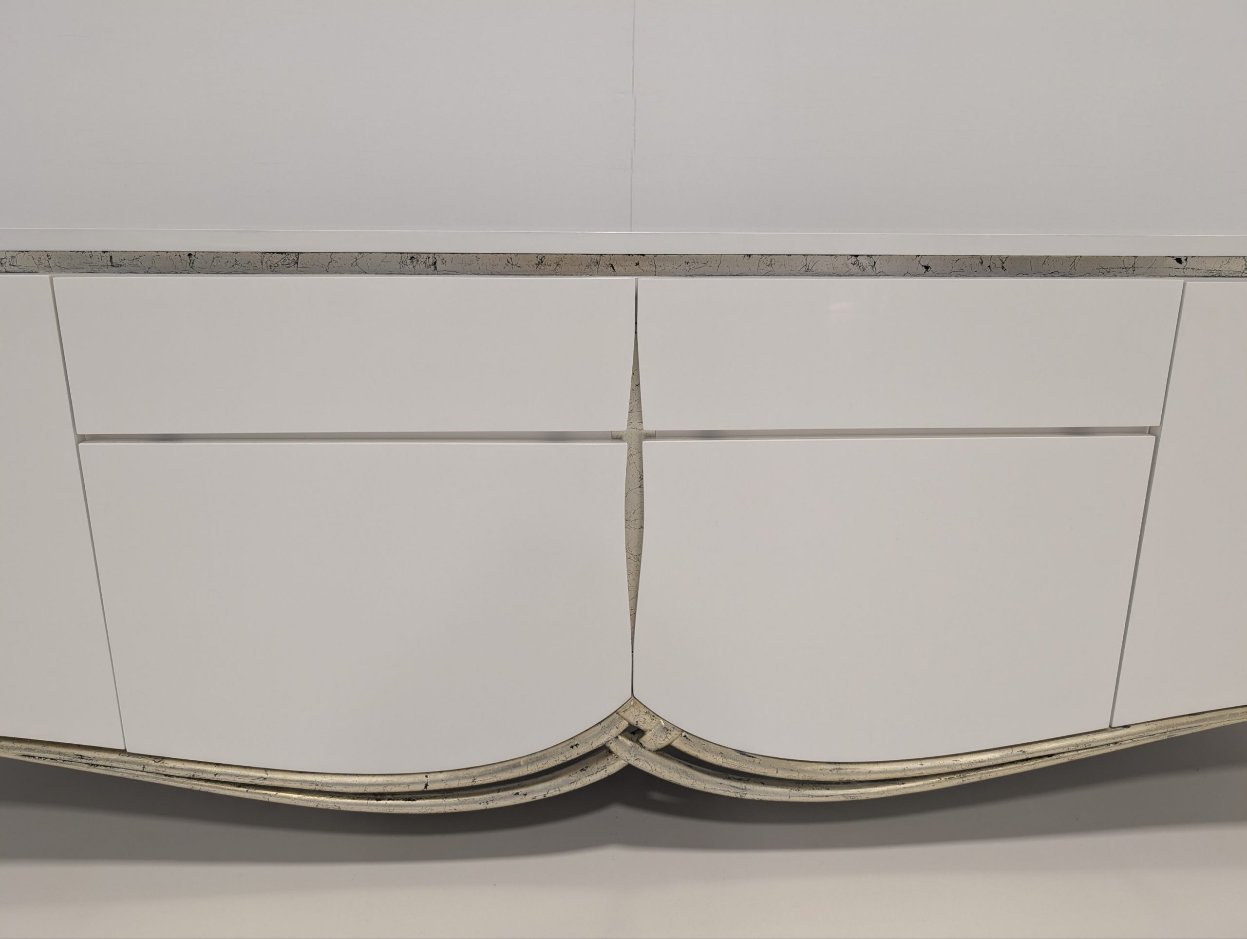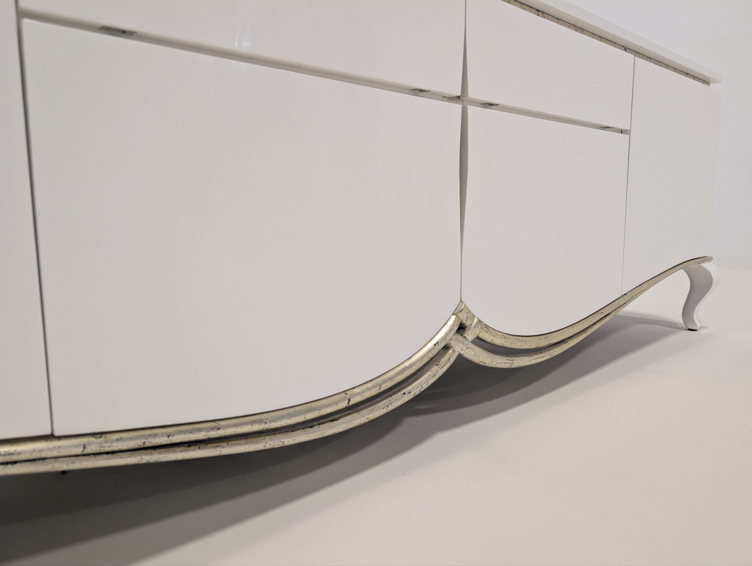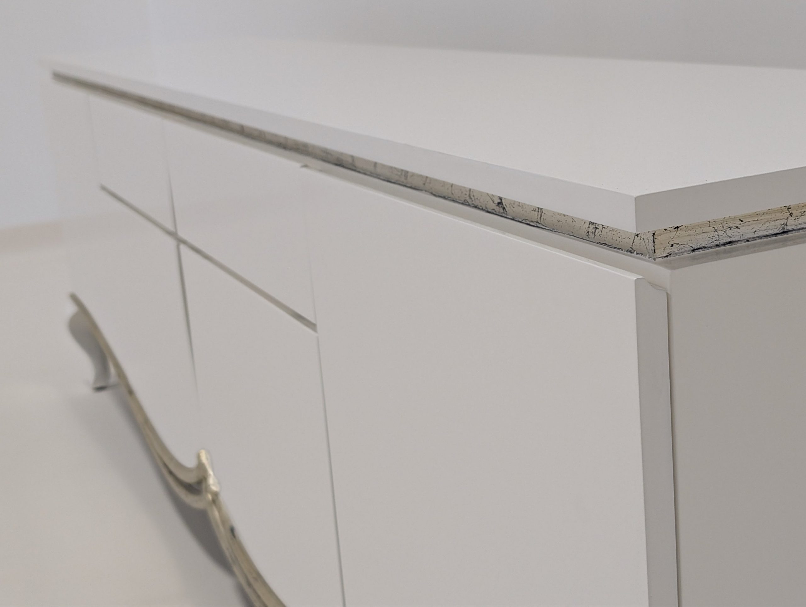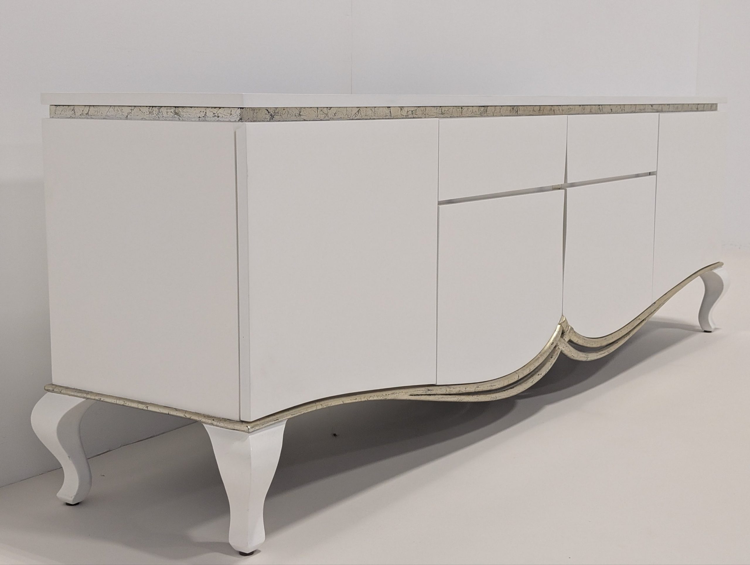 An elegant solution with smart metal finish tipped feet to hide all those home entertainment pieces. Contains two dropdown drawers, and four cabinet doors. Custom finished trim and legs in