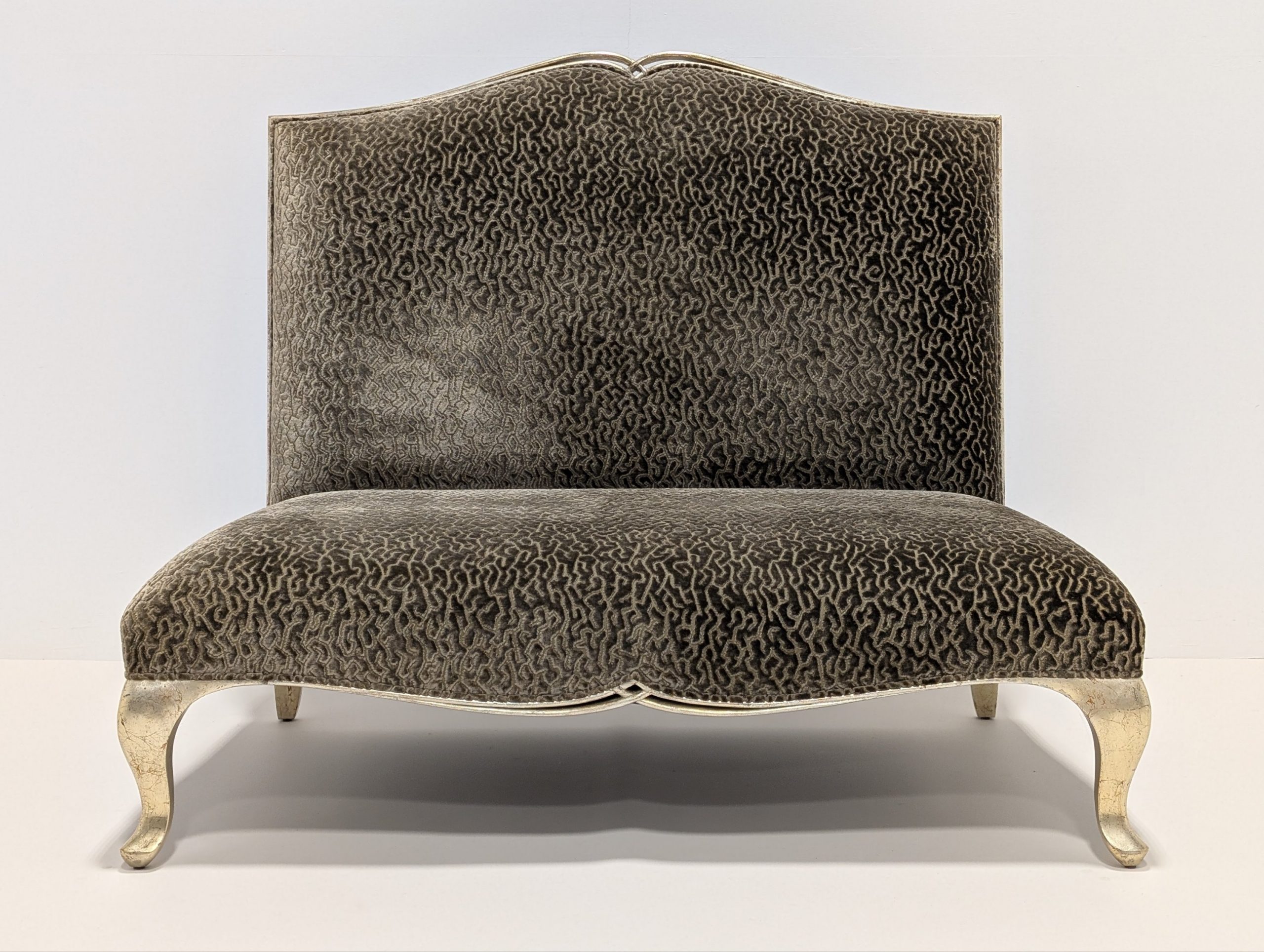 High backed love chair upholstered in patterned chenille fabric from Le-Lievre in Paris and in Italian silver finish.