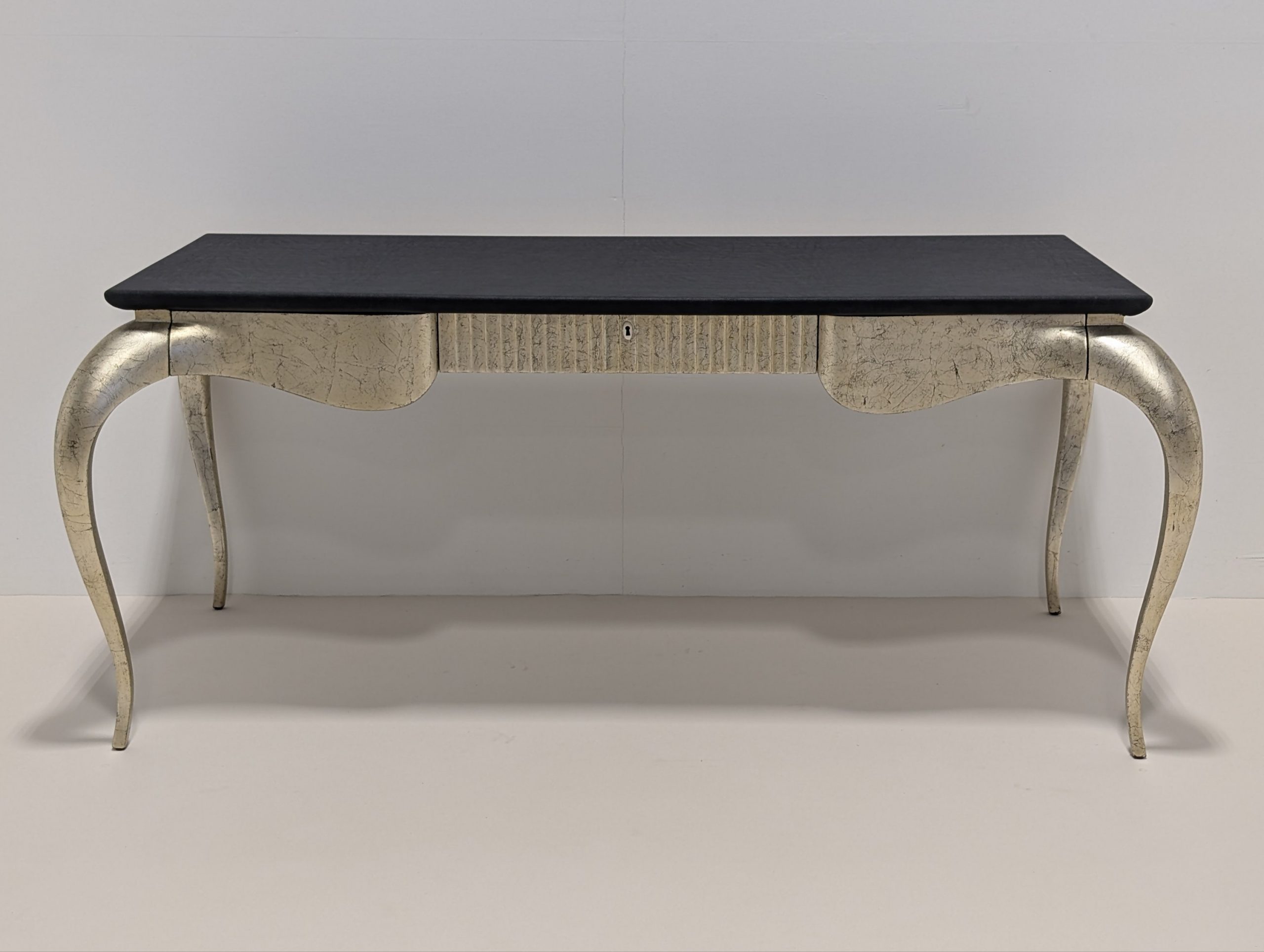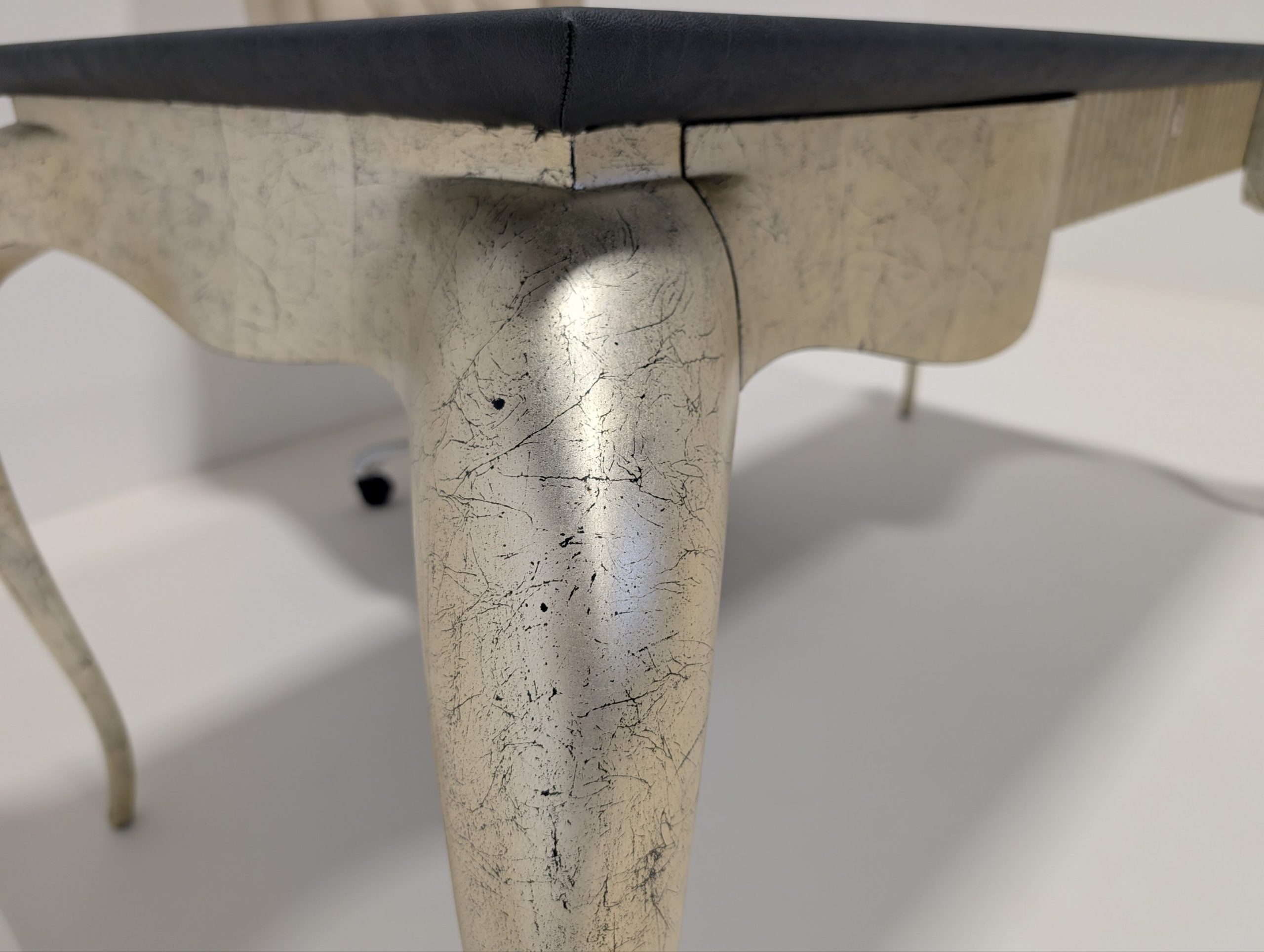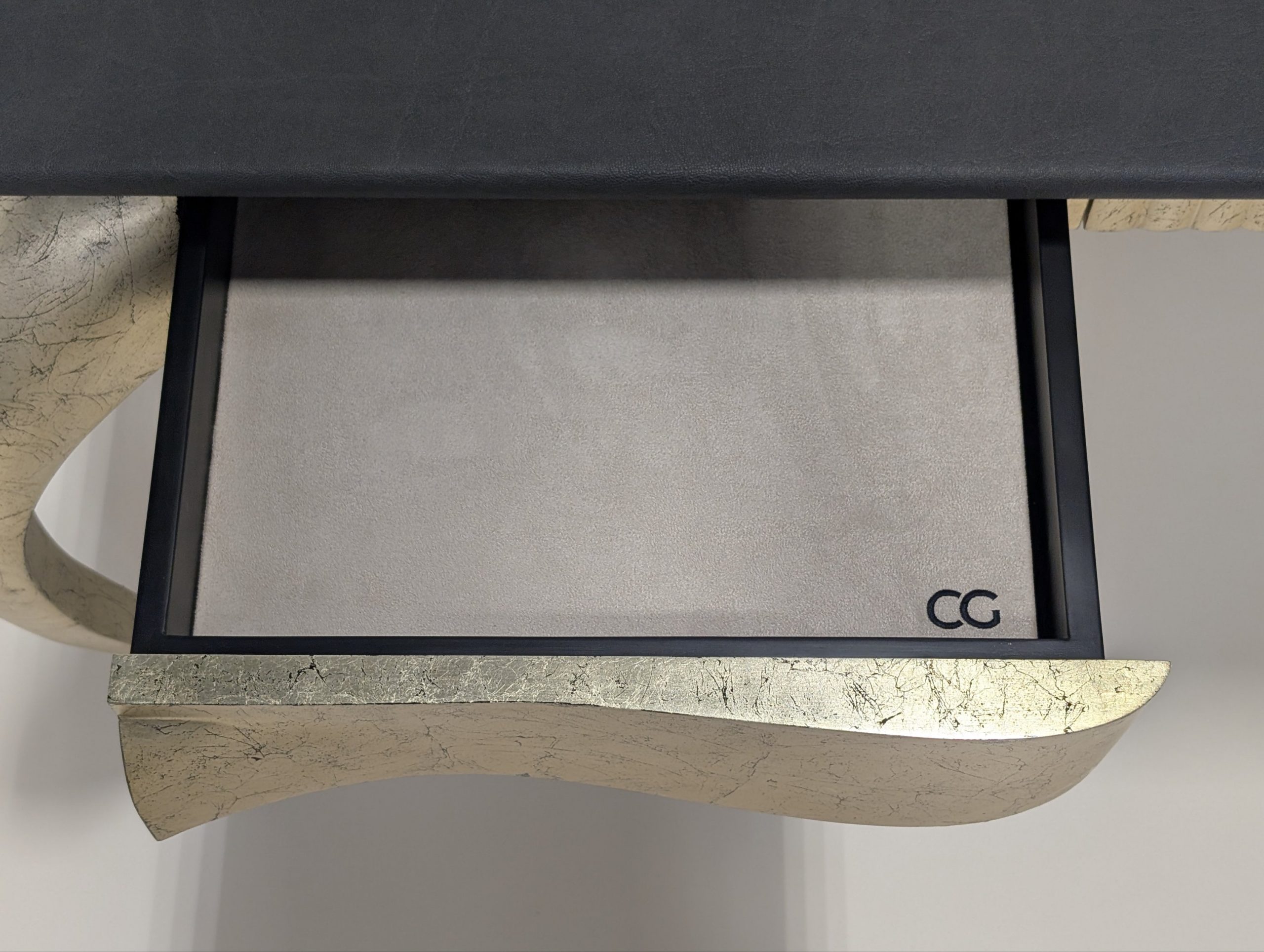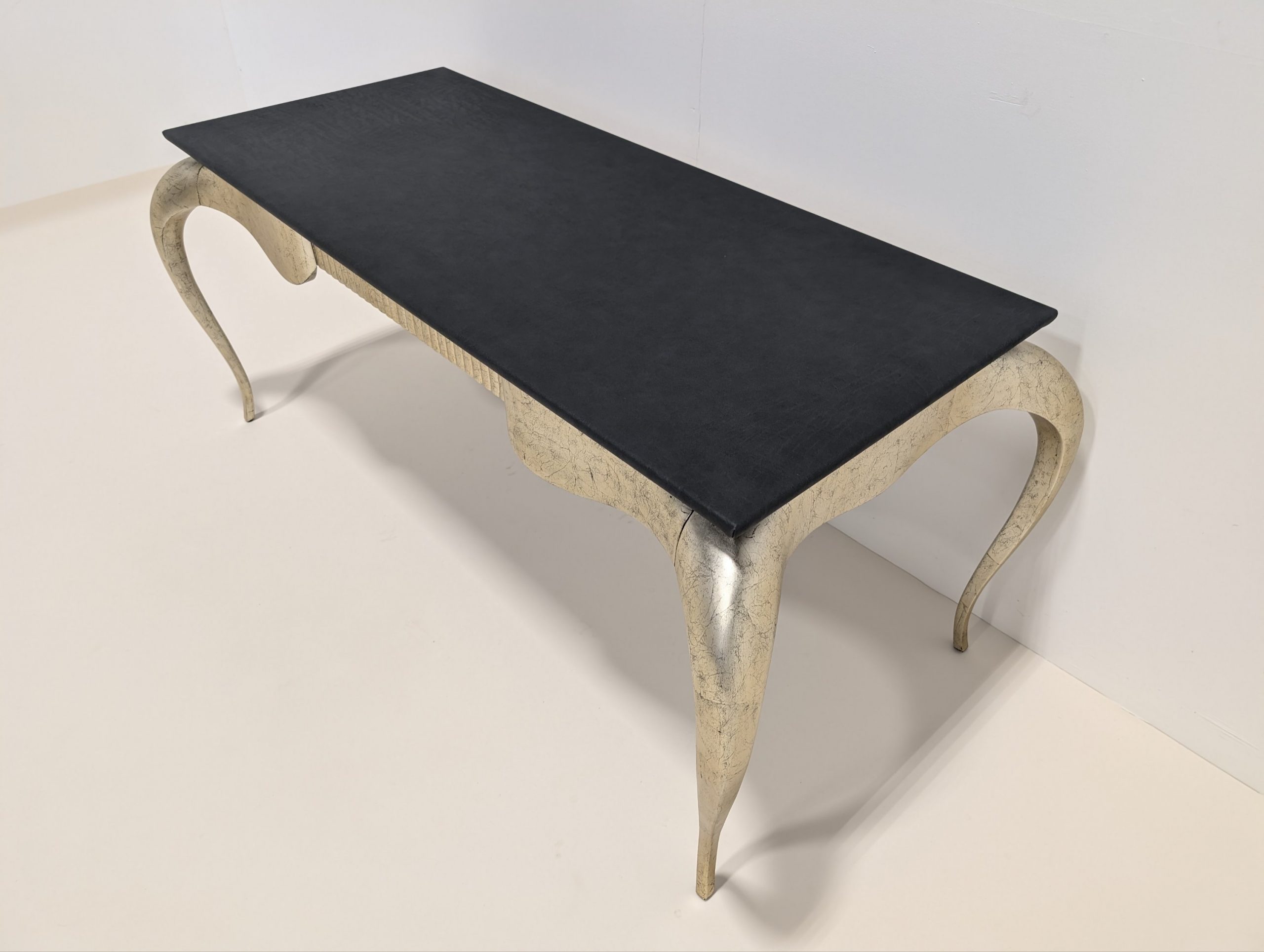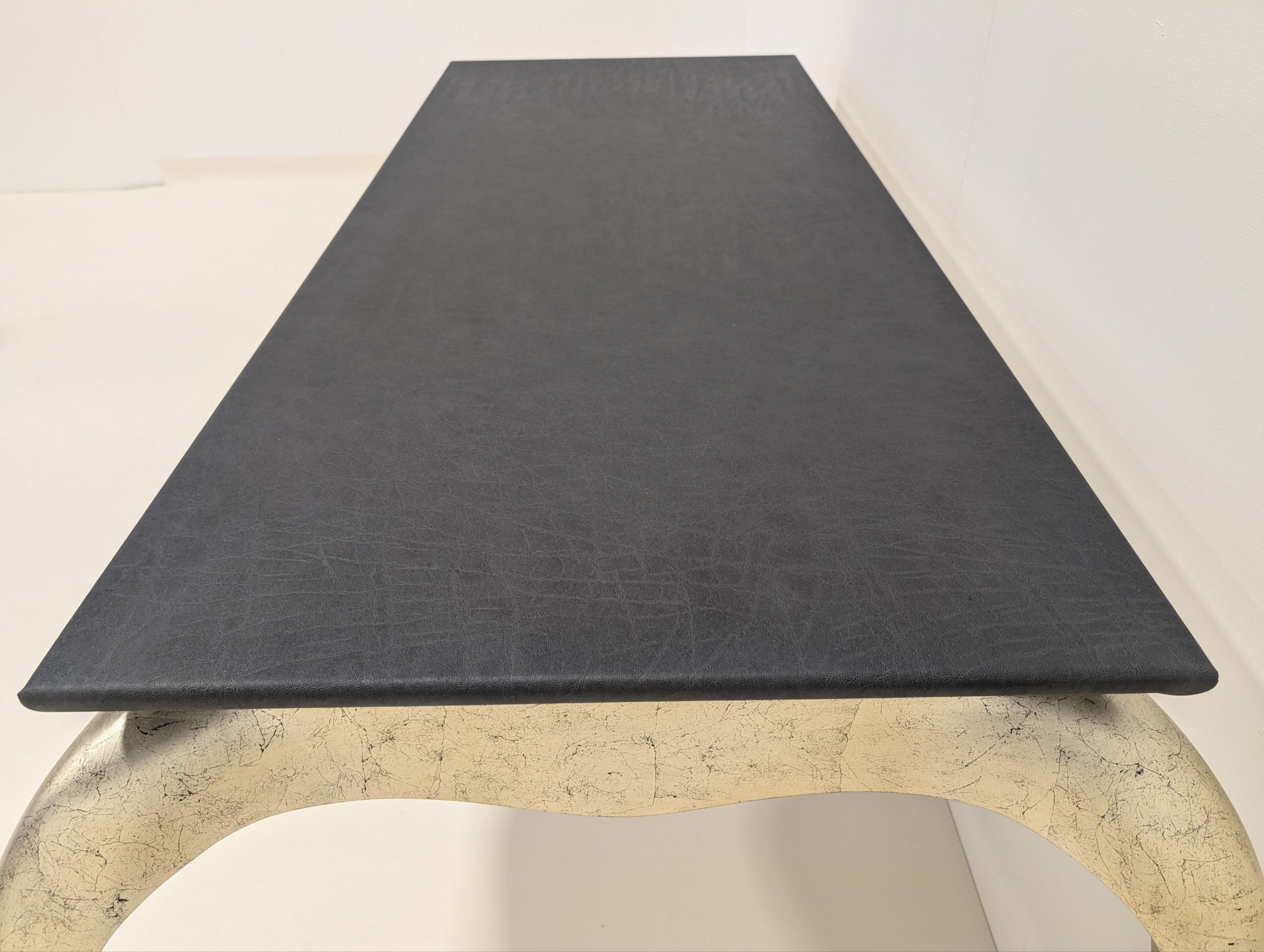 Finished in black sea silver leaf and top upholstered in grey Iguana leather.