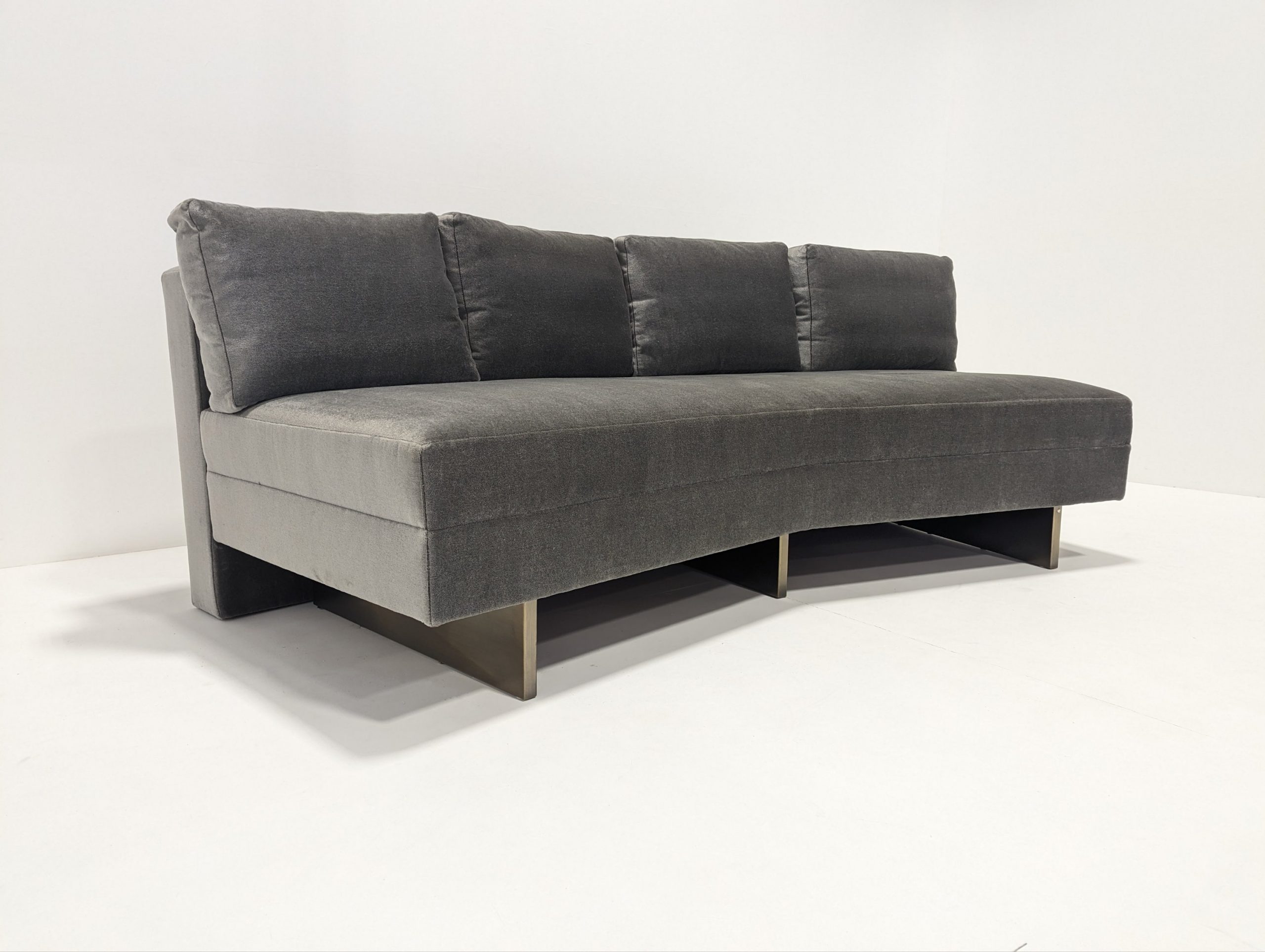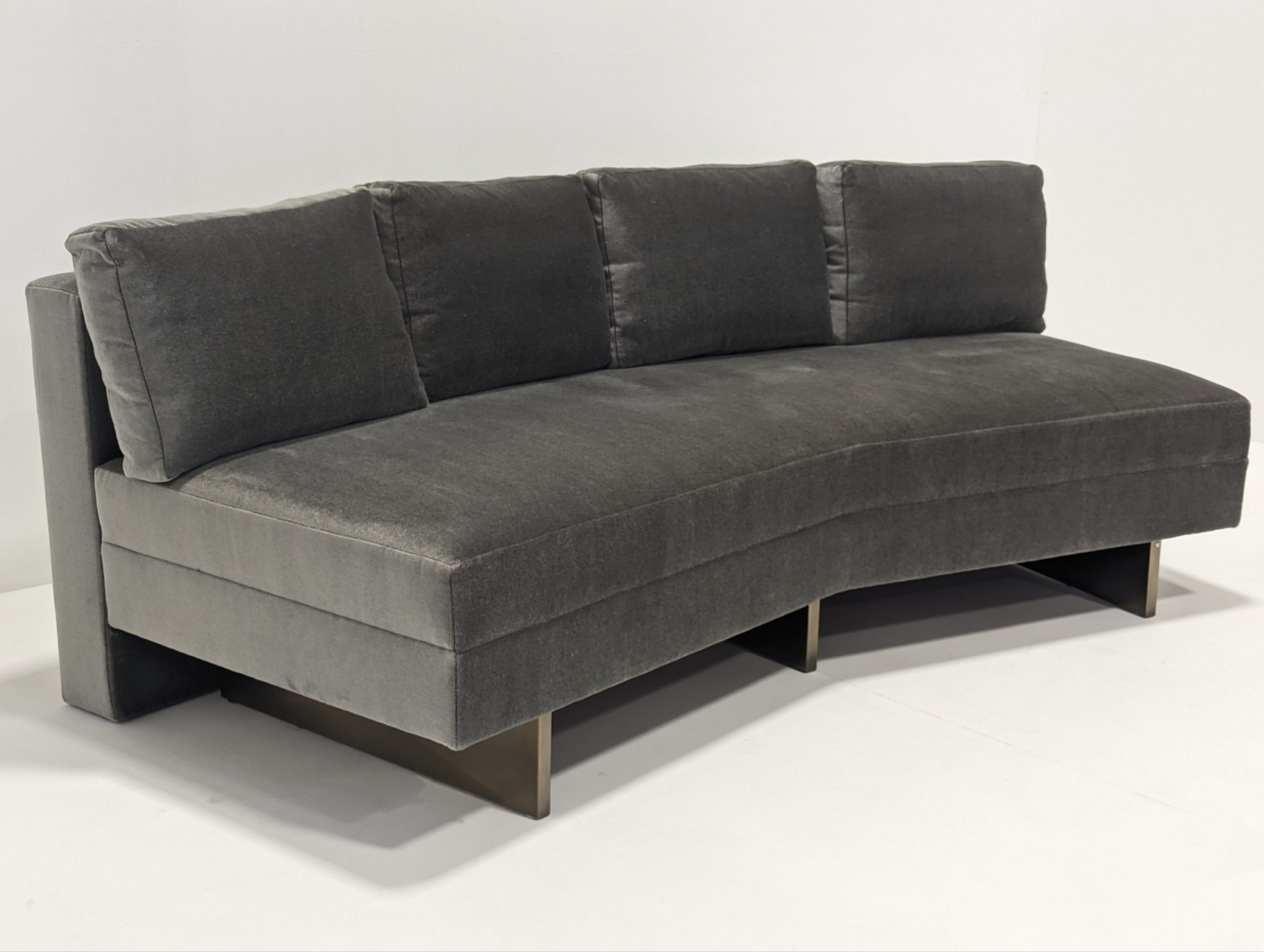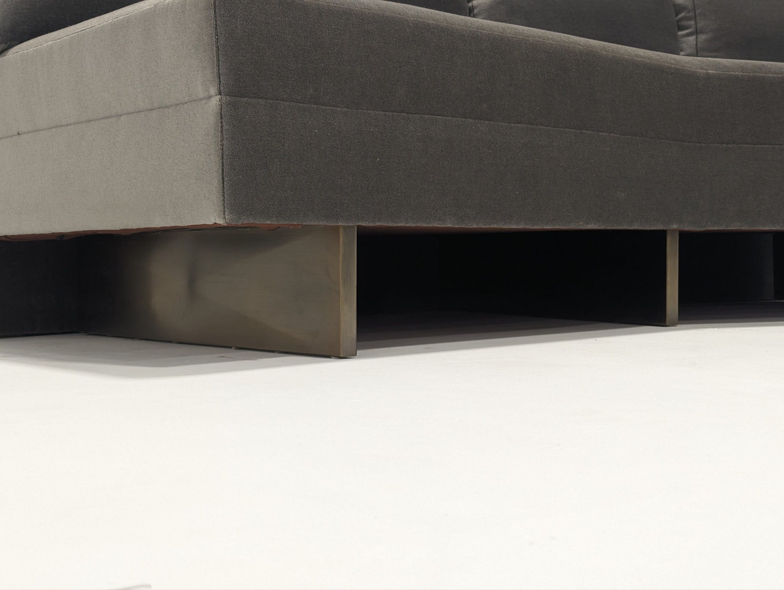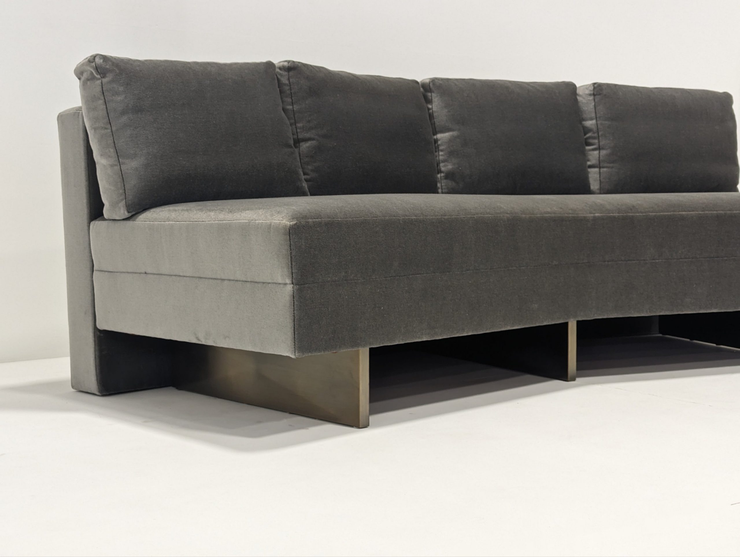 Bray Design Upholstery is known throughout the industry for quality comfort & service. This deep grey velvet sectional sofa can be separated or as one. The back cushions are feather filled and loose but firm. Held up with heavy antique polished brass metal feet, this sofa is both stylish and comfortable.