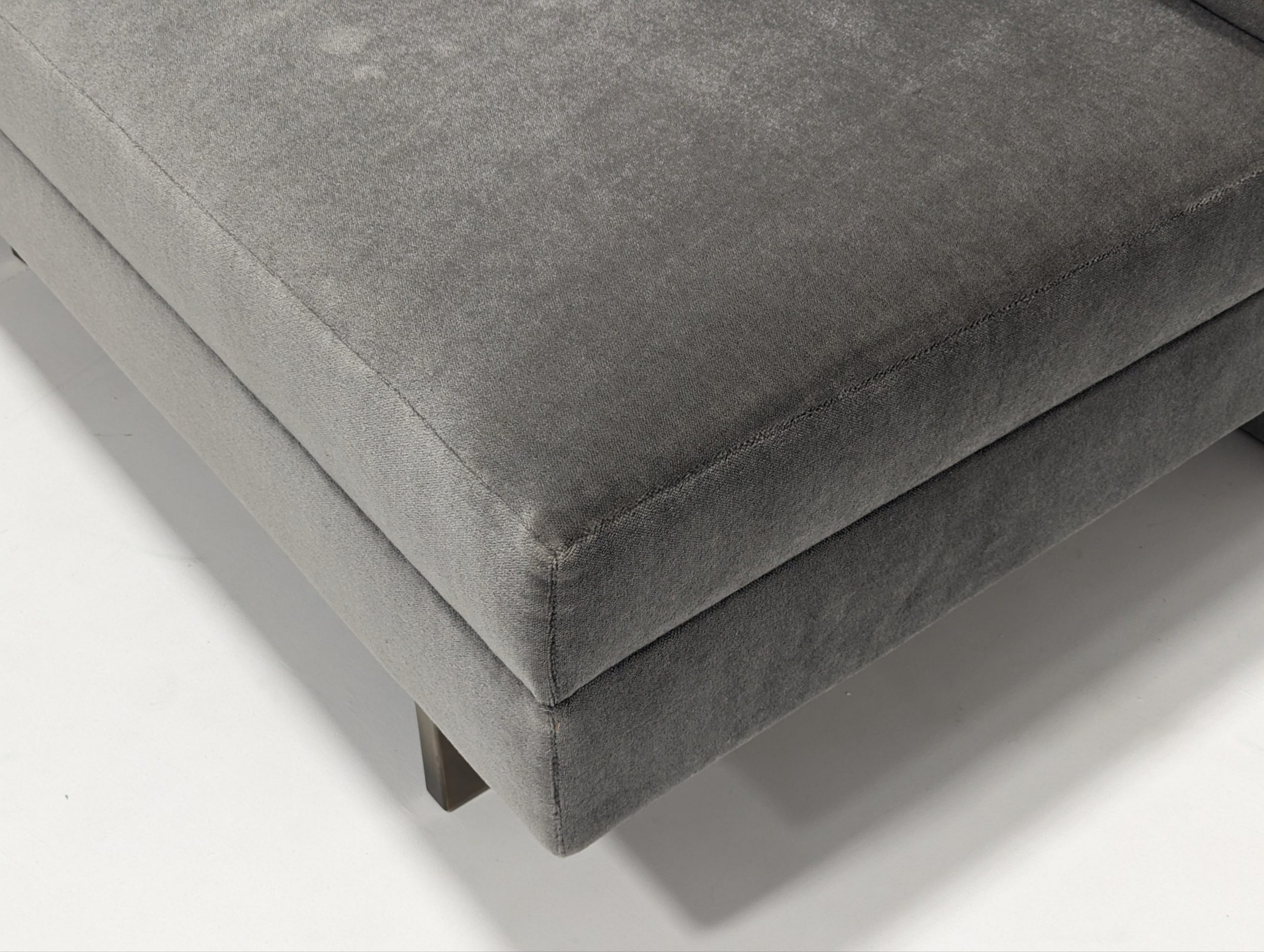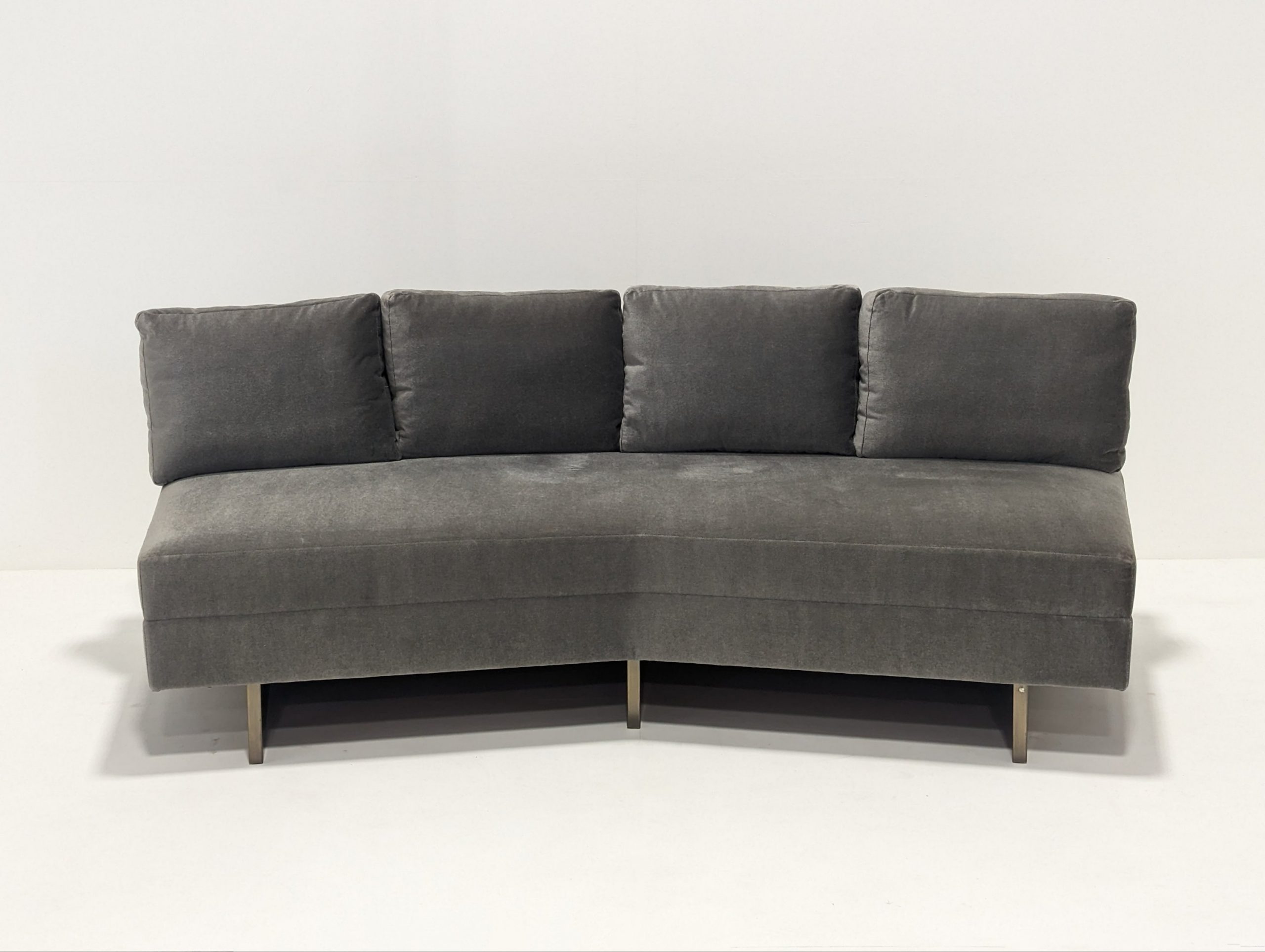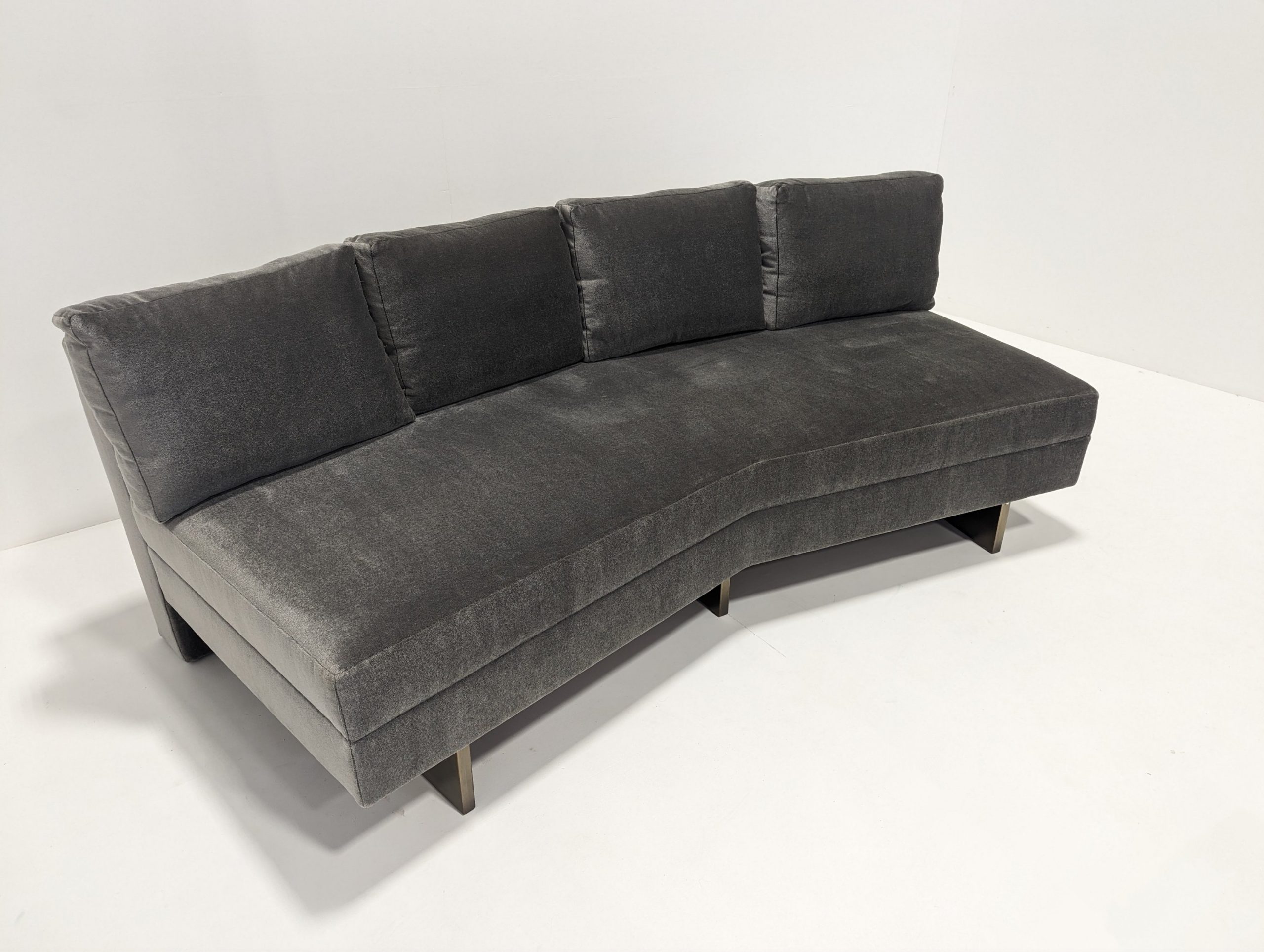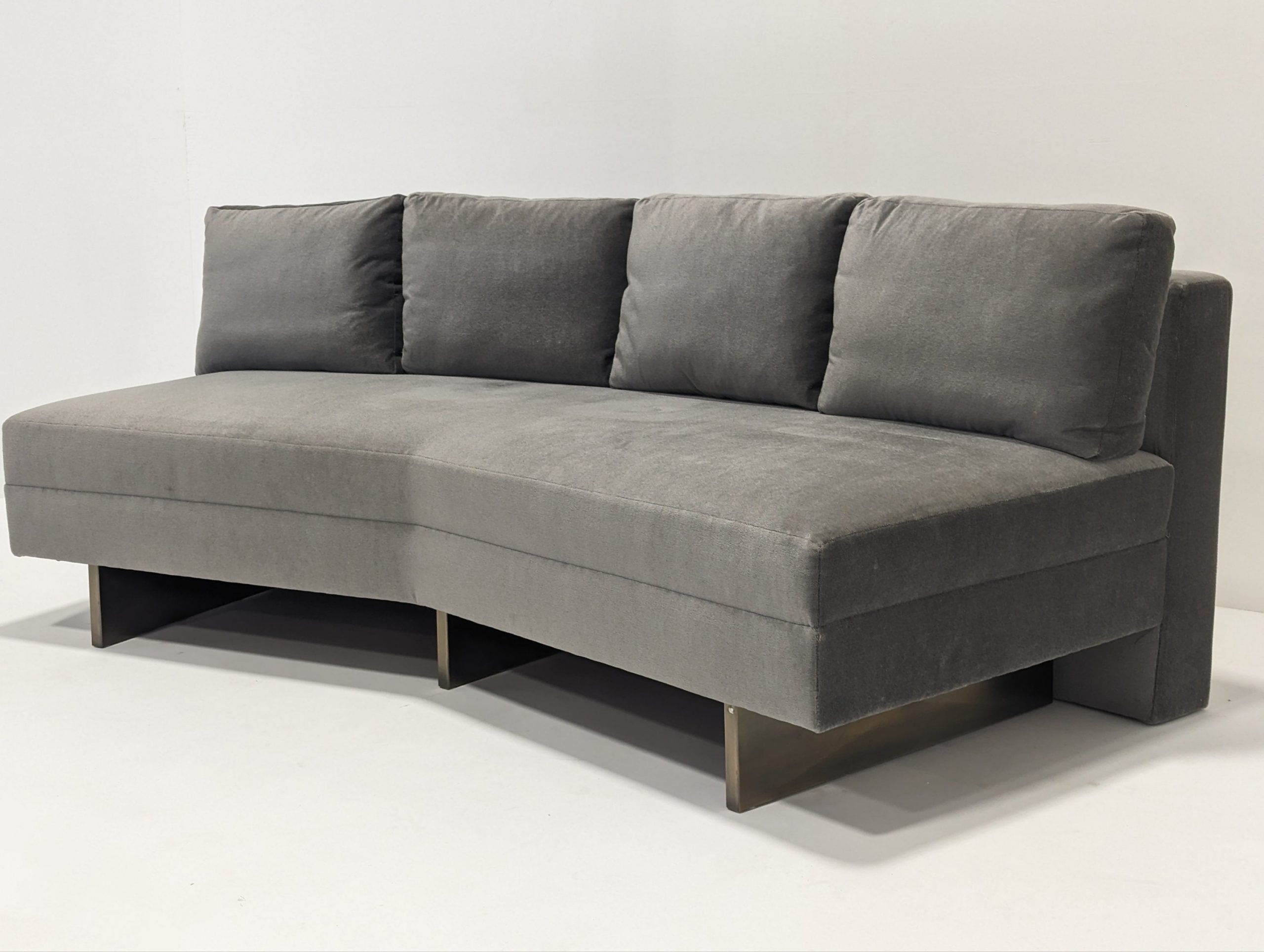 Bray Design Upholstery is known throughout the industry for quality comfort & service. This deep grey velvet sectional sofa can be separated or as one. The back cushions are feather filled and loose but firm. Held up with heavy antique polished brass metal feet, this sofa is both stylish and comfortable.