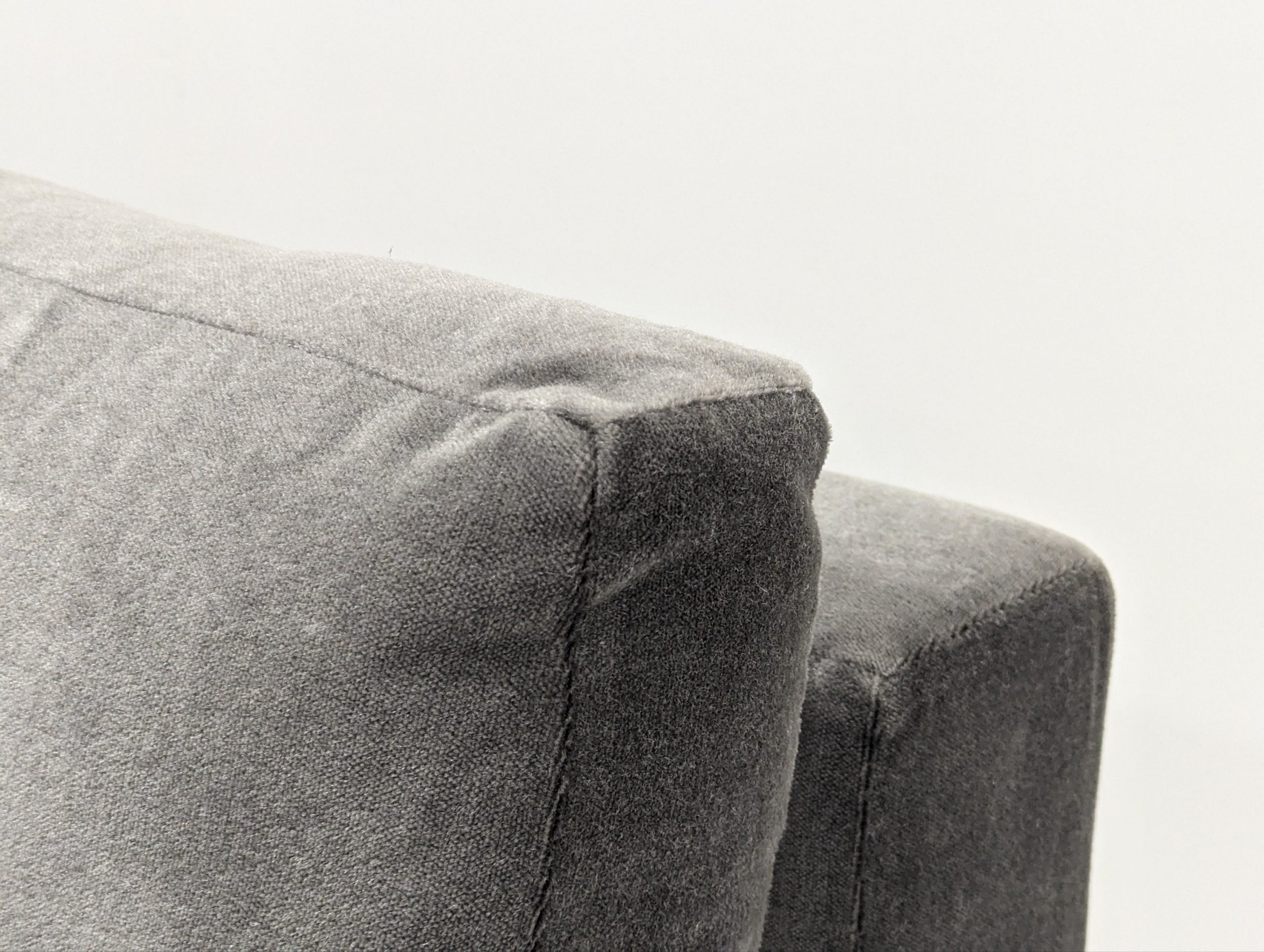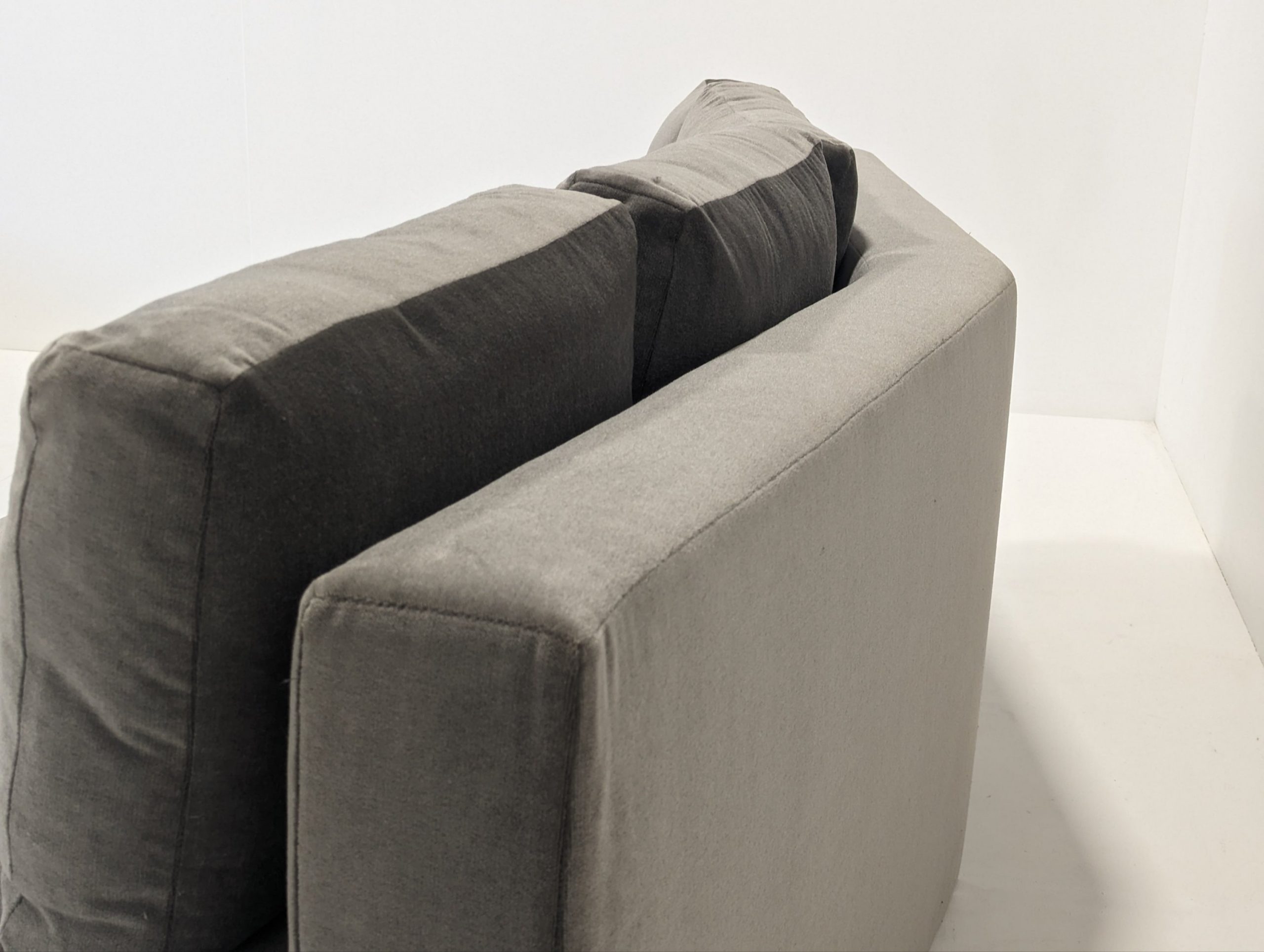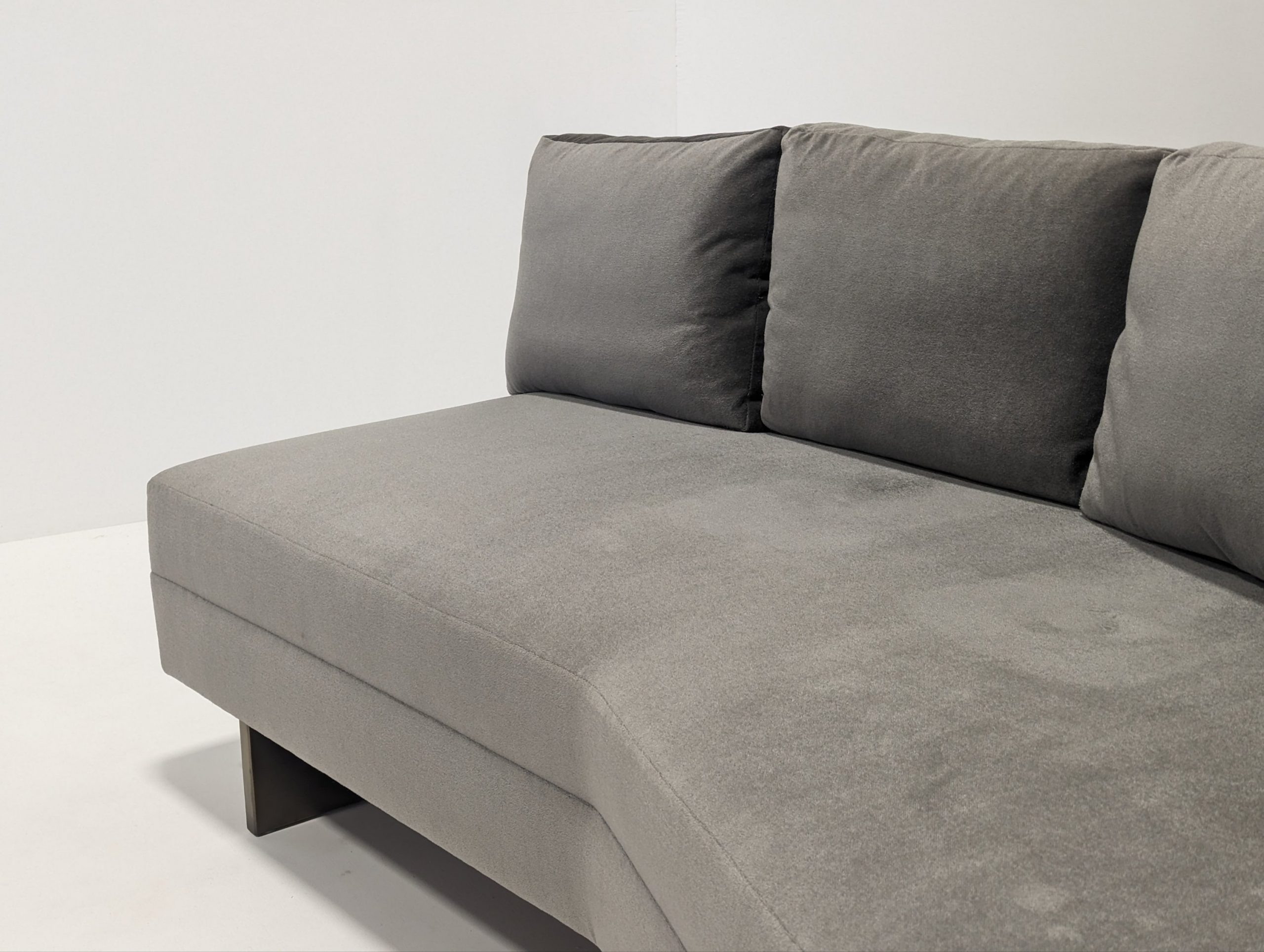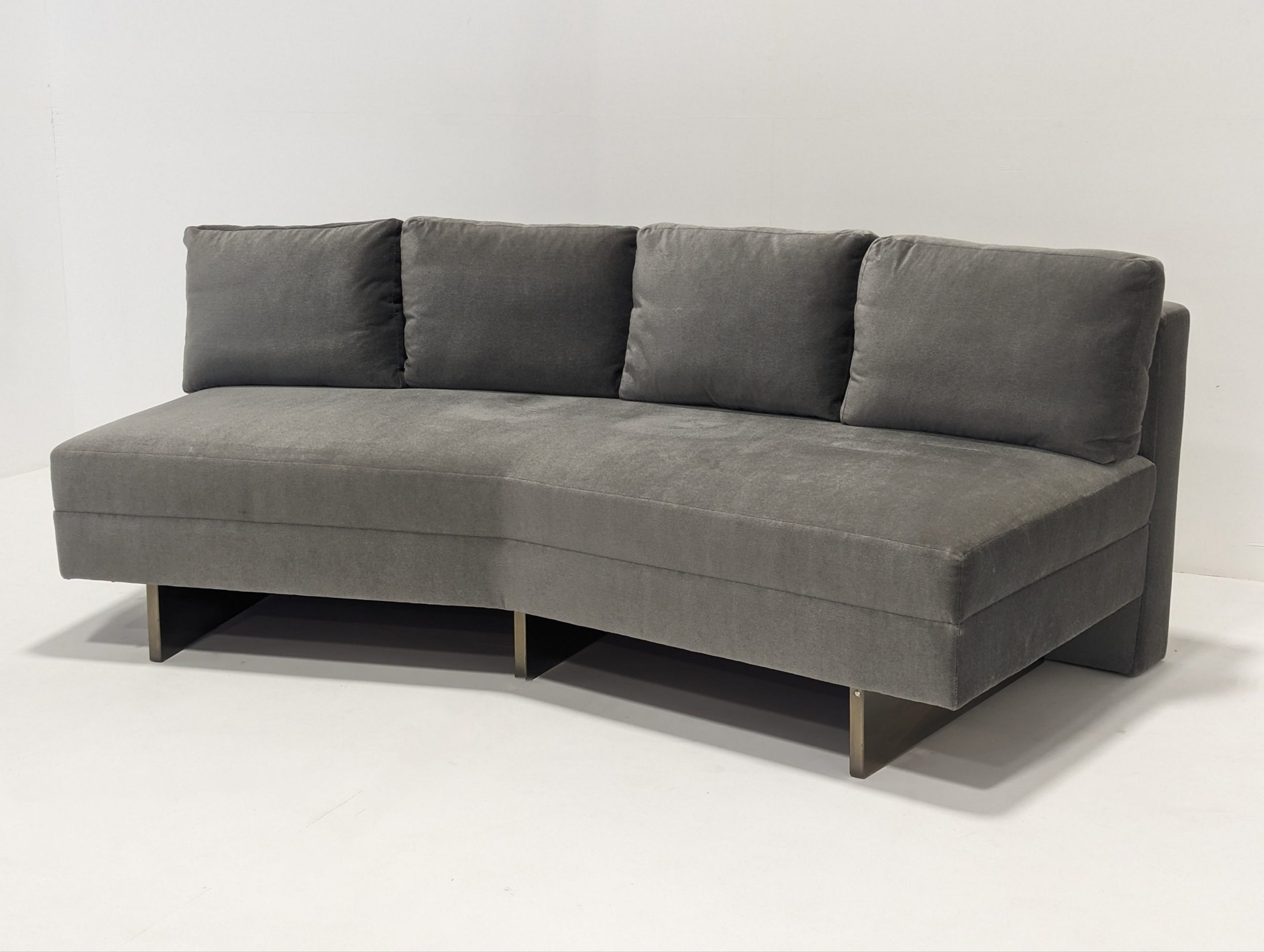 Bray Design Upholstery is known throughout the industry for quality comfort & service. This deep grey velvet sectional sofa can be separated or as one. The back cushions are feather filled and loose but firm. Held up with heavy antique polished brass metal feet, this sofa is both stylish and comfortable.