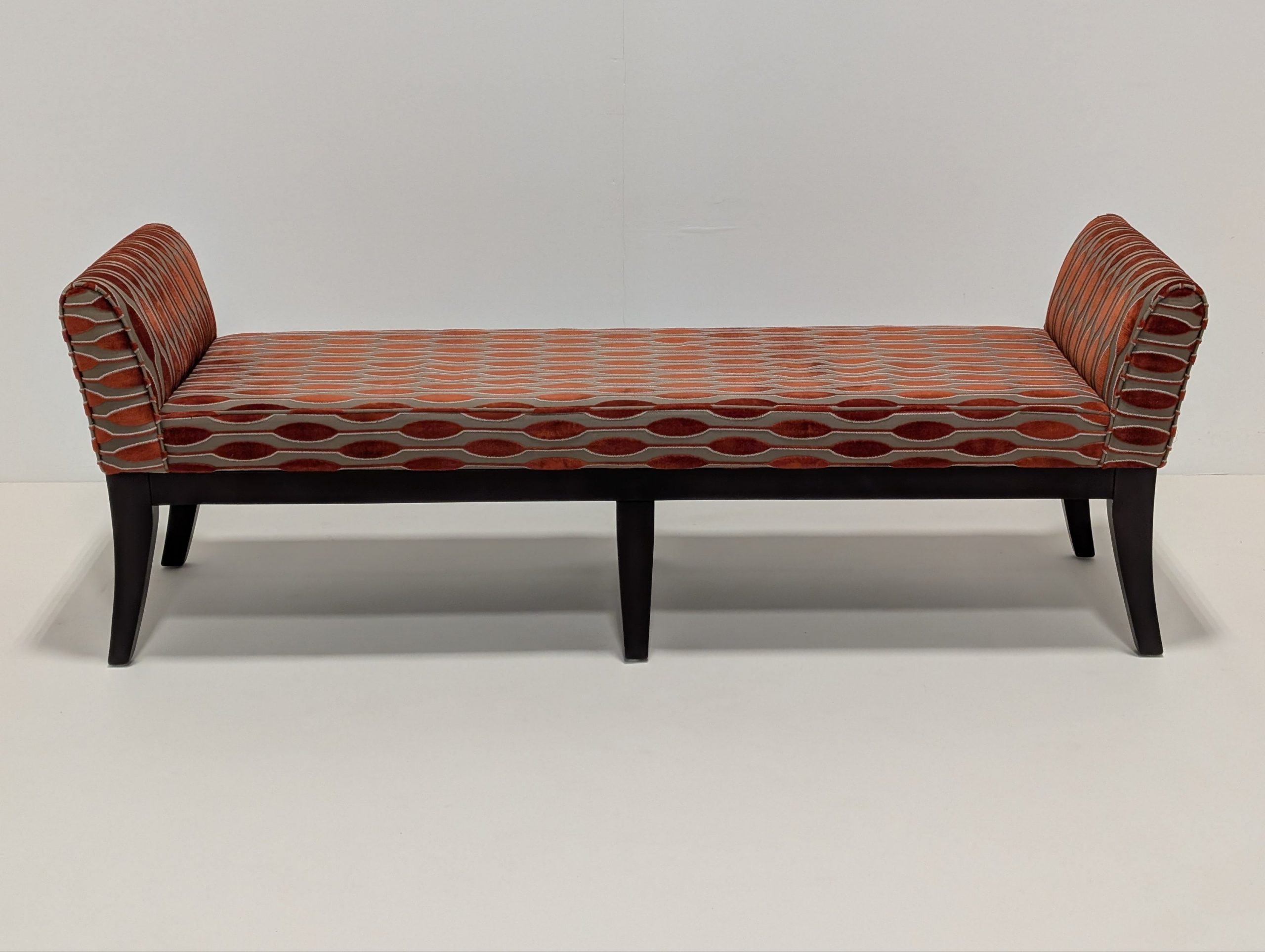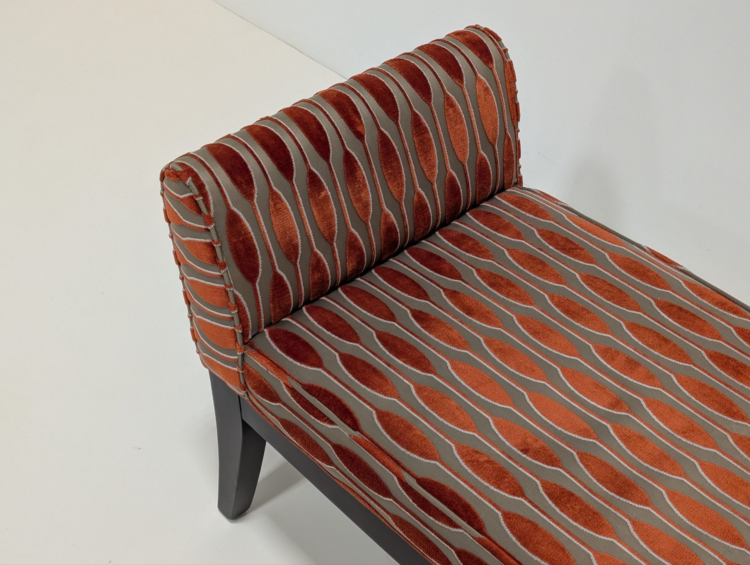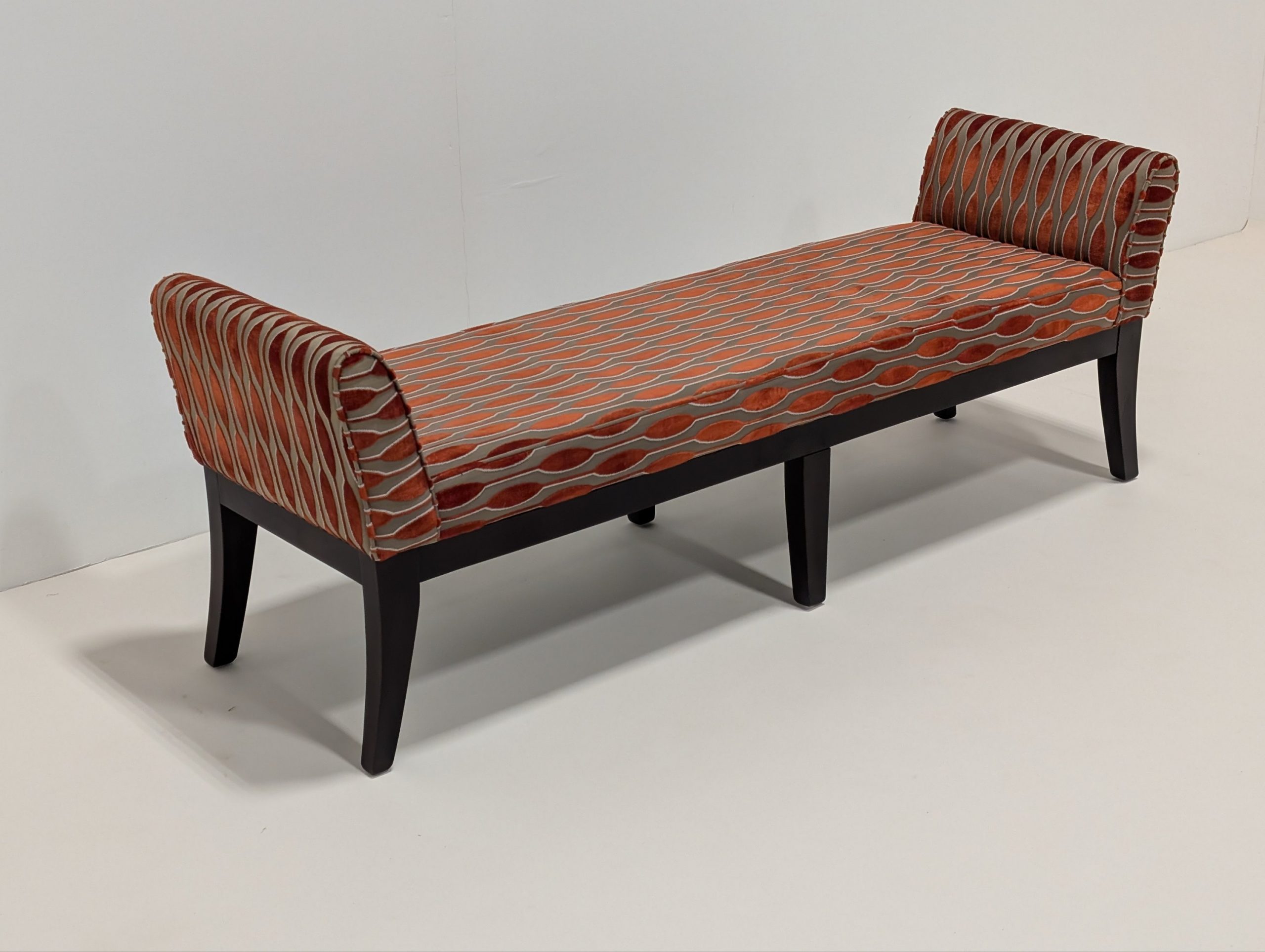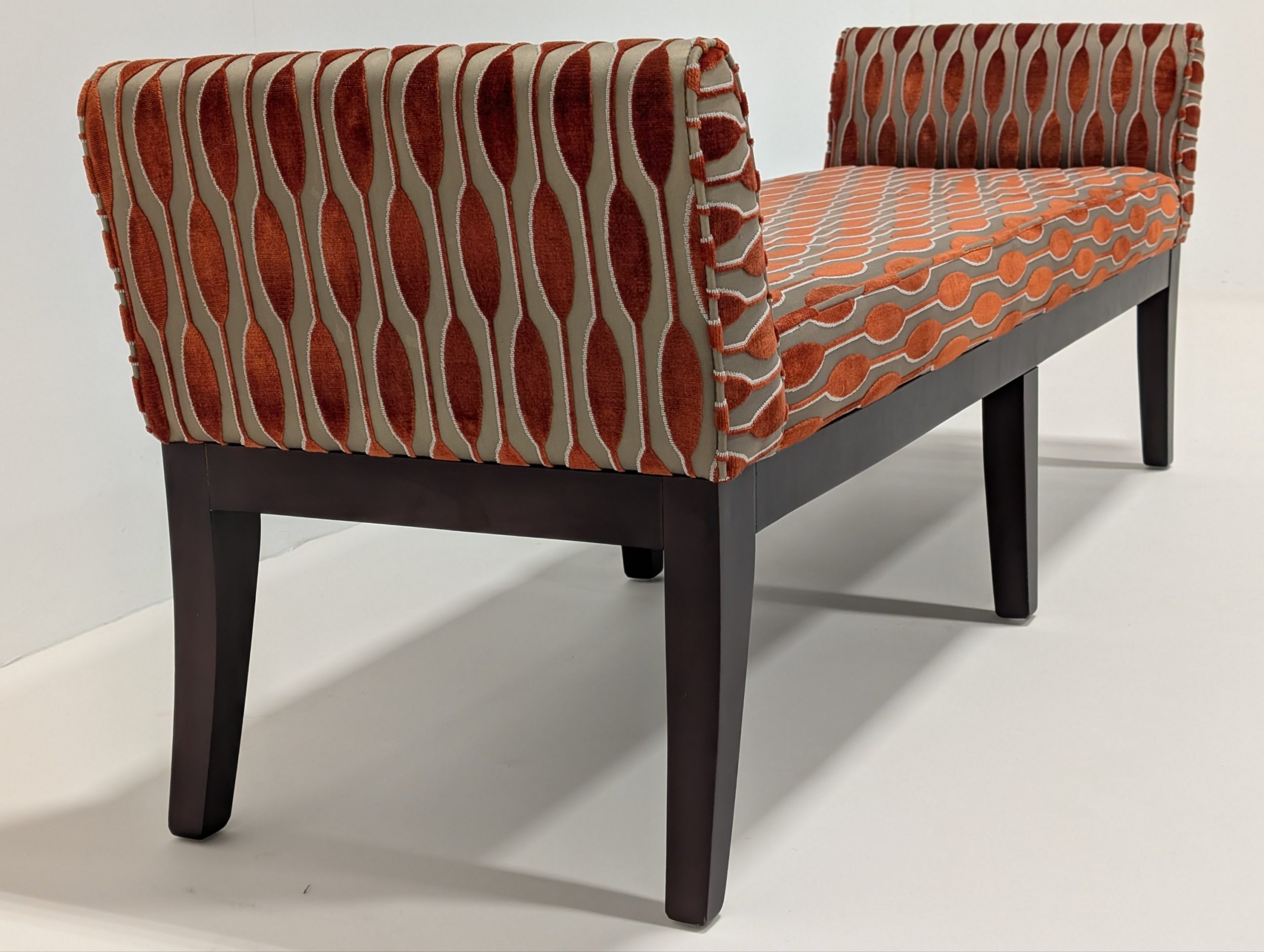 A beautifully tailored piece by Jameson Seating Ltd, this elegant bed end bench combines refined craftsmanship with bold contemporary design. Upholstered in a richly textured velvet featuring a striking geometric pattern in burnt orange and taupe tones, it exudes both warmth and sophistication. The gently curved arms and clean silhouette rest on dark tapered wooden legs, adding a sense of poise and balance.
