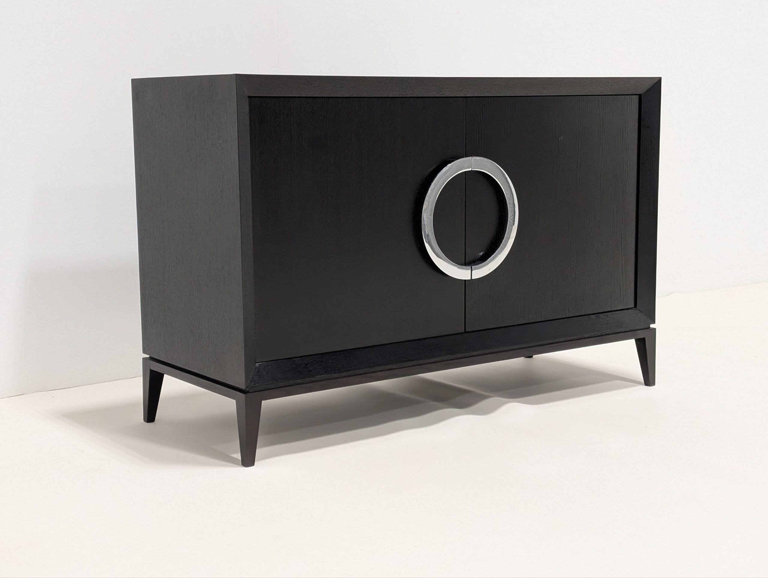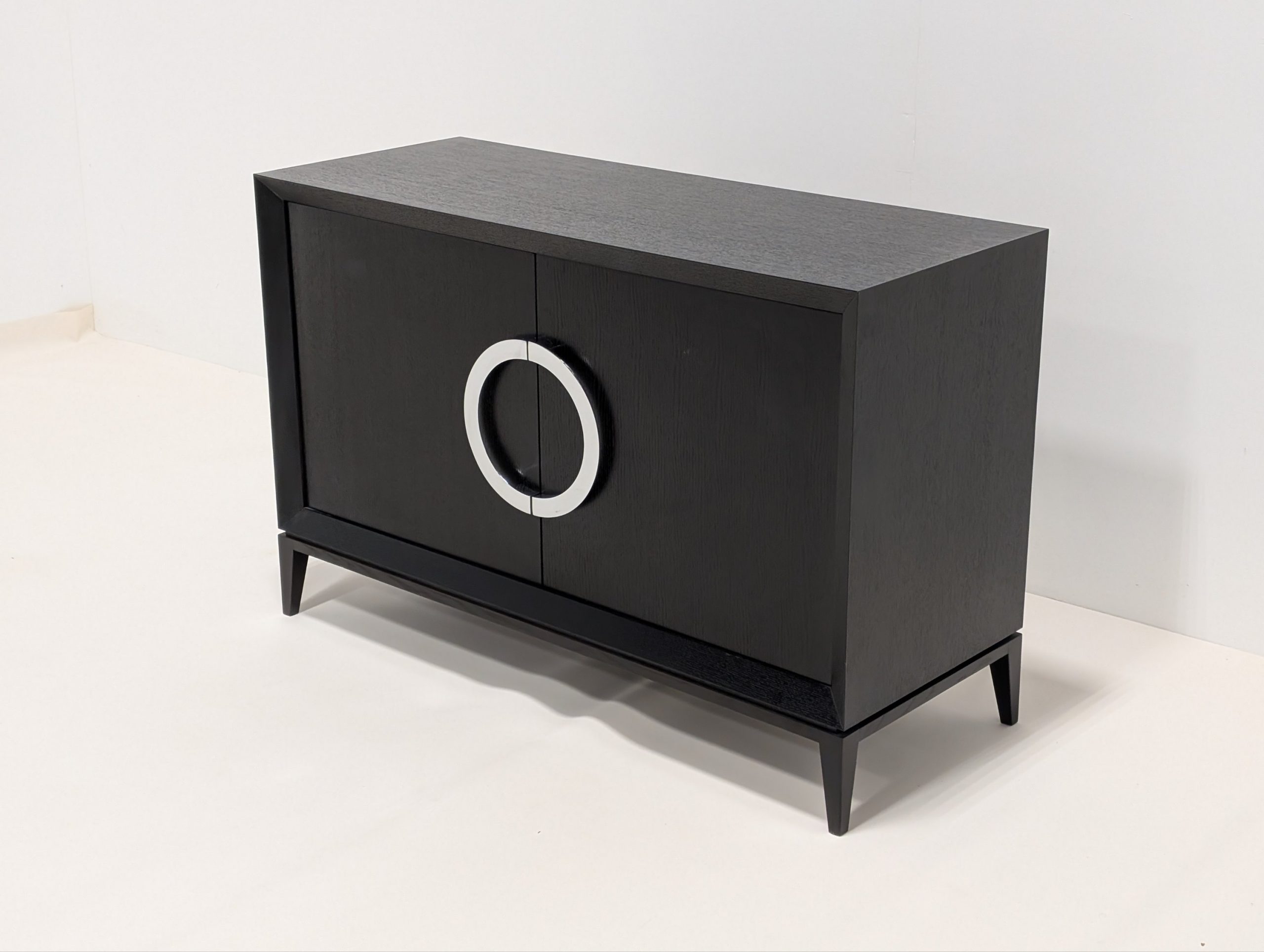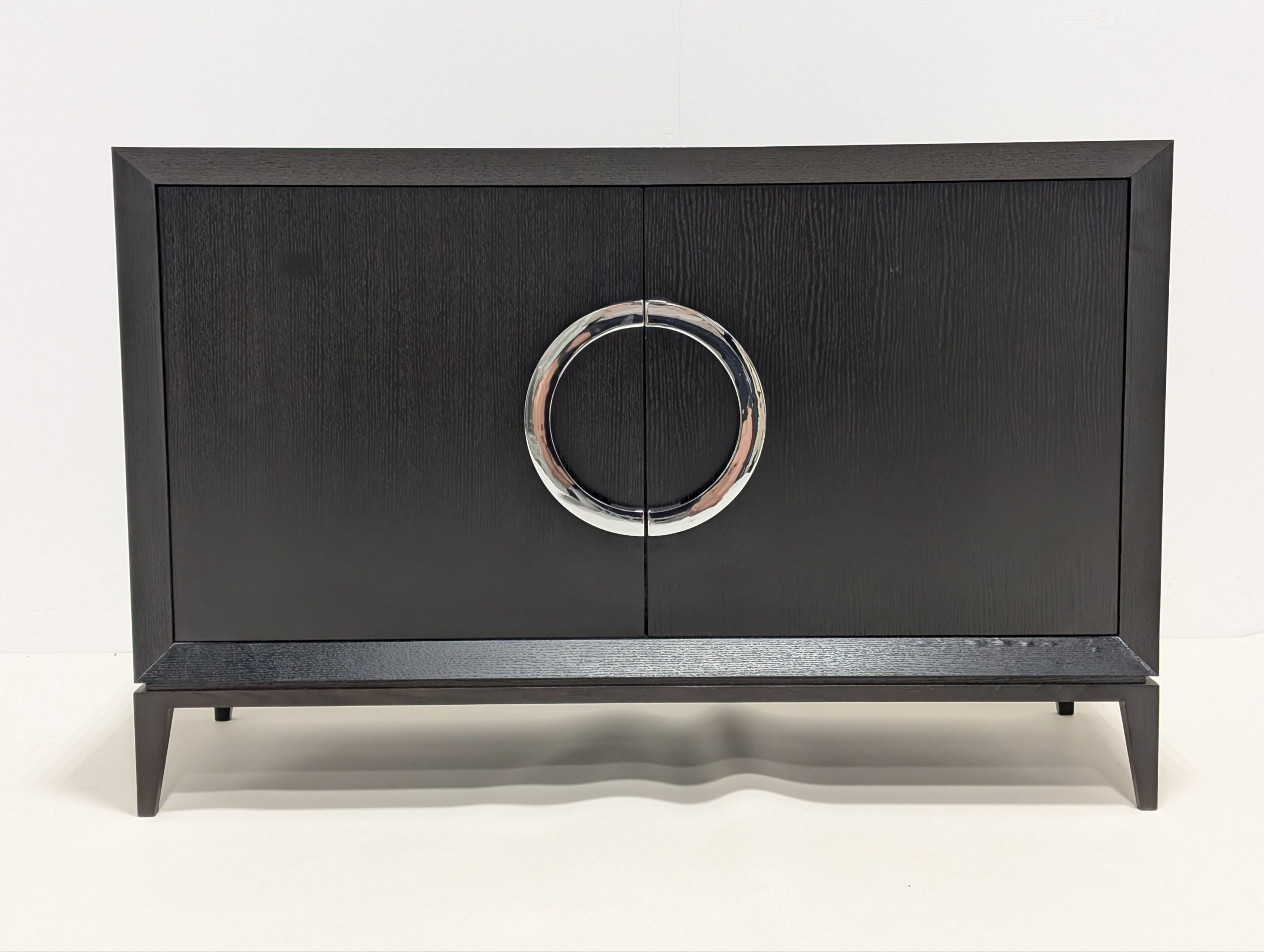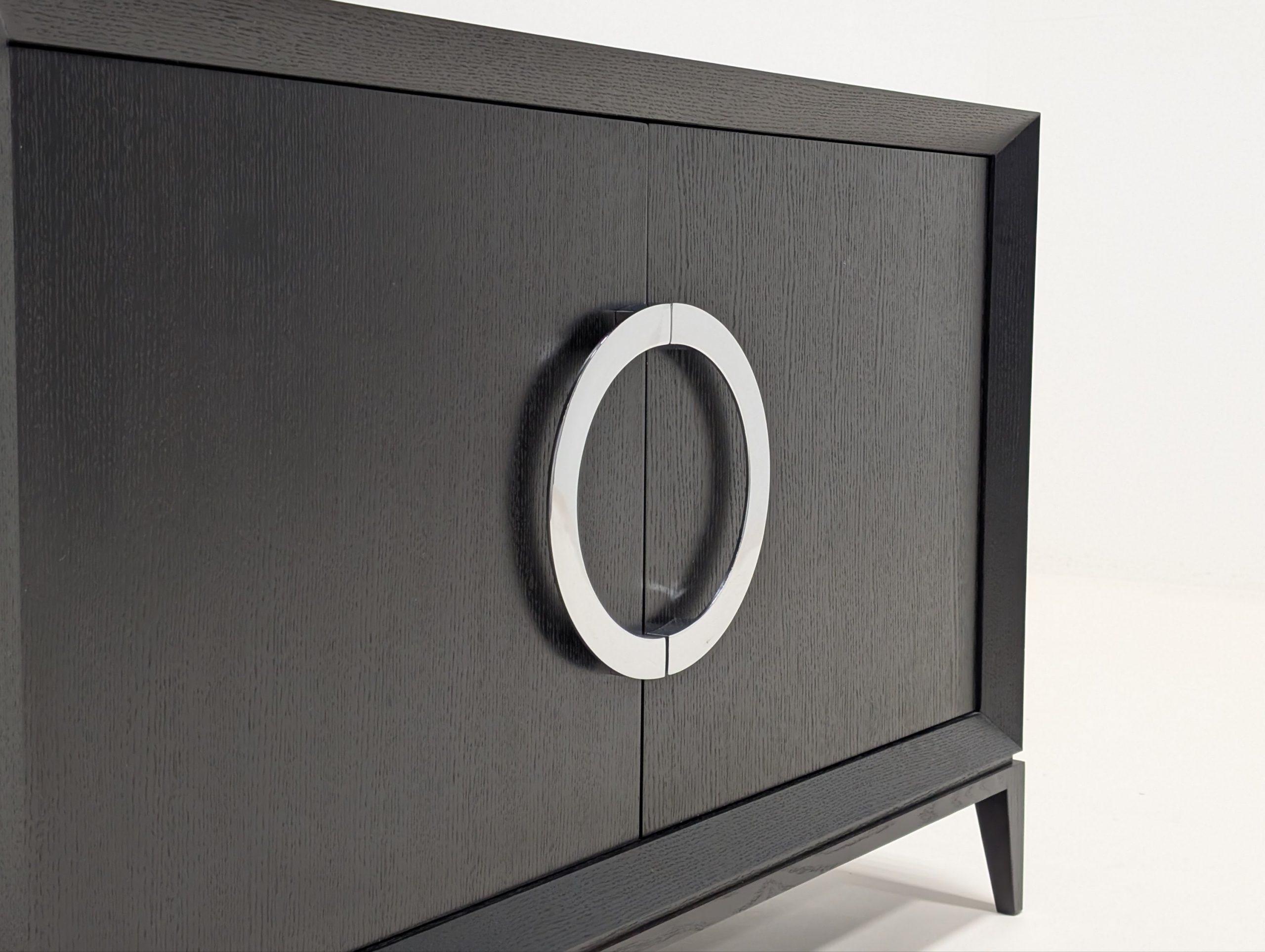 The Rochel Sideboard features contemporary chrome handles and a stunning quartered oak veneer design that captures attention. Its sophisticated form, supported by solid wood legs with a wenge finish, ensures it complements any modern decor while providing essential storage.