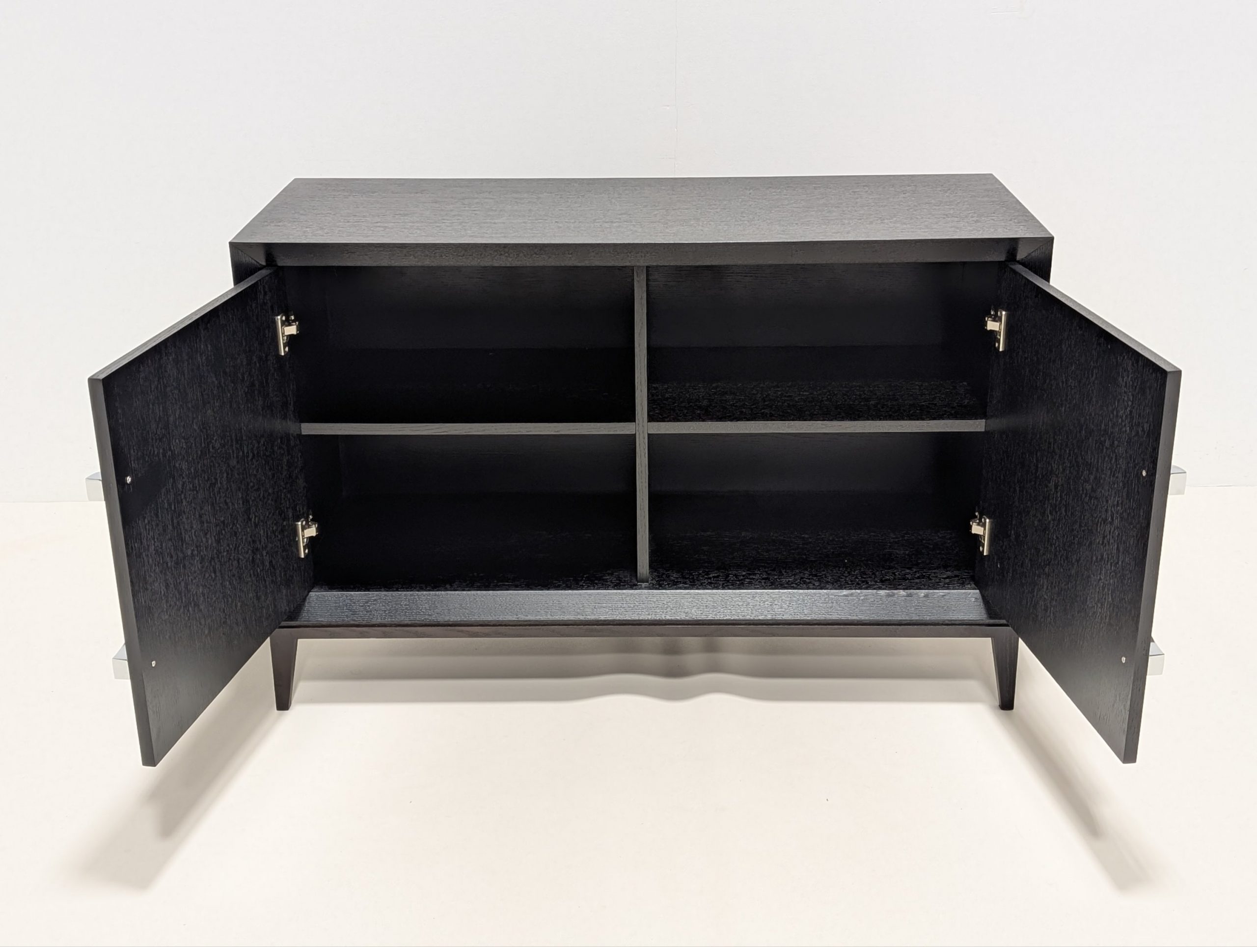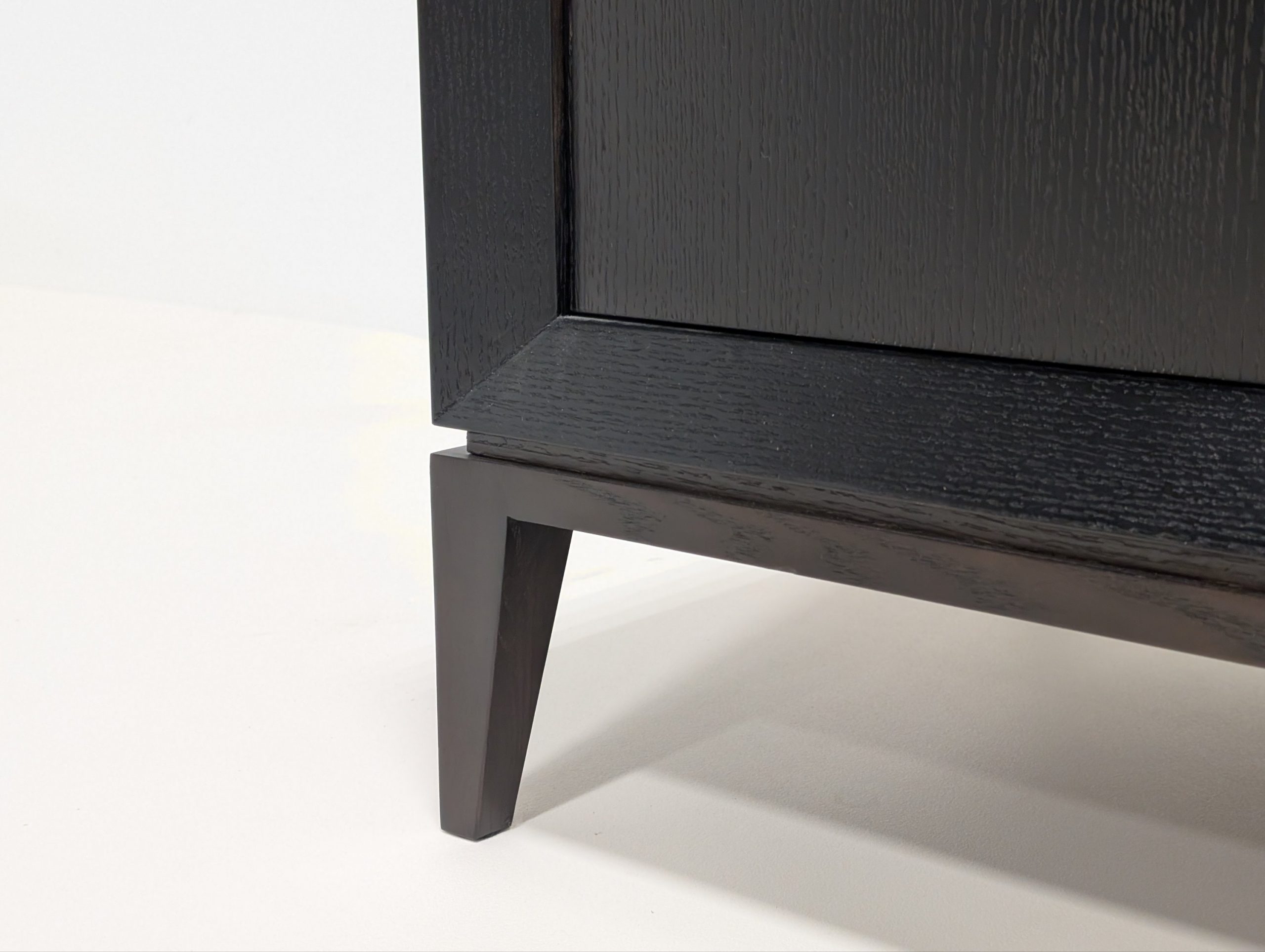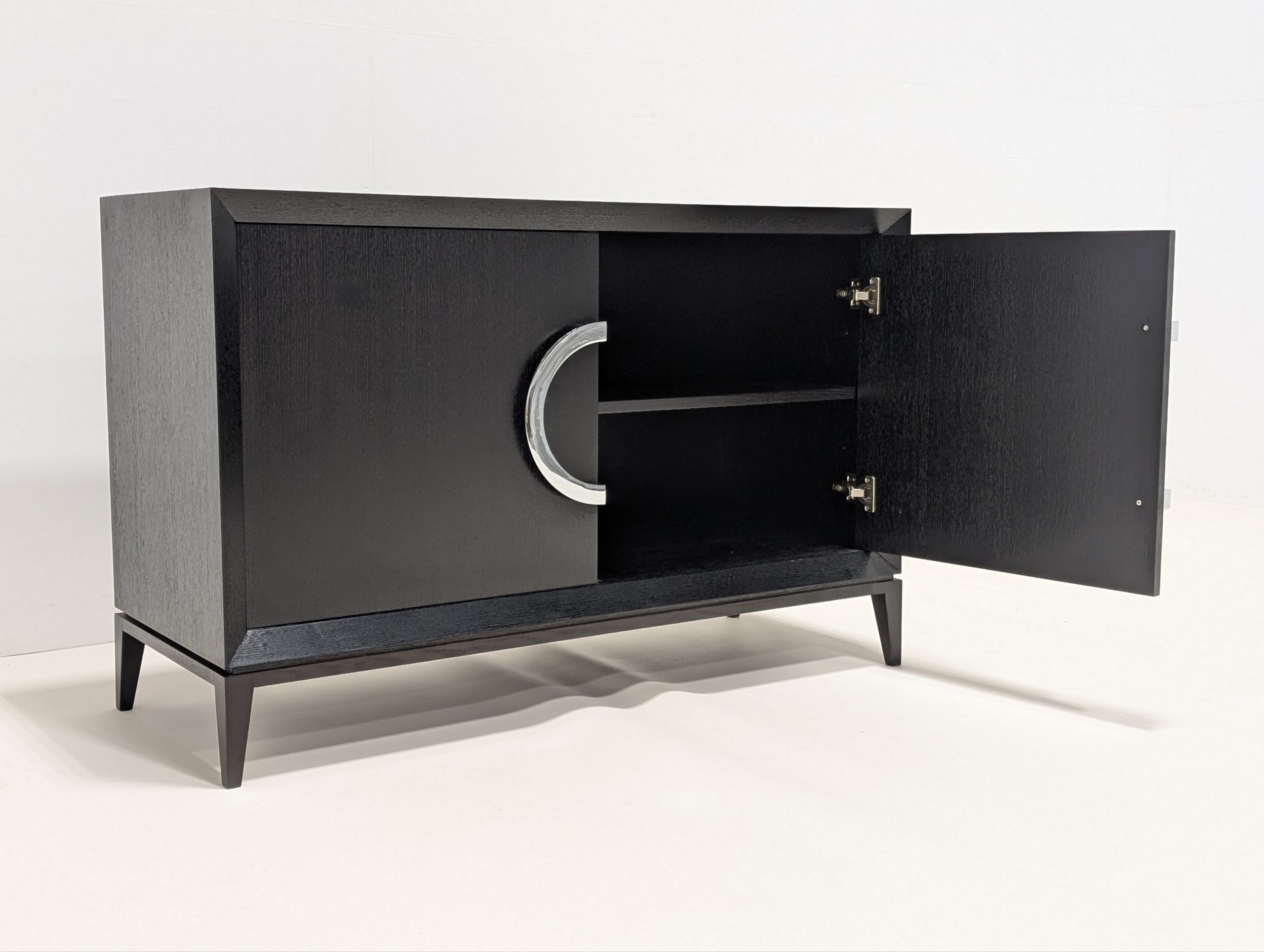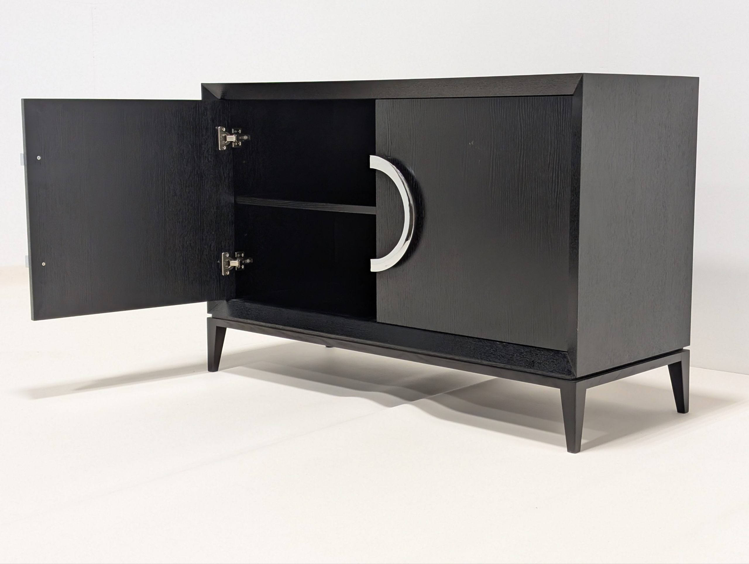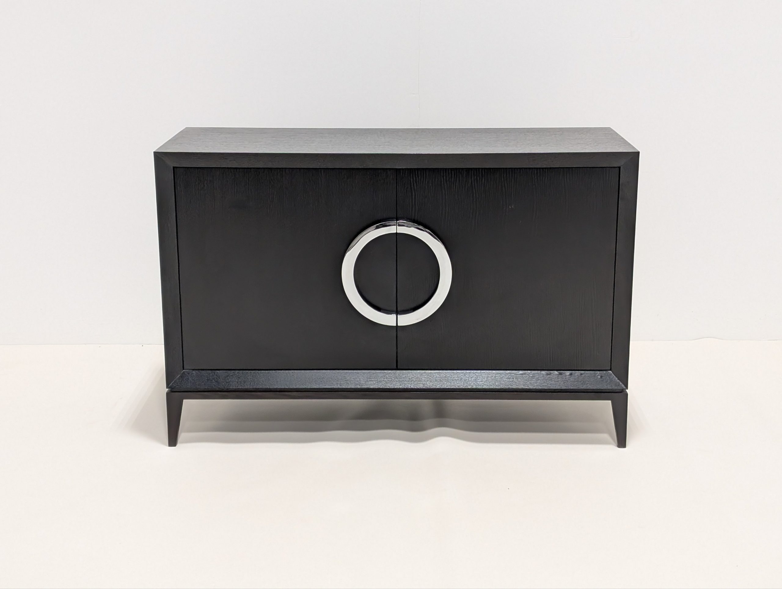 The Rochel Sideboard features contemporary chrome handles and a stunning quartered oak veneer design that captures attention. Its sophisticated form, supported by solid wood legs with a wenge finish, ensures it complements any modern decor while providing essential storage.