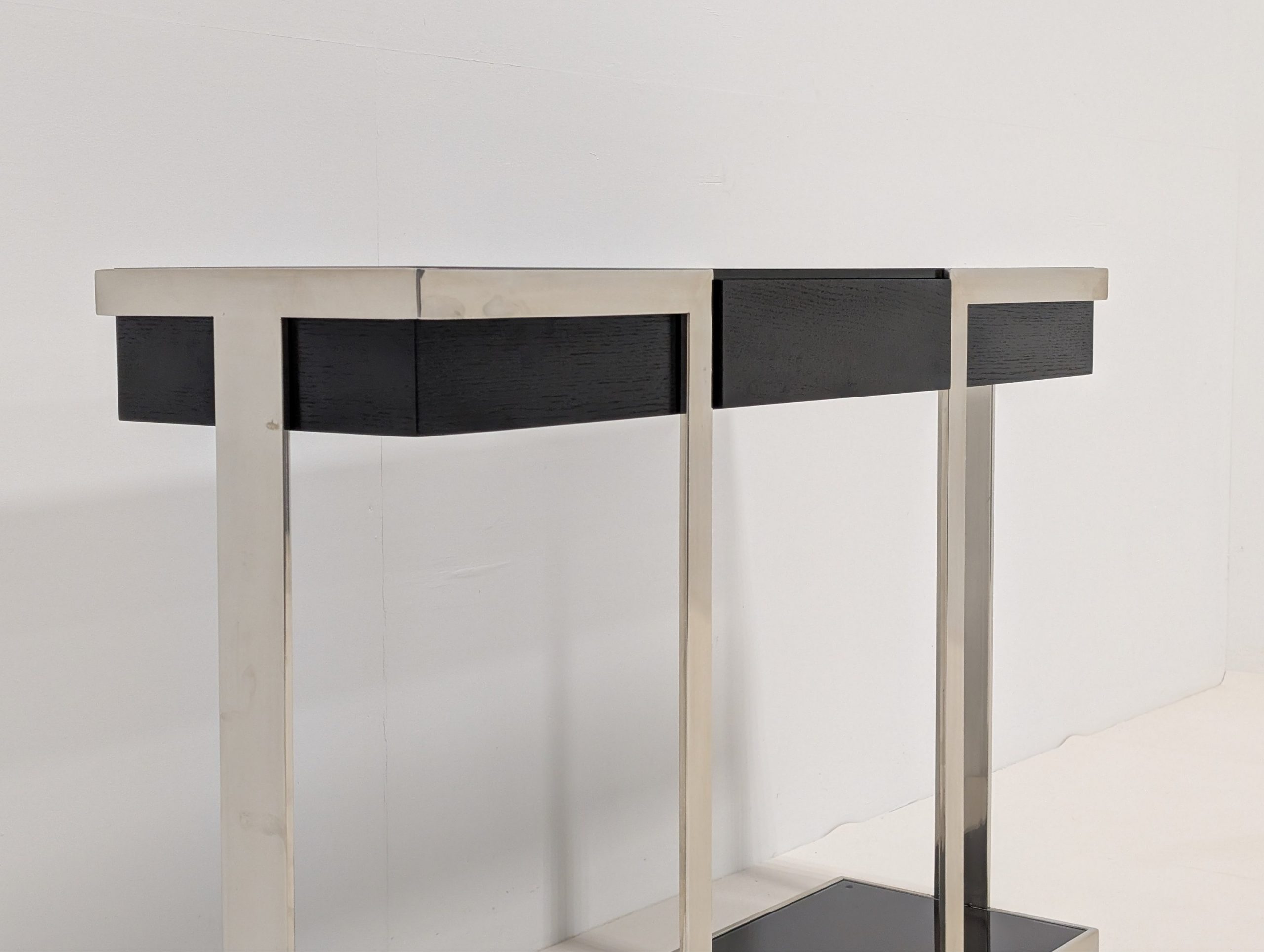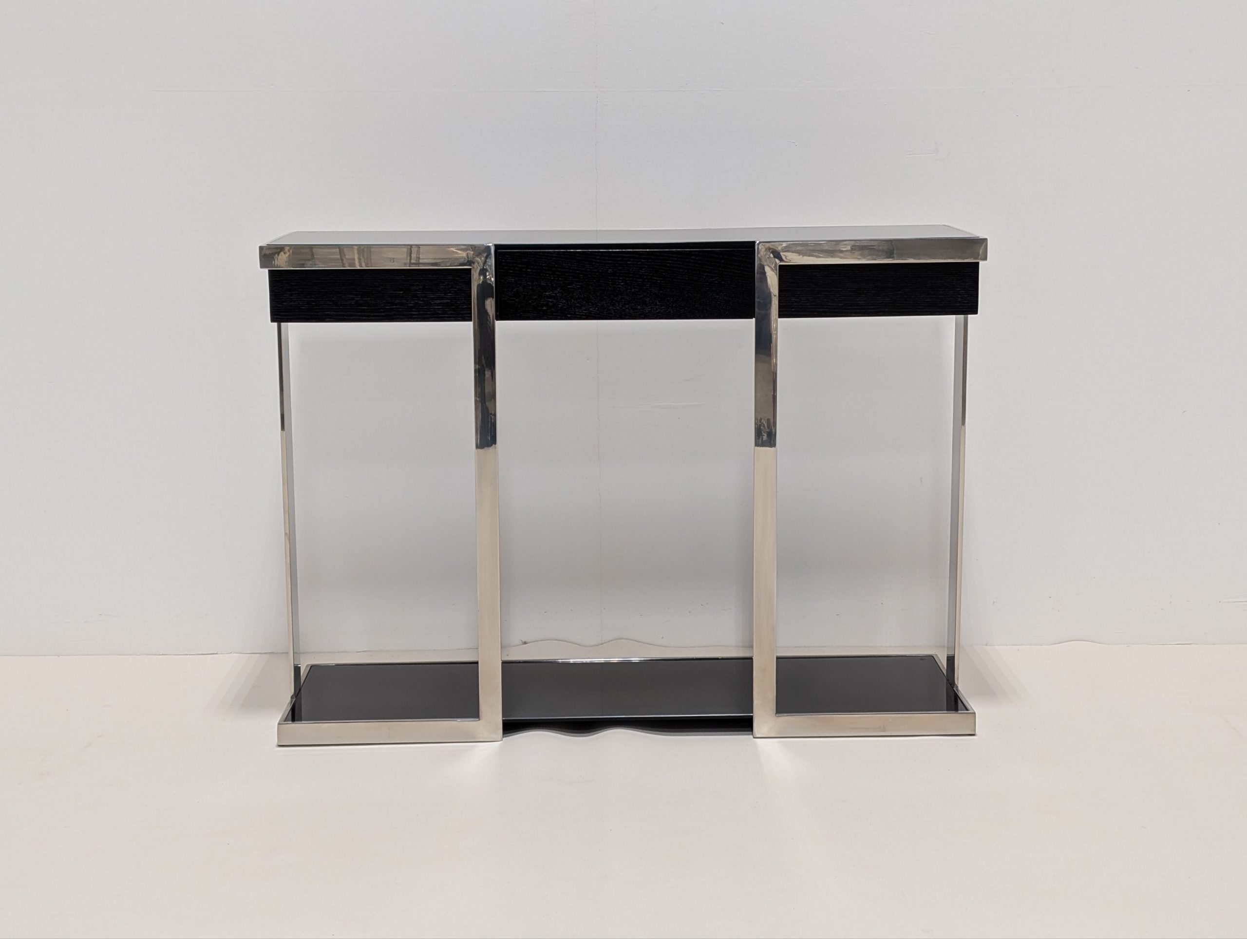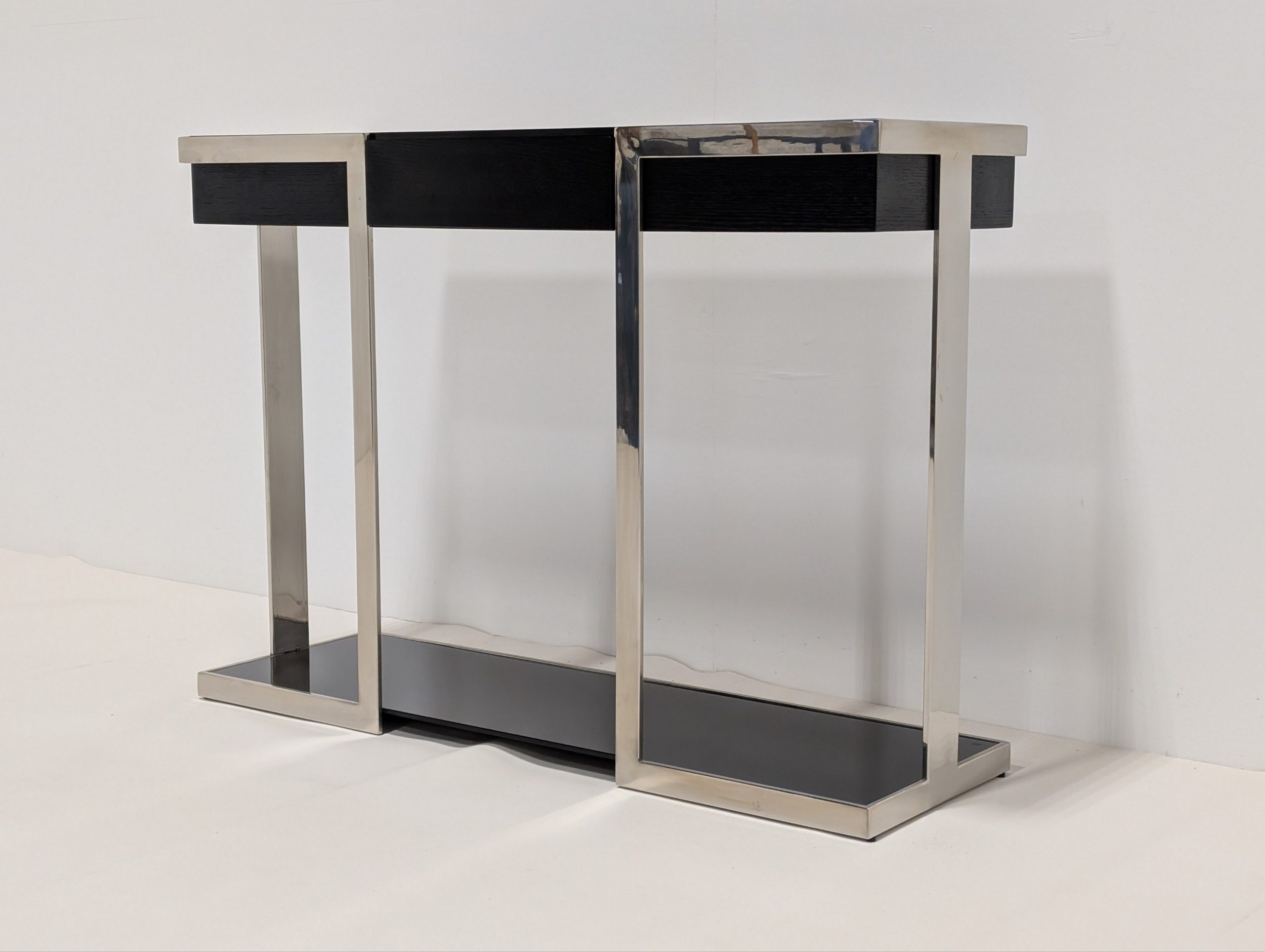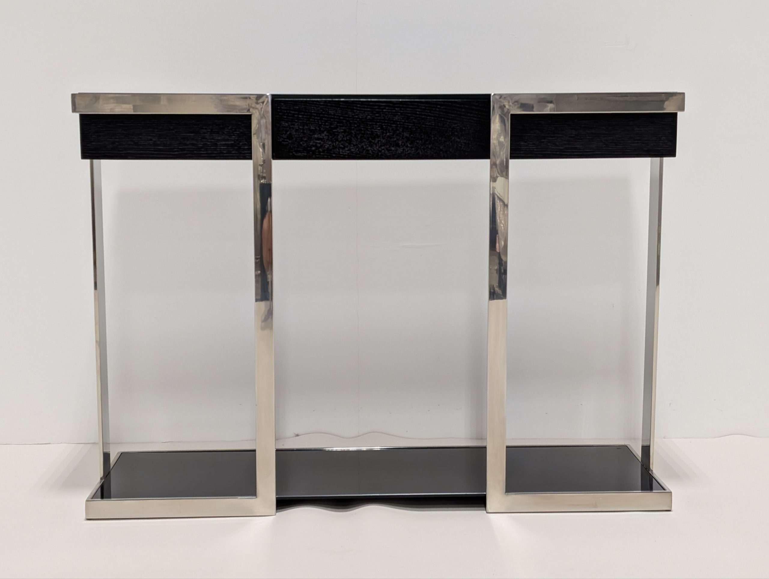The Serenity Console Table by Eichholtz is the perfect piece to add a contemporary glamour to any living space. This unique piece boasts a sleek polished stainless steel frame with a beautiful oak veneer in a stunning and sophisticated design. Designed and handcrafted by the award-winning team at Eichholtz, this versatile piece is built to create a lasting impact on any residential or commercial interior setting.