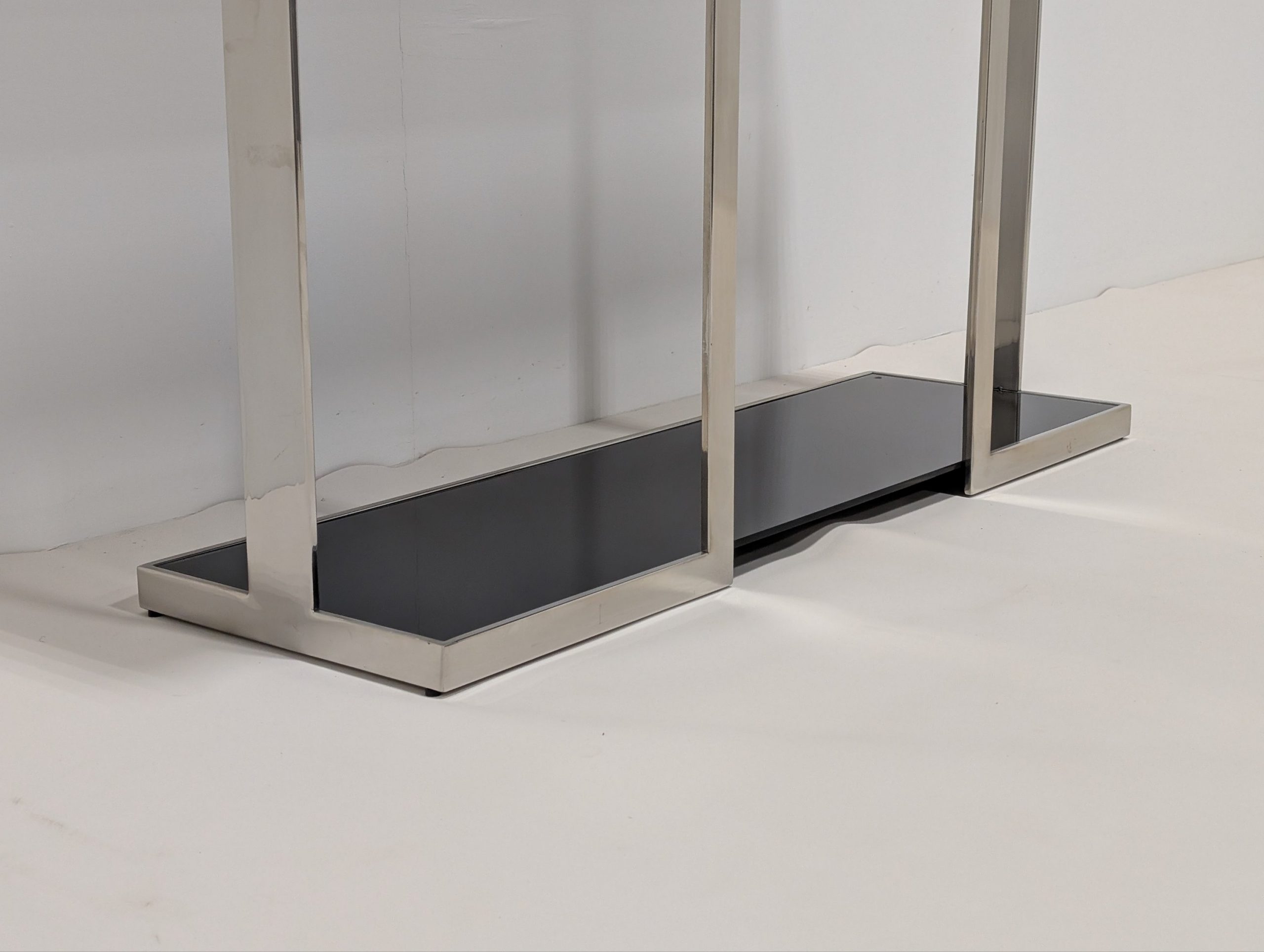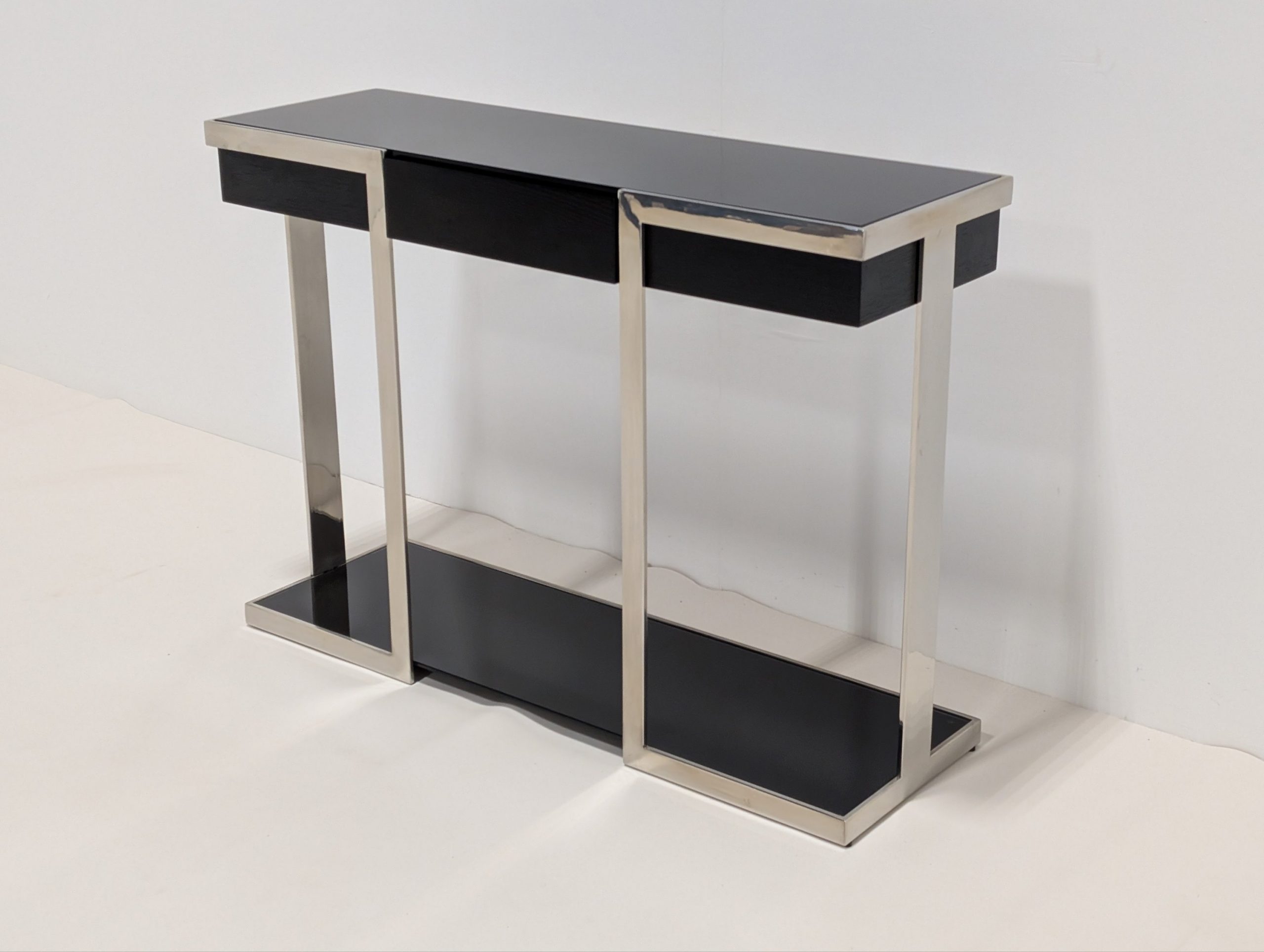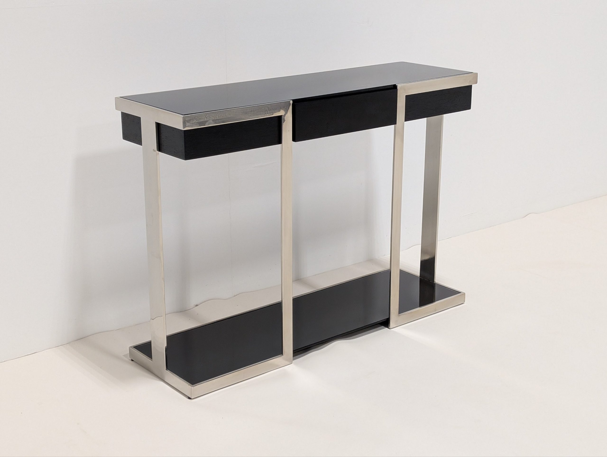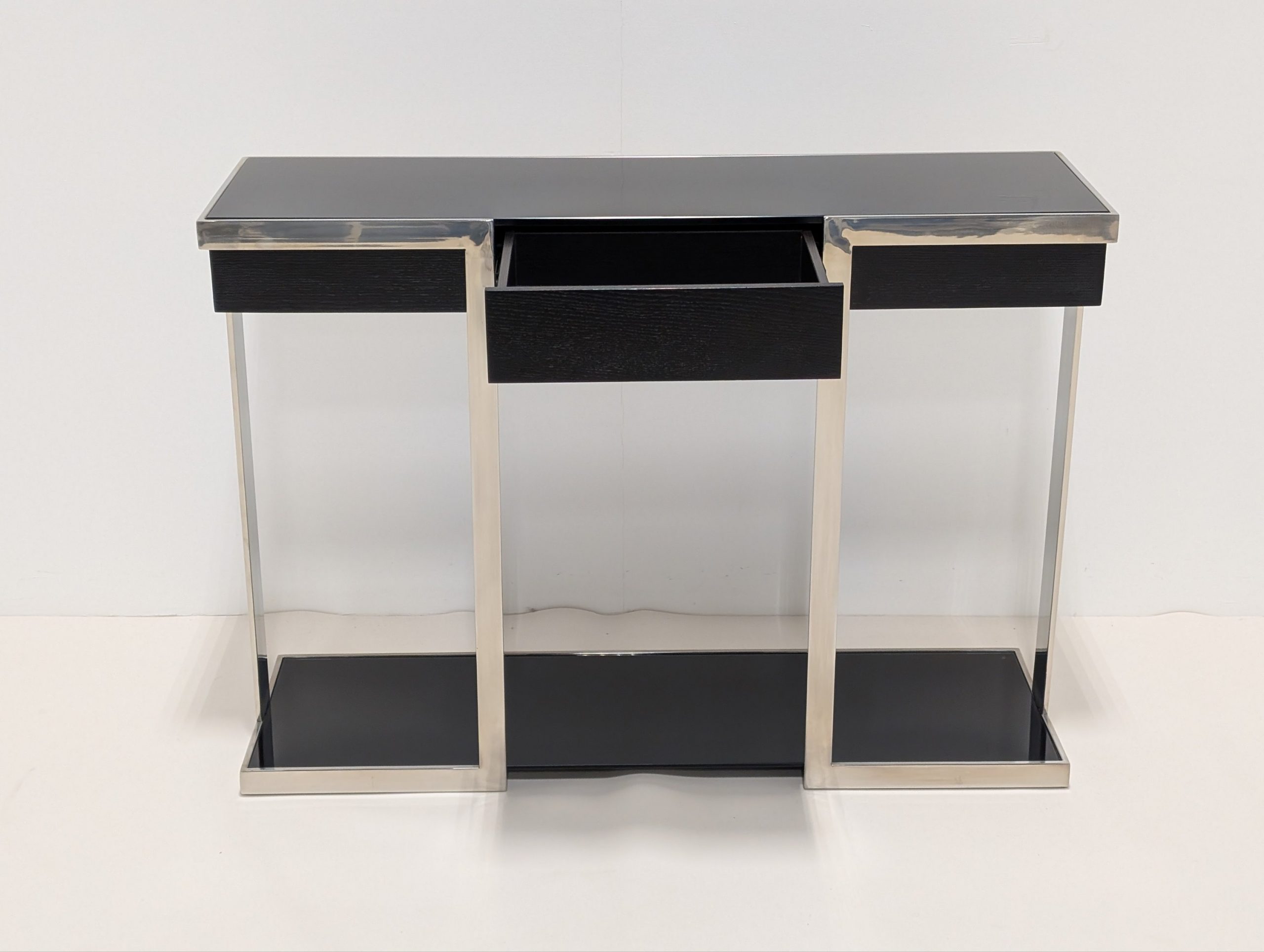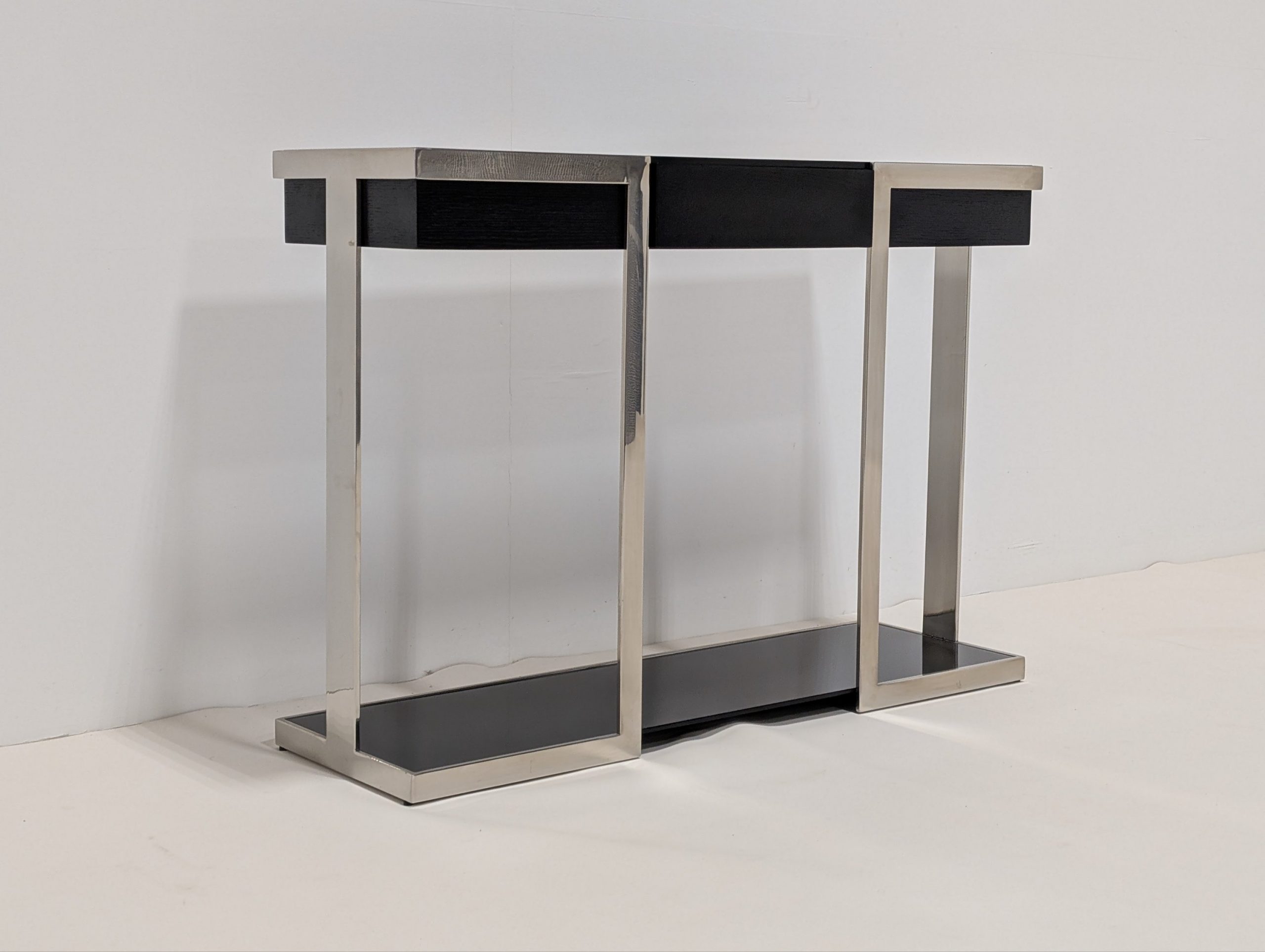 The Serenity Console Table by Eichholtz is the perfect piece to add a contemporary glamour to any living space. This unique piece boasts a sleek polished stainless steel frame with a beautiful oak veneer in a stunning and sophisticated design. Designed and handcrafted by the award-winning team at Eichholtz, this versatile piece is built to create a lasting impact on any residential or commercial interior setting.