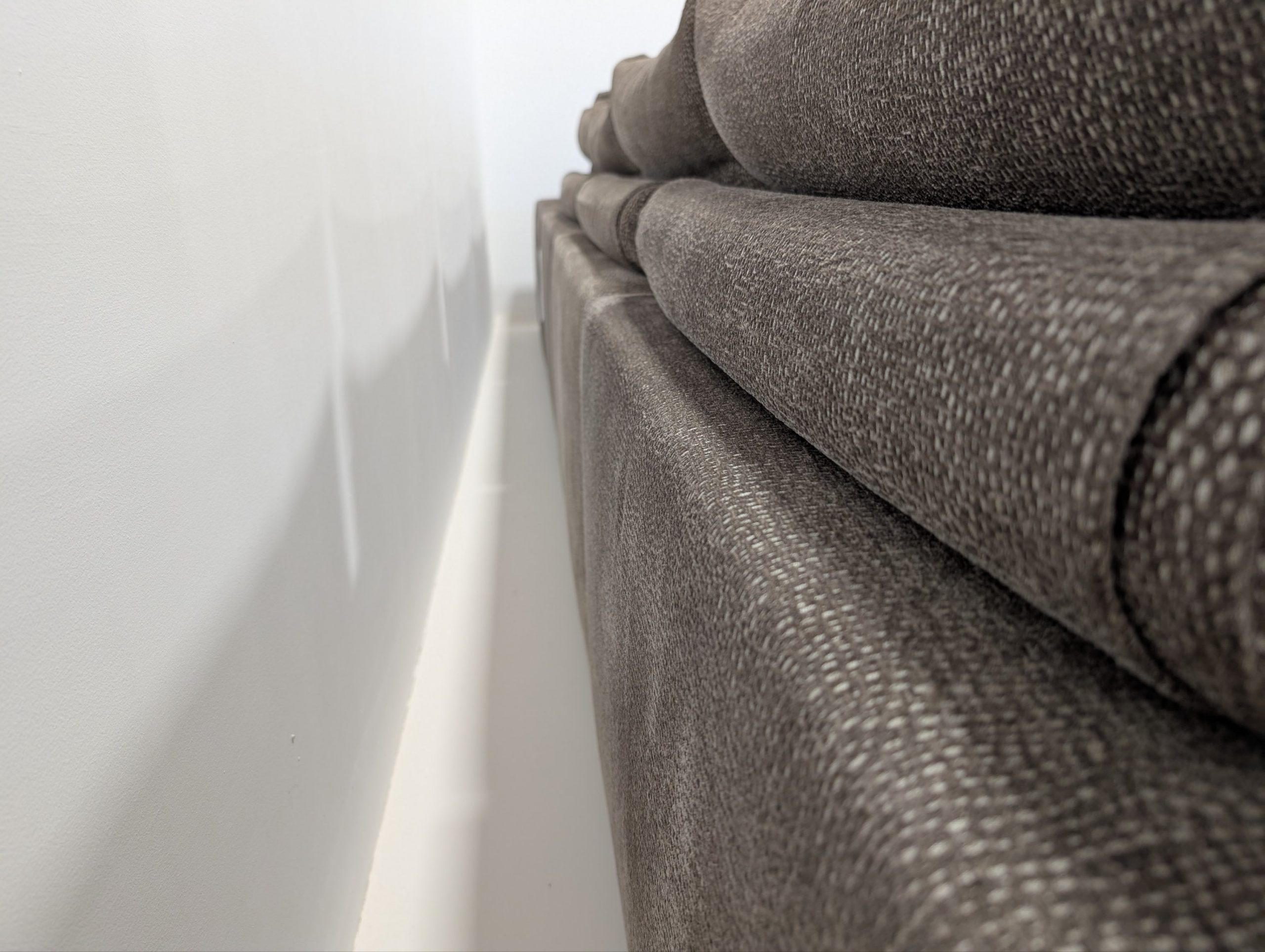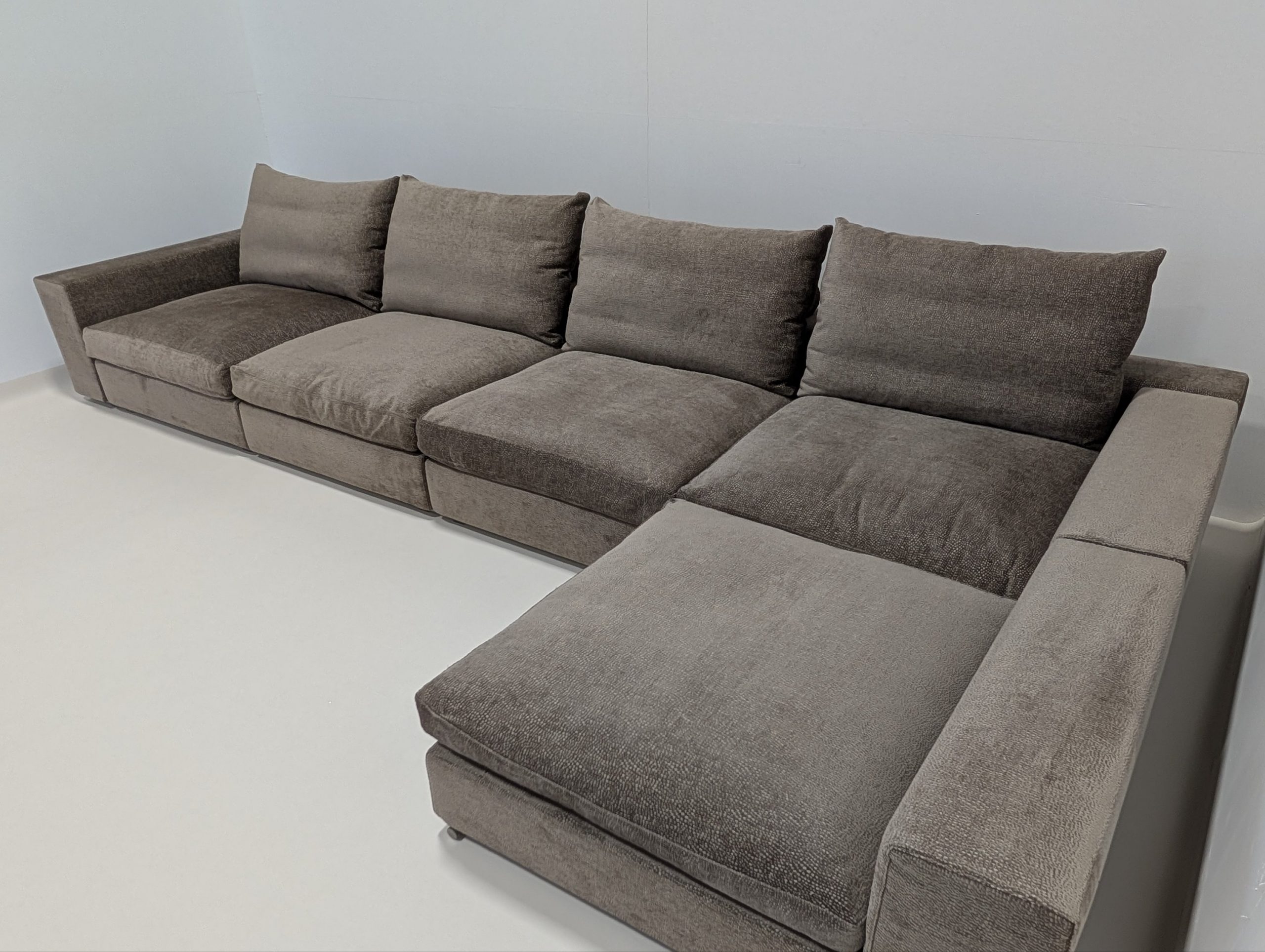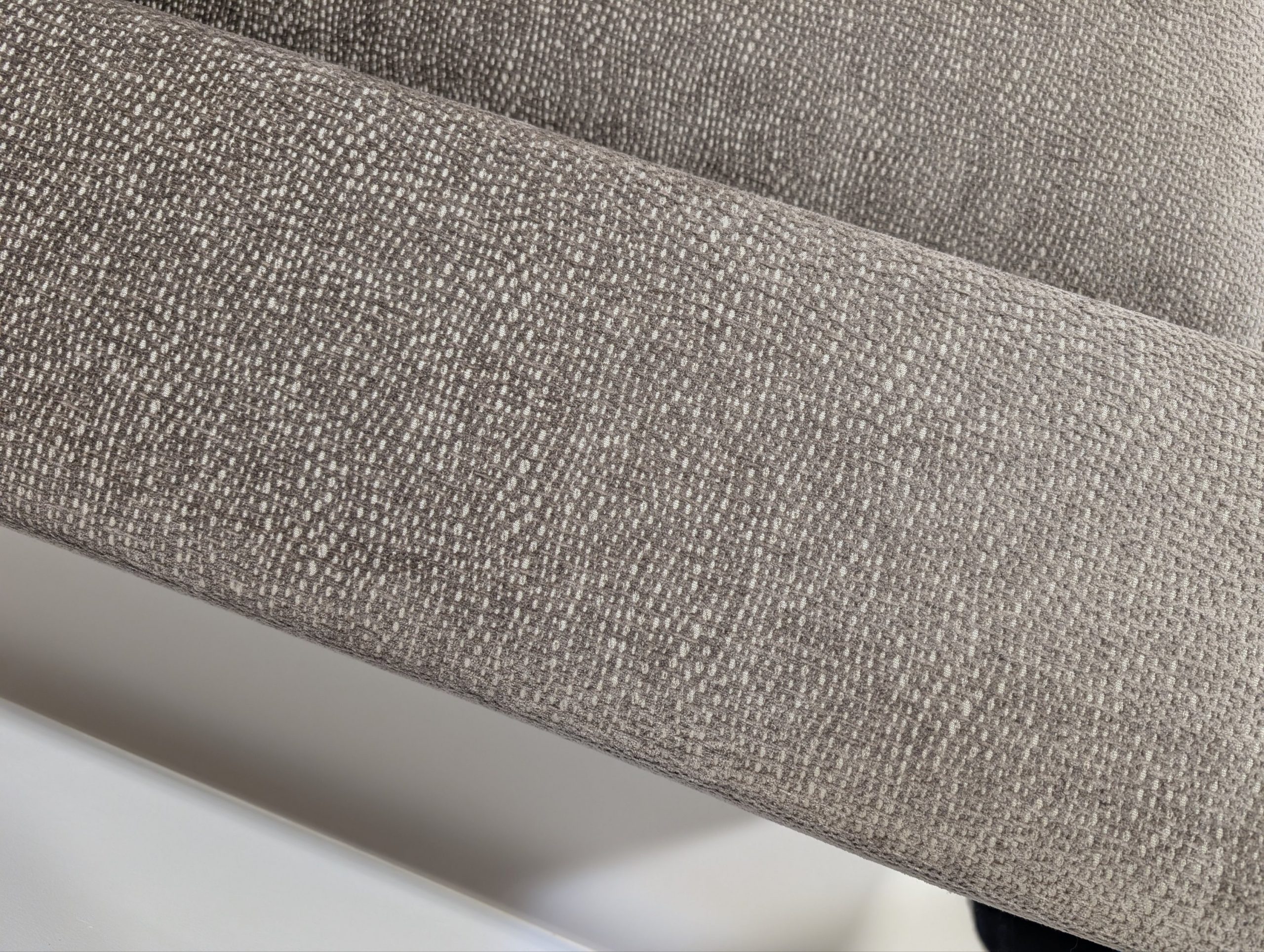 Modular sofa upholstered in fabric to match design scheme. The sofa is upholstered in patterned chenille fabric supplied by Sahco Hesslein.