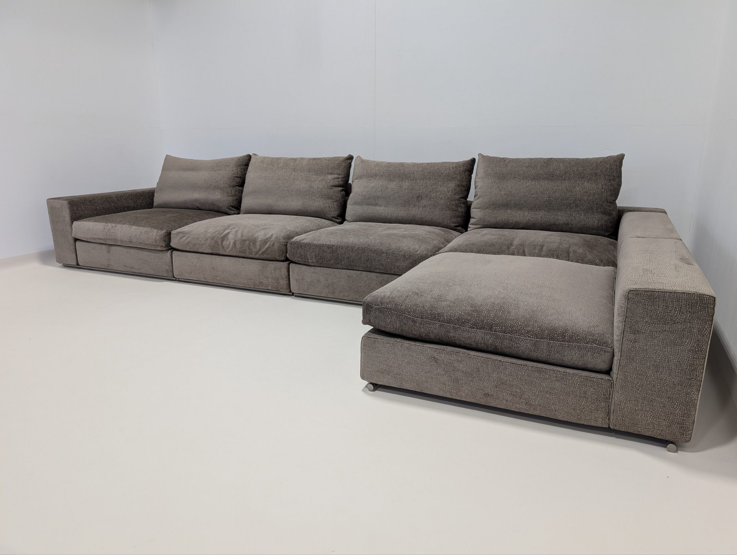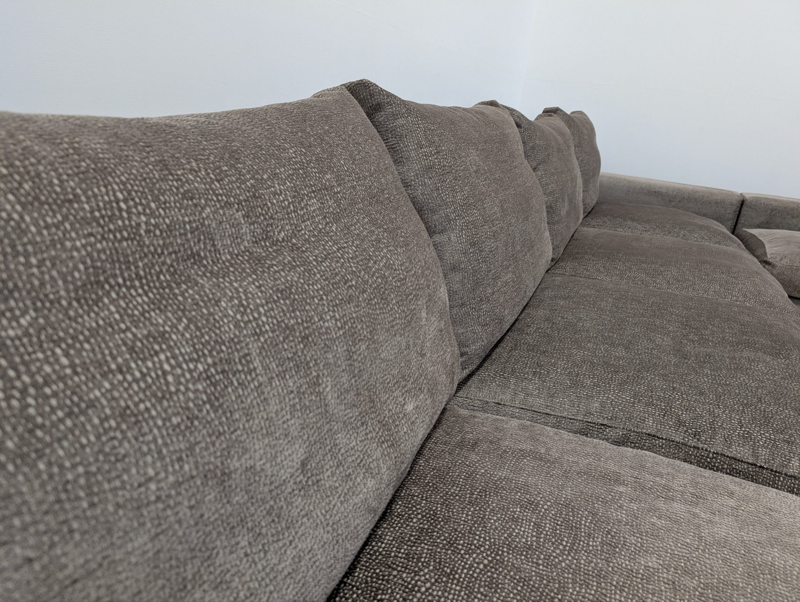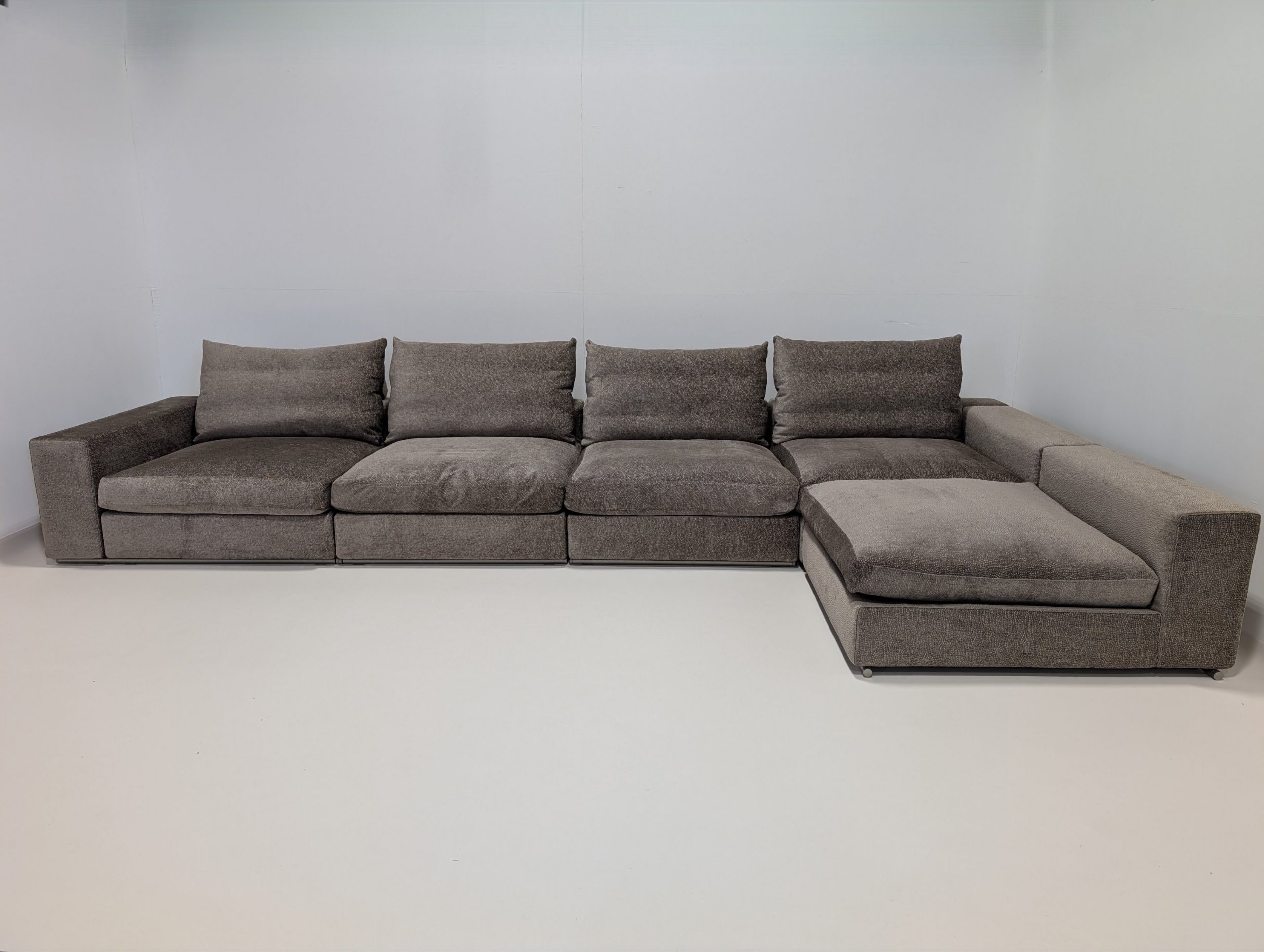 Modular sofa upholstered in fabric to match design scheme. The sofa is upholstered in patterned chenille fabric supplied by Sahco Hesslein.