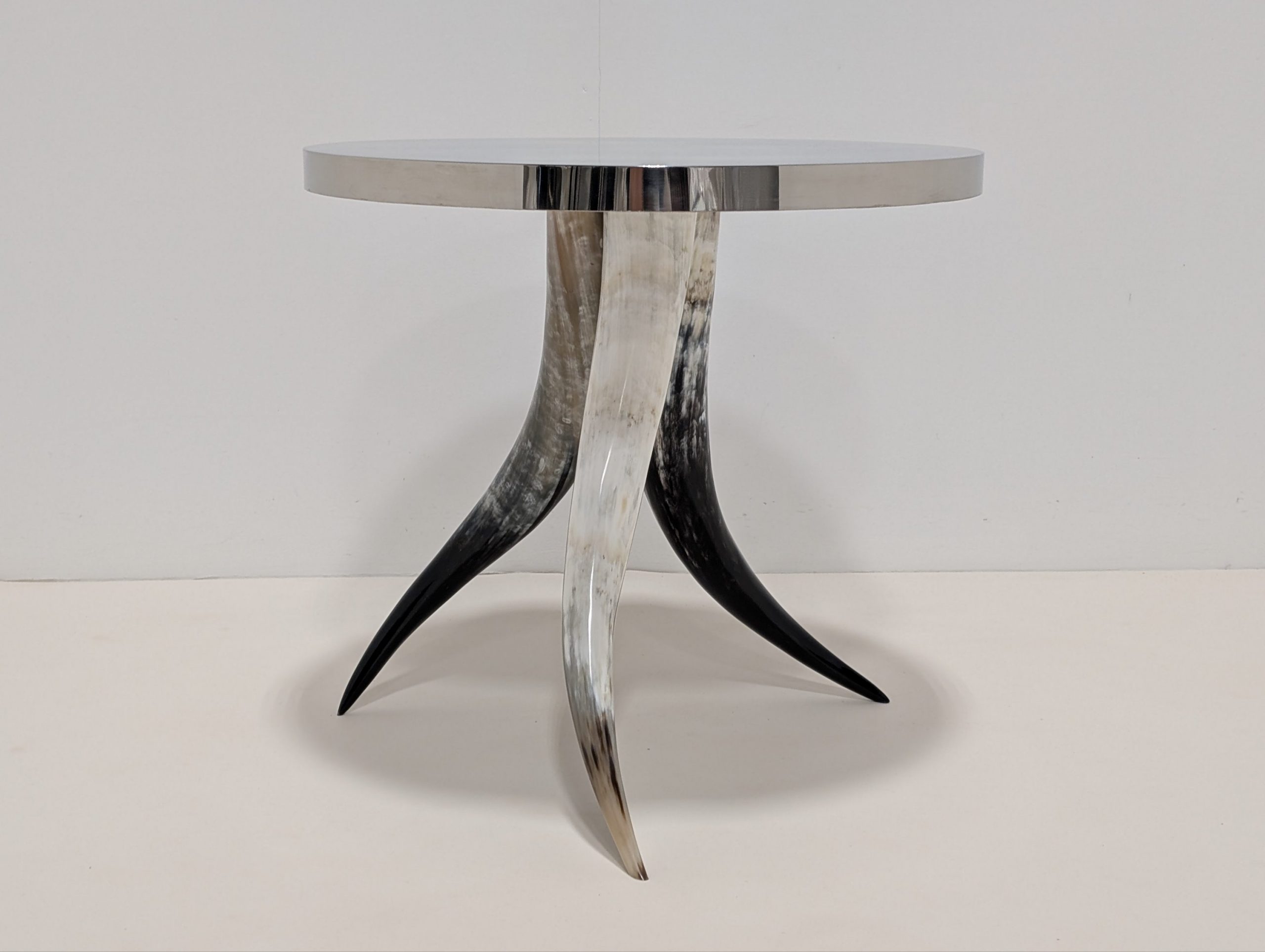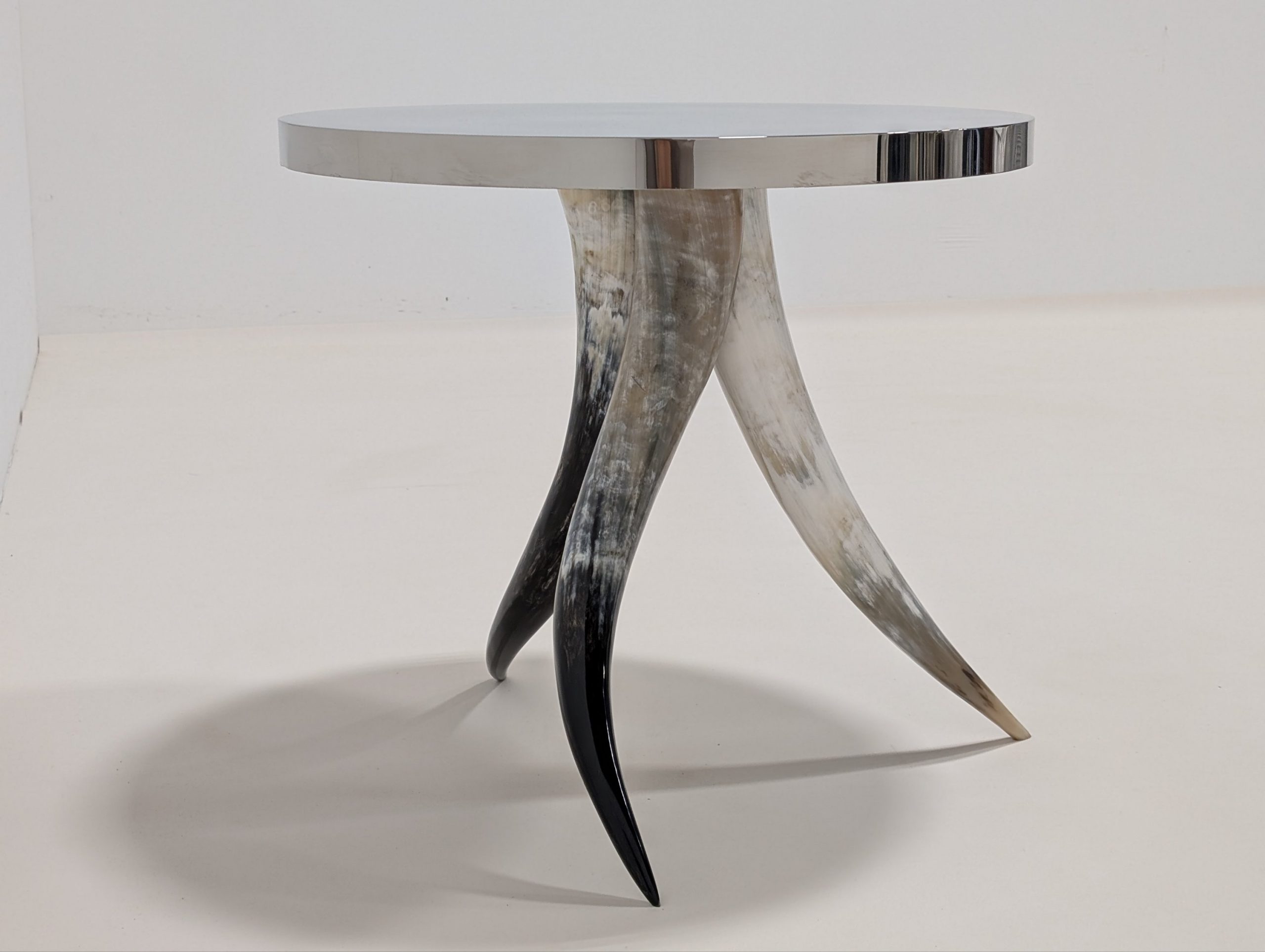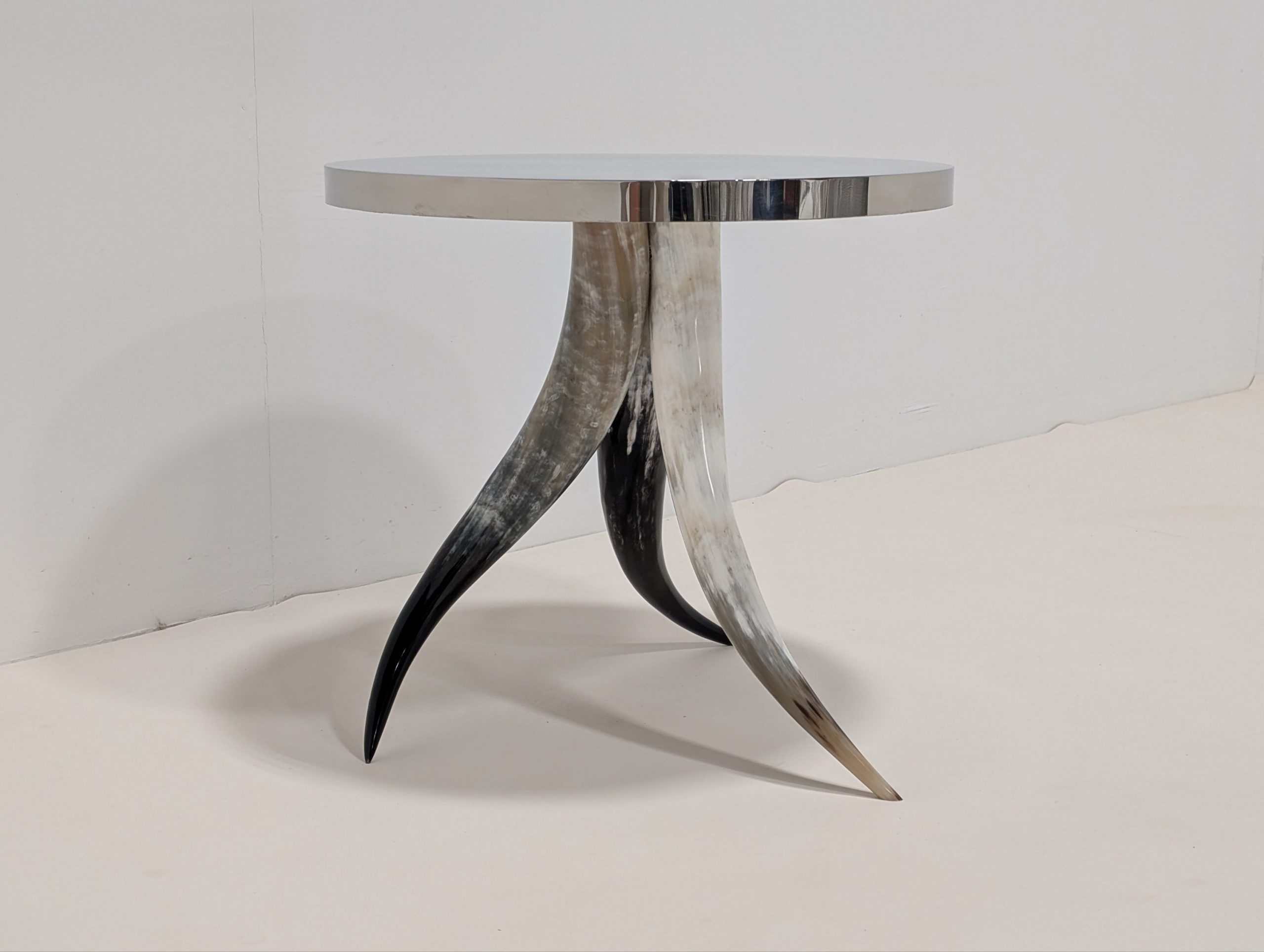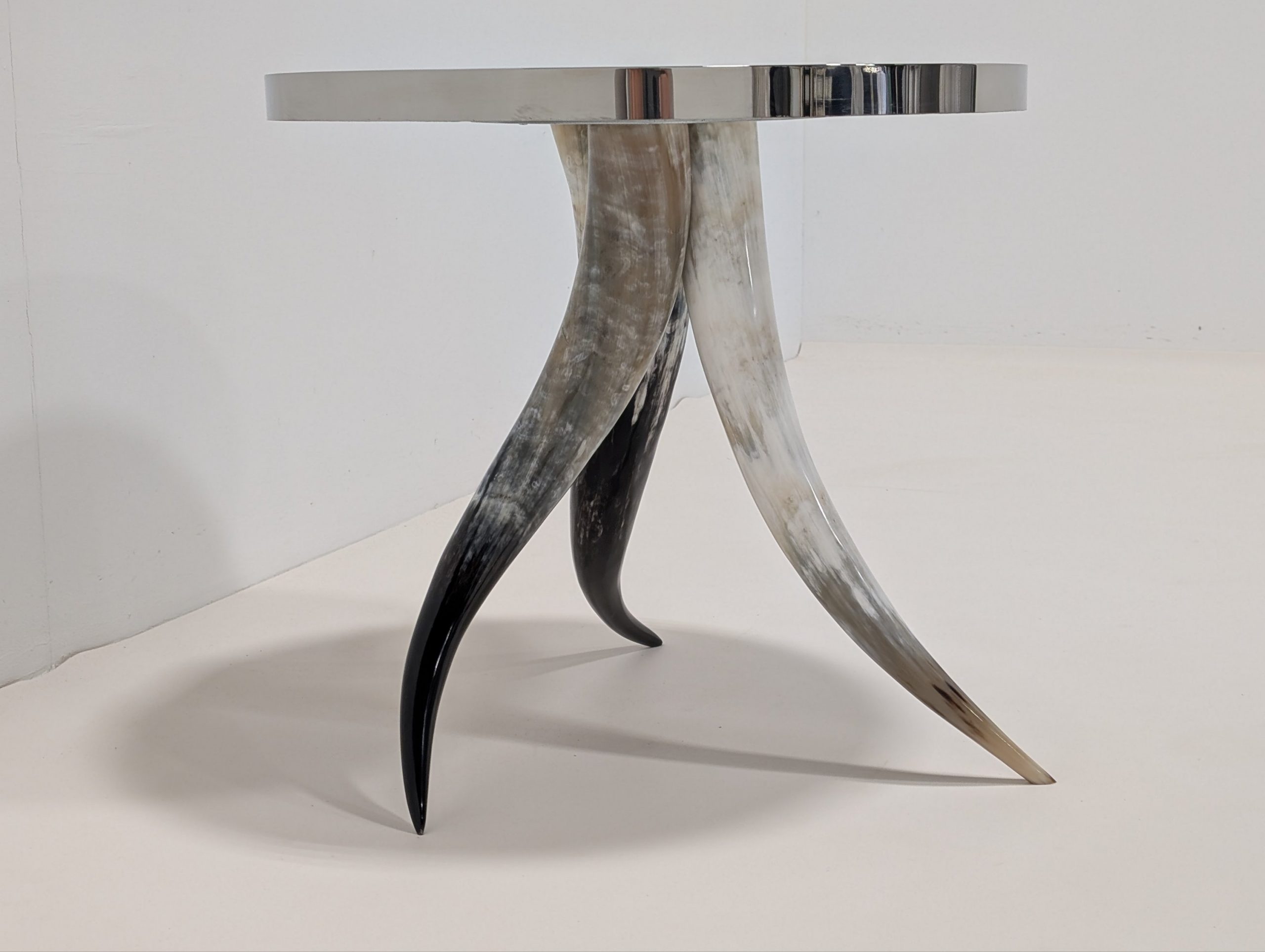 Strikingly modern with an organic twist, this sculptural side table features a smooth, polished nickel top balanced on three sweeping horn-form legs. Each leg curves gracefully to the floor, blending tones from silver to deep charcoal for a subtle ombré effect. The result is a piece that fuses contemporary precision with natural elegance — ideal as an accent beside a sofa, armchair, or statement lamp.