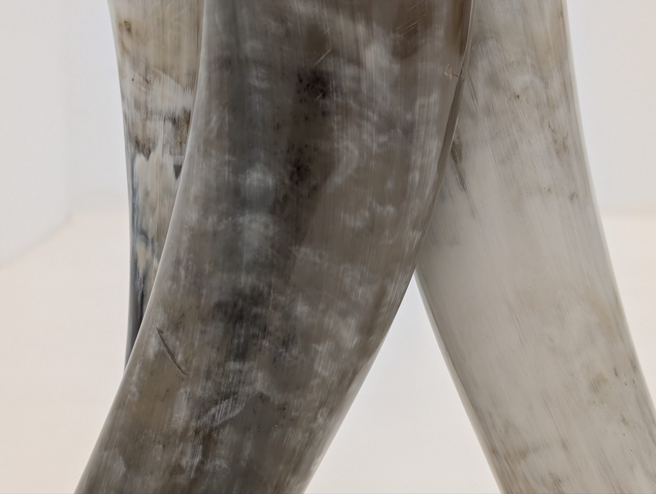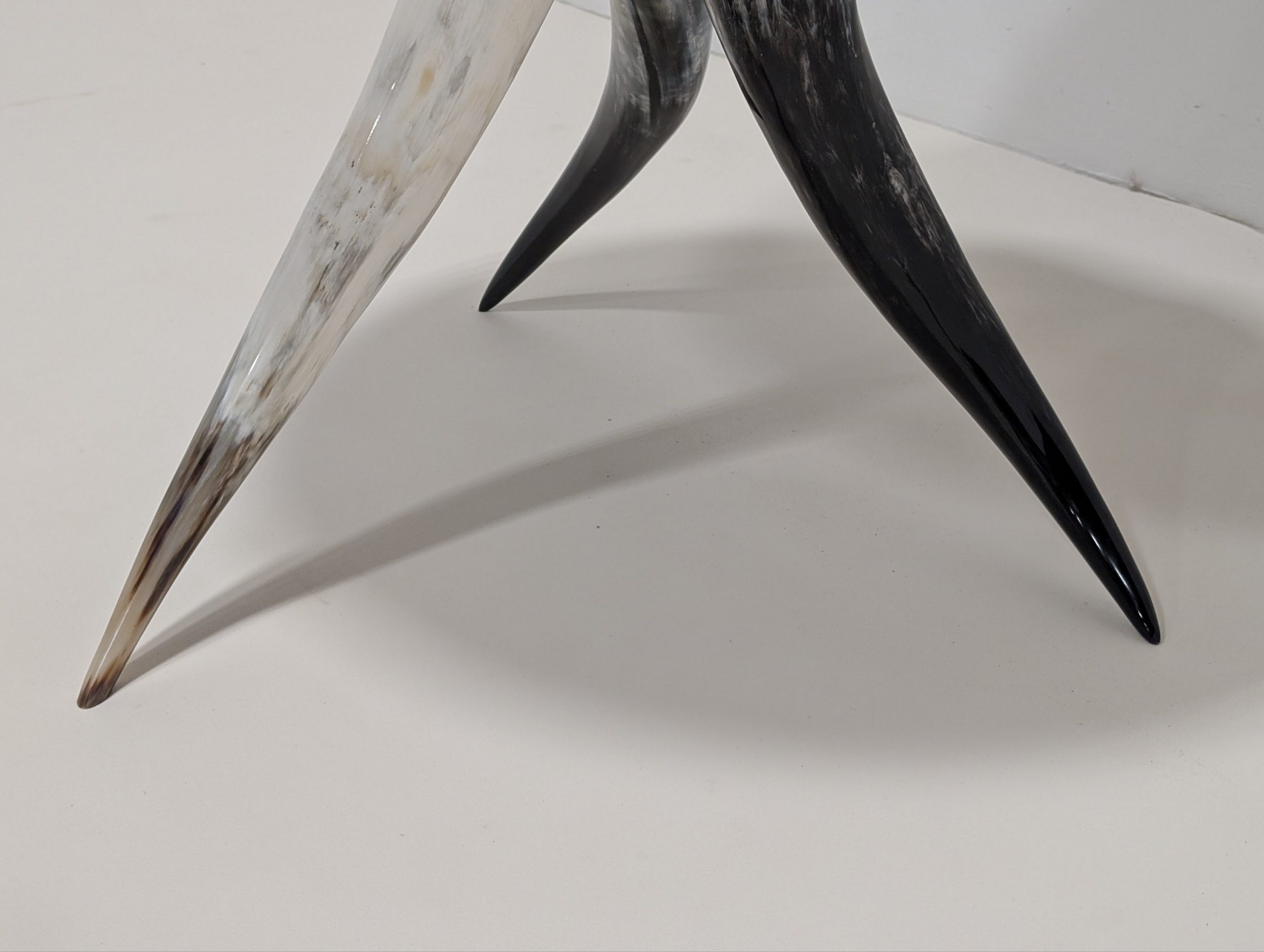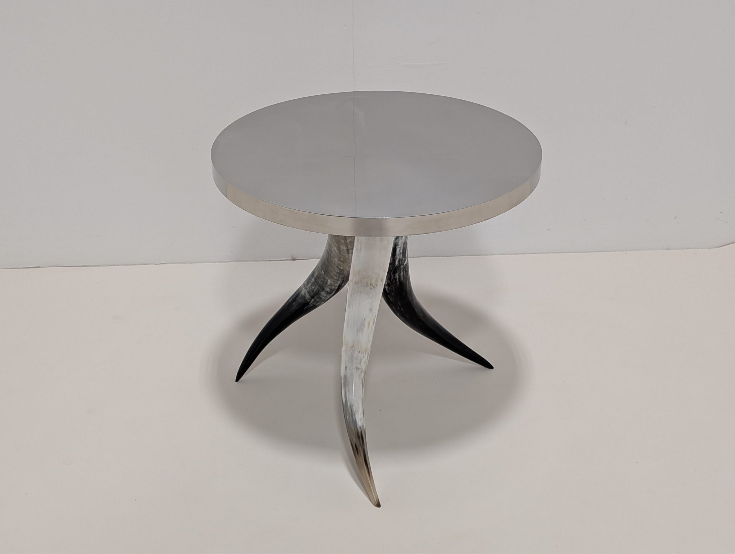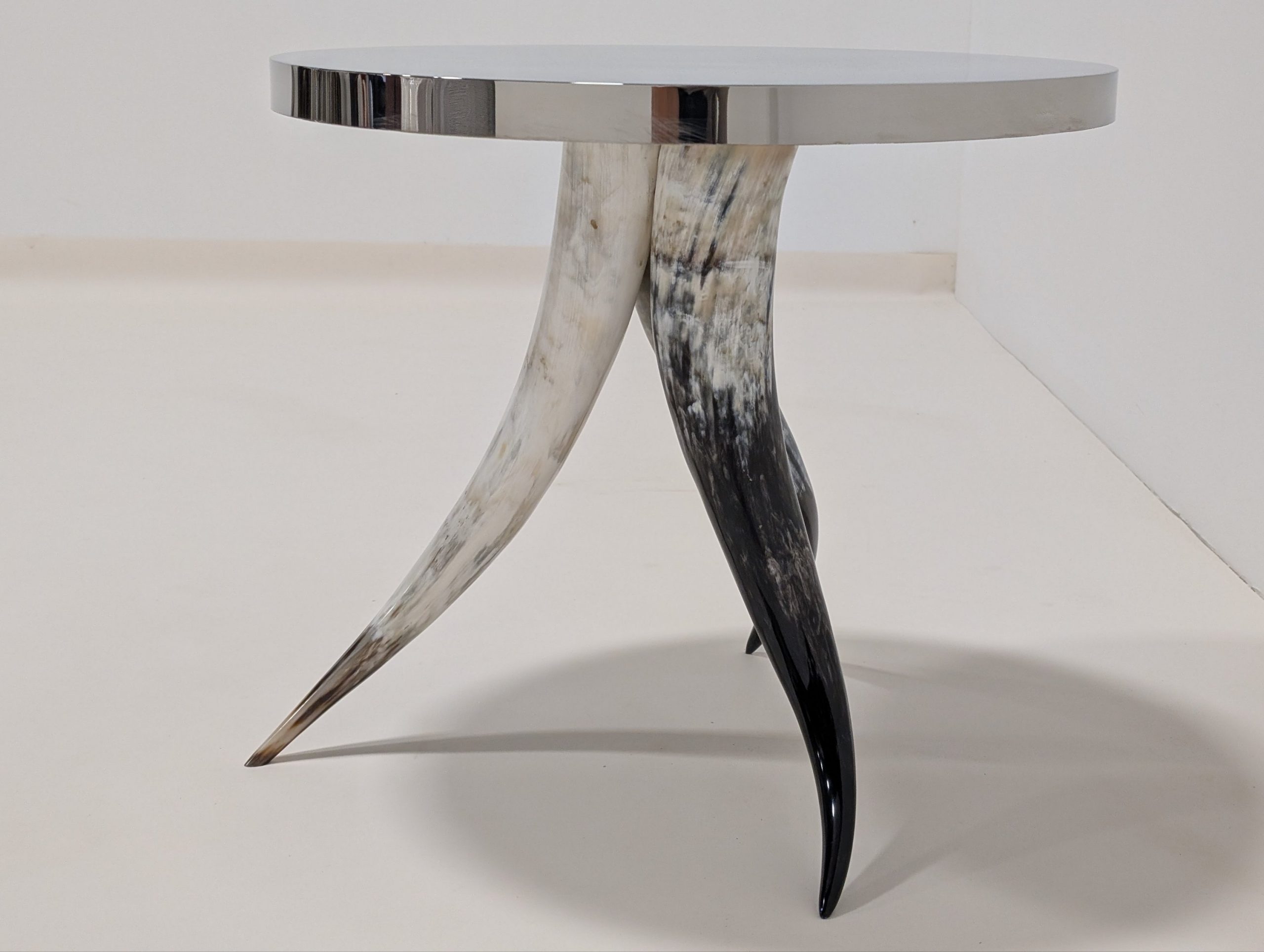 Strikingly modern with an organic twist, this sculptural side table features a smooth, polished nickel top balanced on three sweeping horn-form legs. Each leg curves gracefully to the floor, blending tones from silver to deep charcoal for a subtle ombré effect. The result is a piece that fuses contemporary precision with natural elegance — ideal as an accent beside a sofa, armchair, or statement lamp.
