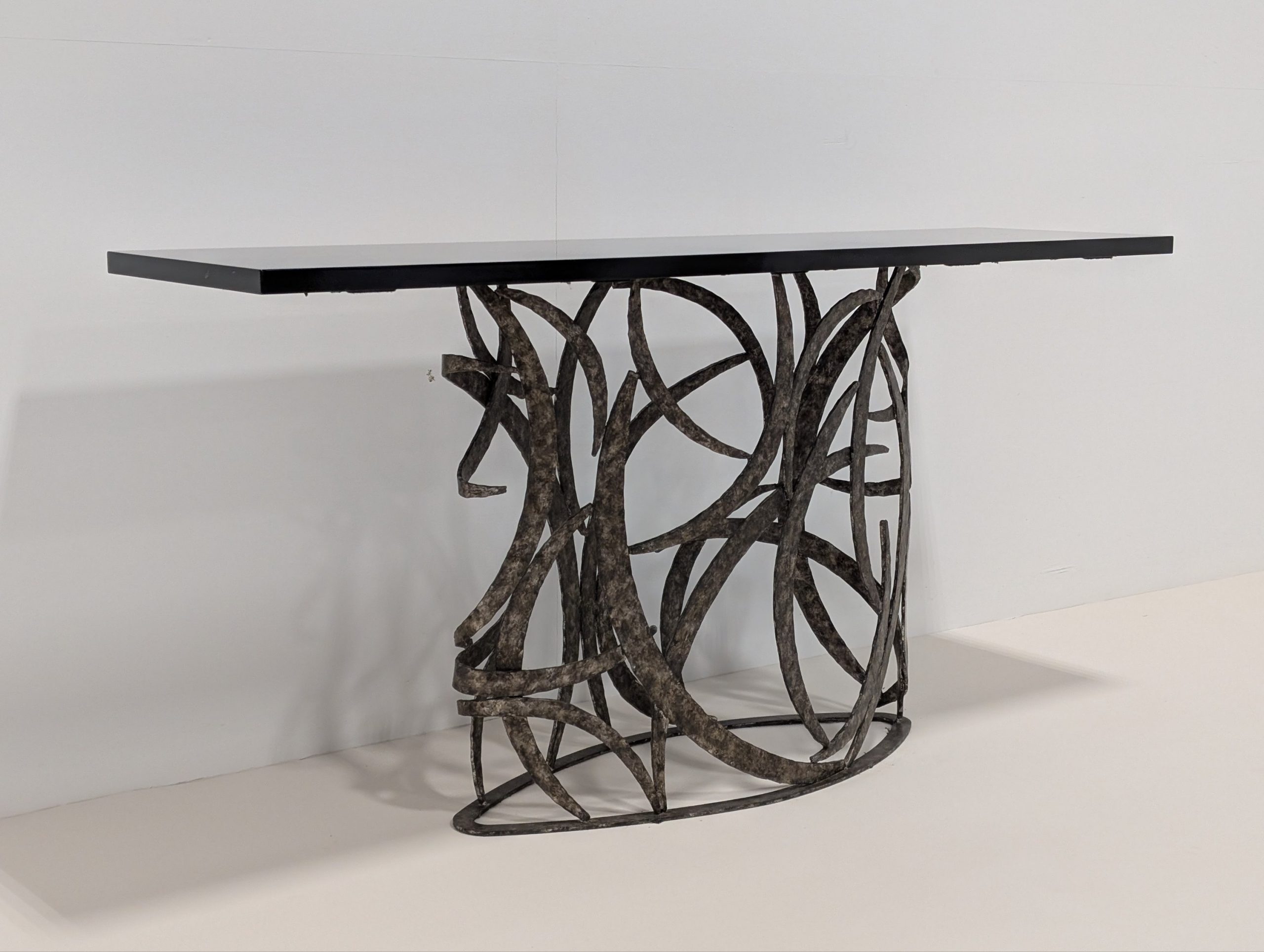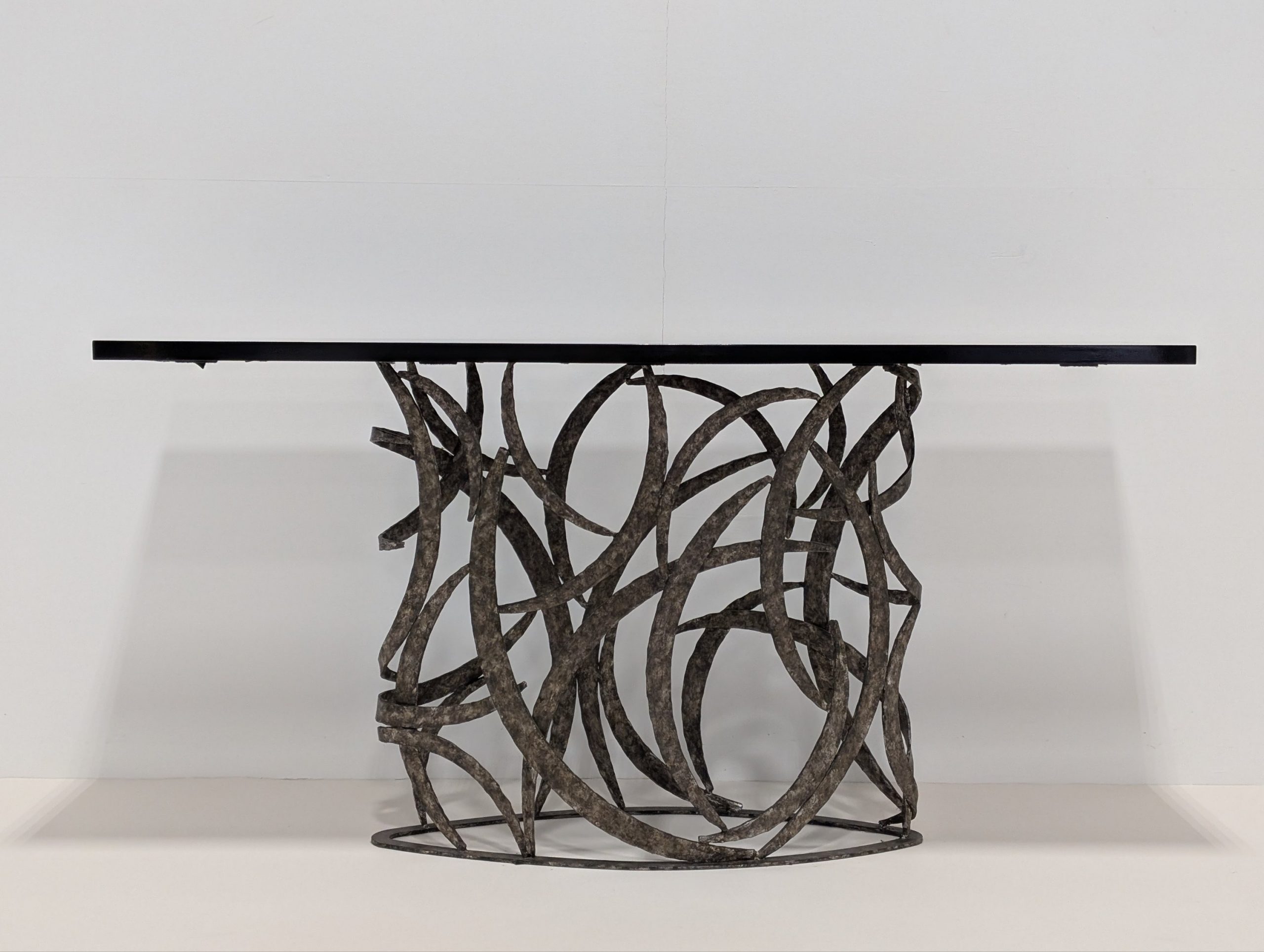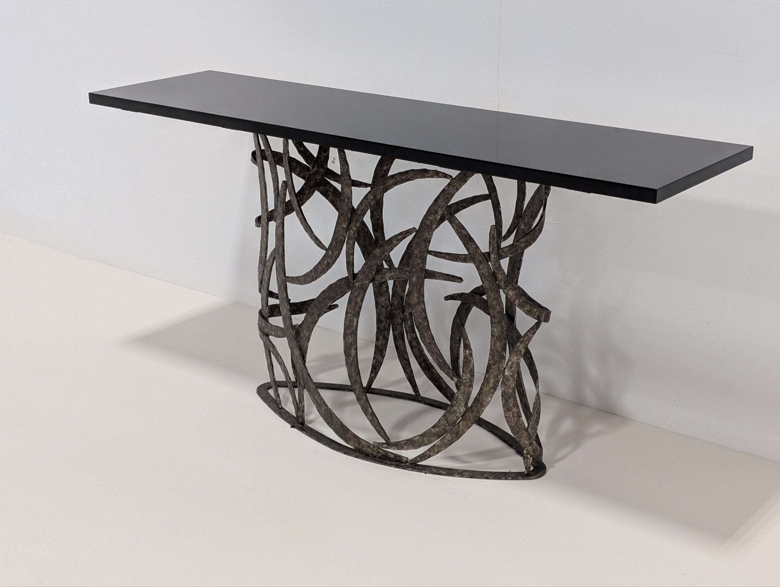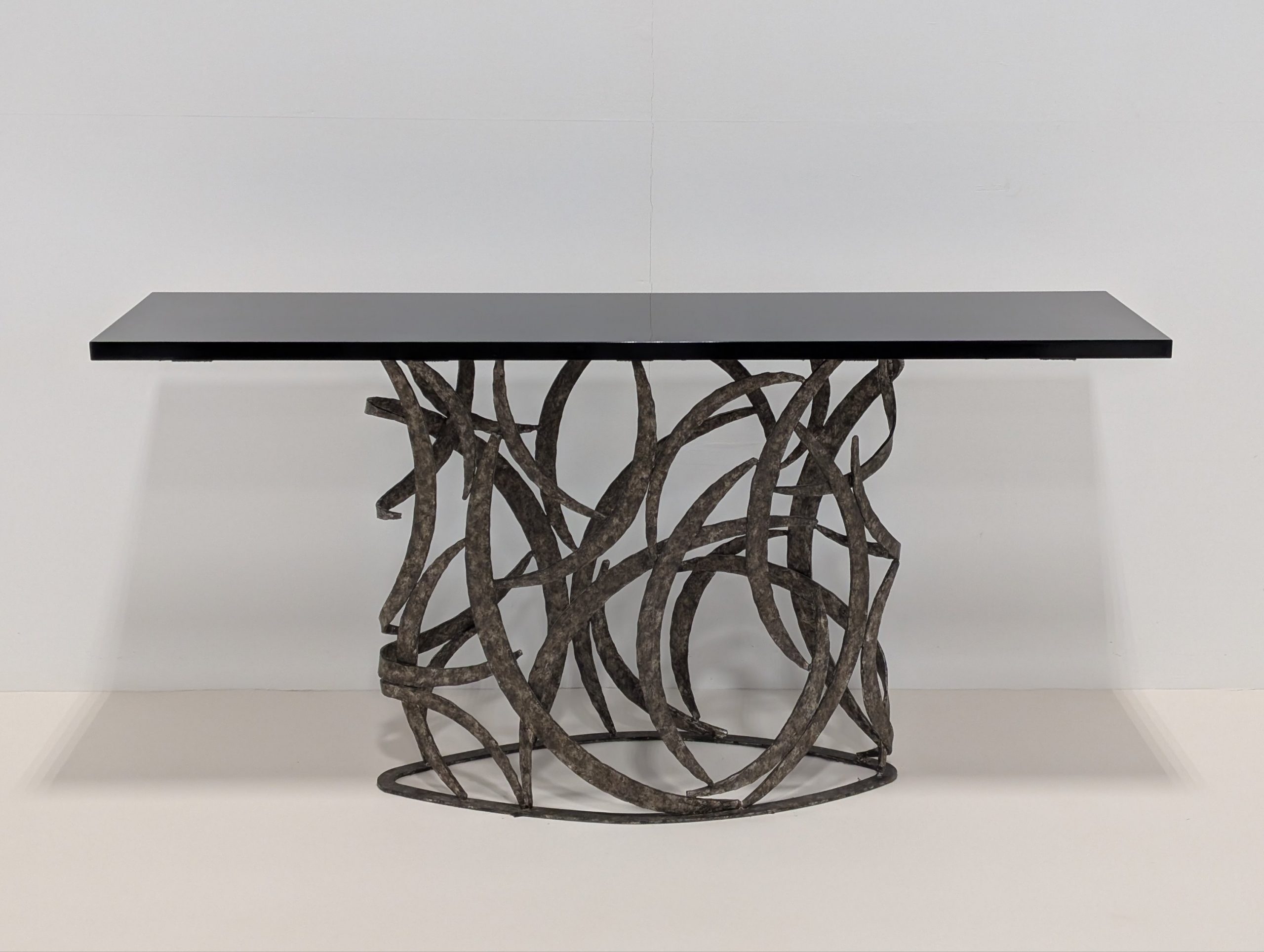 The Miro console by Porta Romana is derived from a simple element in the Miro Lamp. This tour de force from a skilled metalworker is both elegant and incredibly complex.