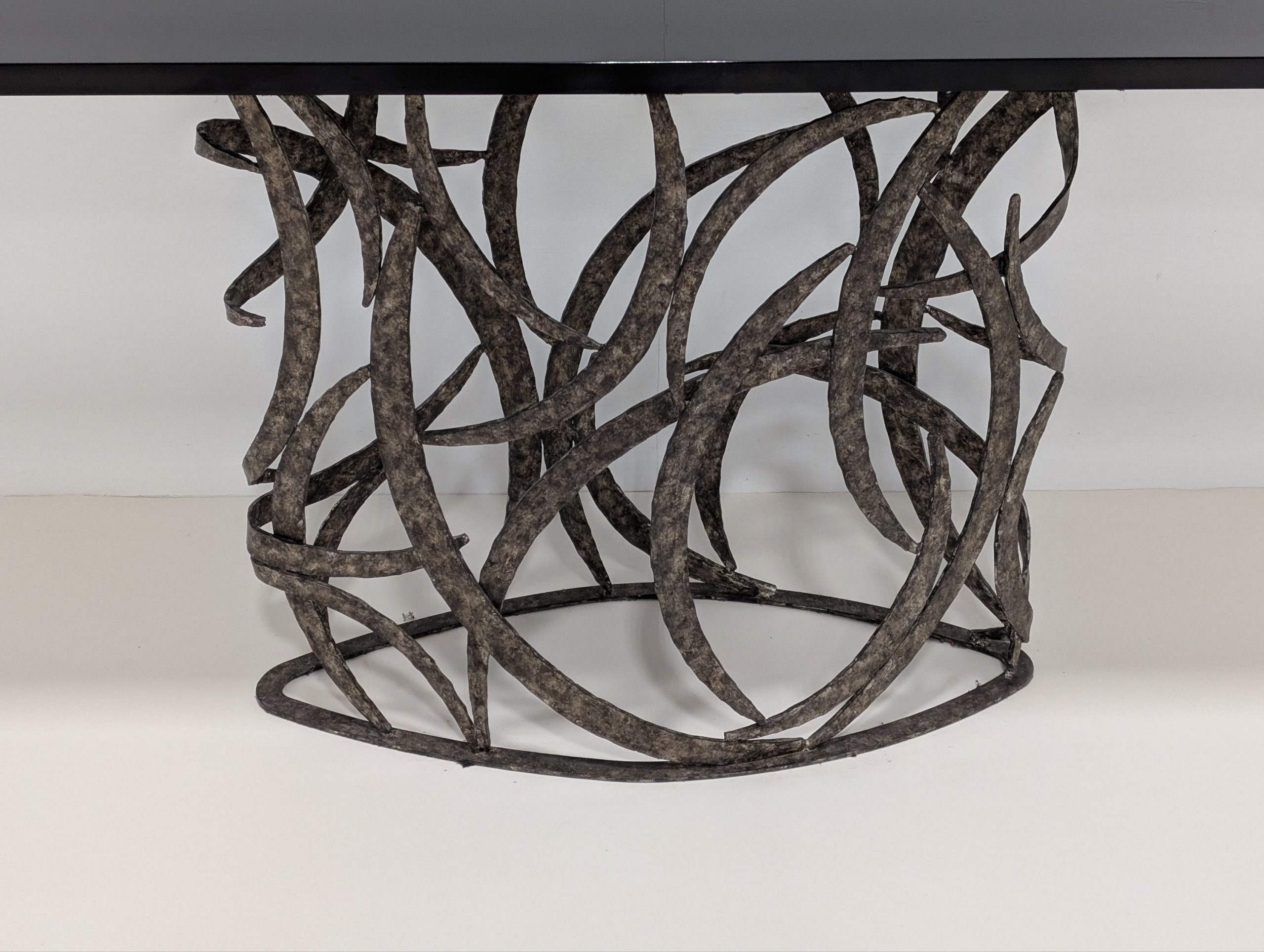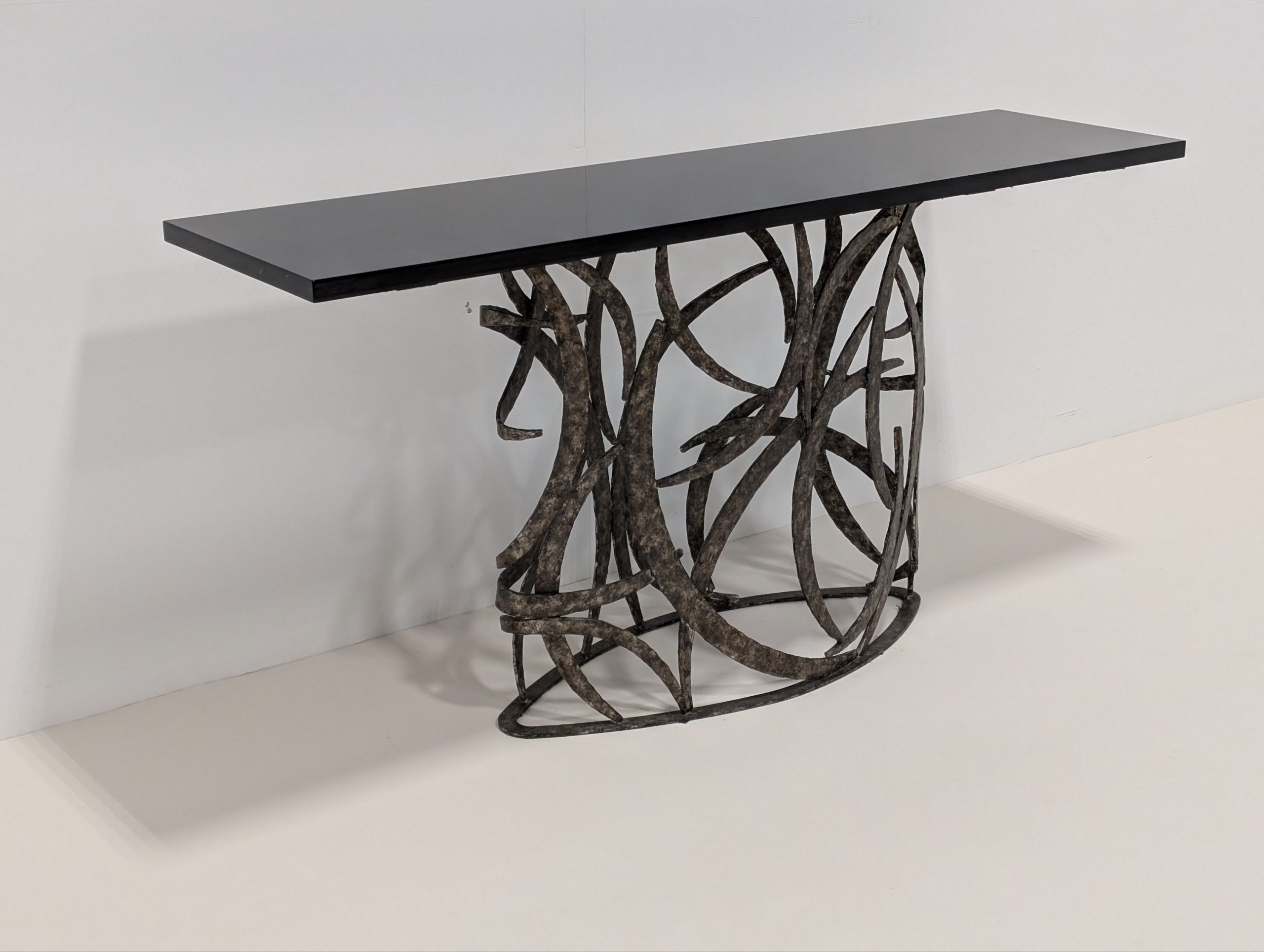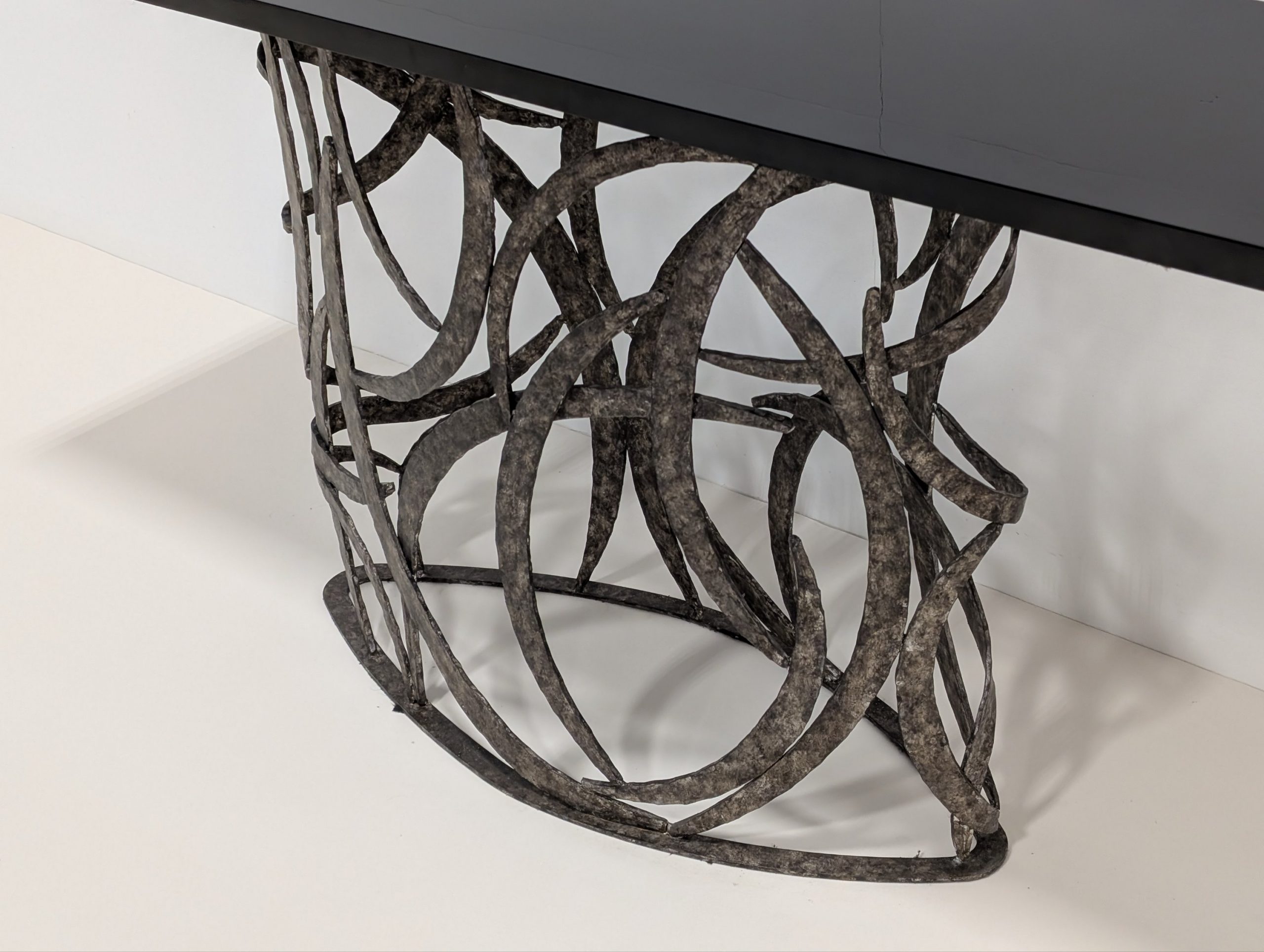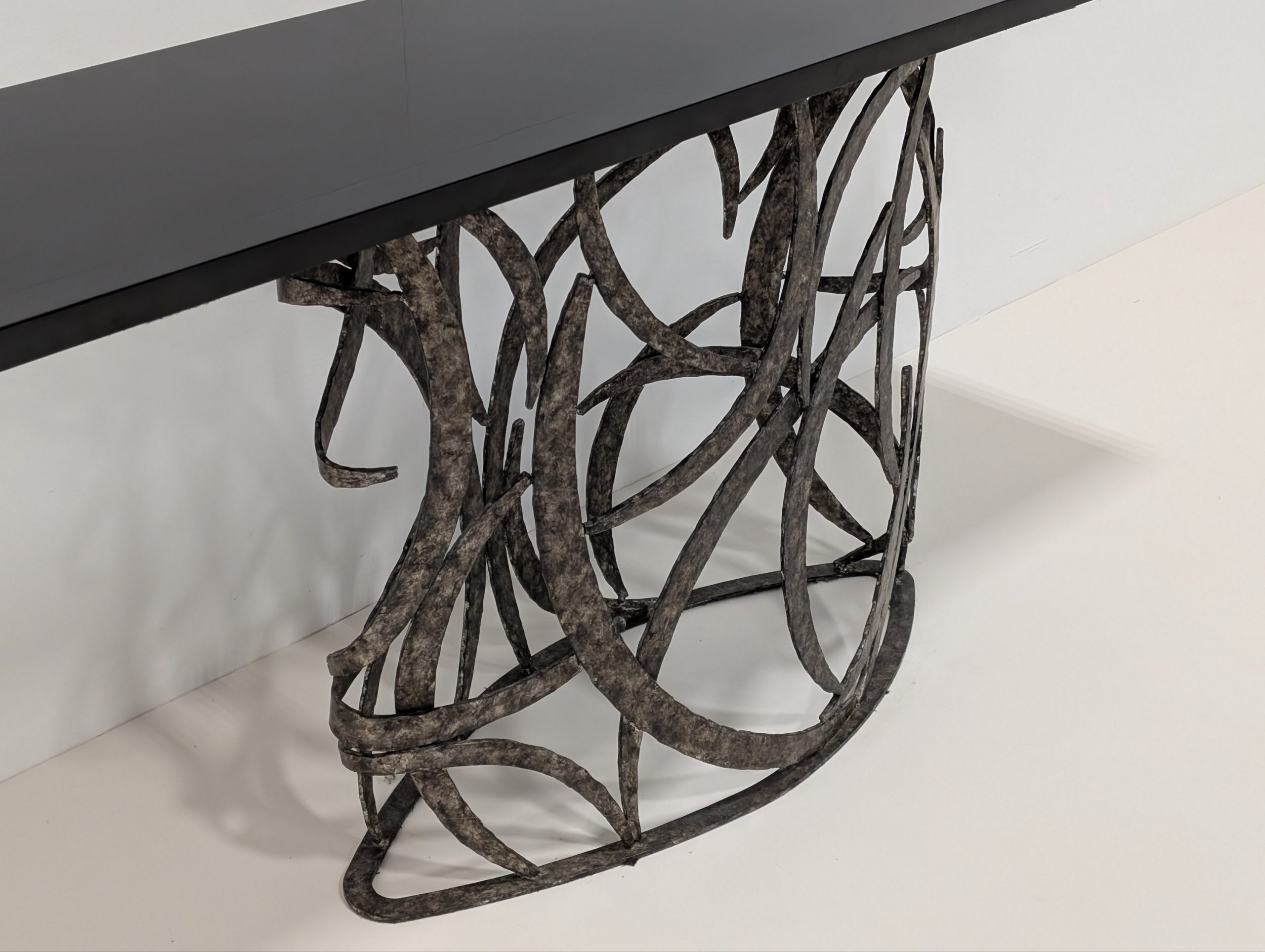 The Miro console by Porta Romana is derived from a simple element in the Miro Lamp. This tour de force from a skilled metalworker is both elegant and incredibly complex.