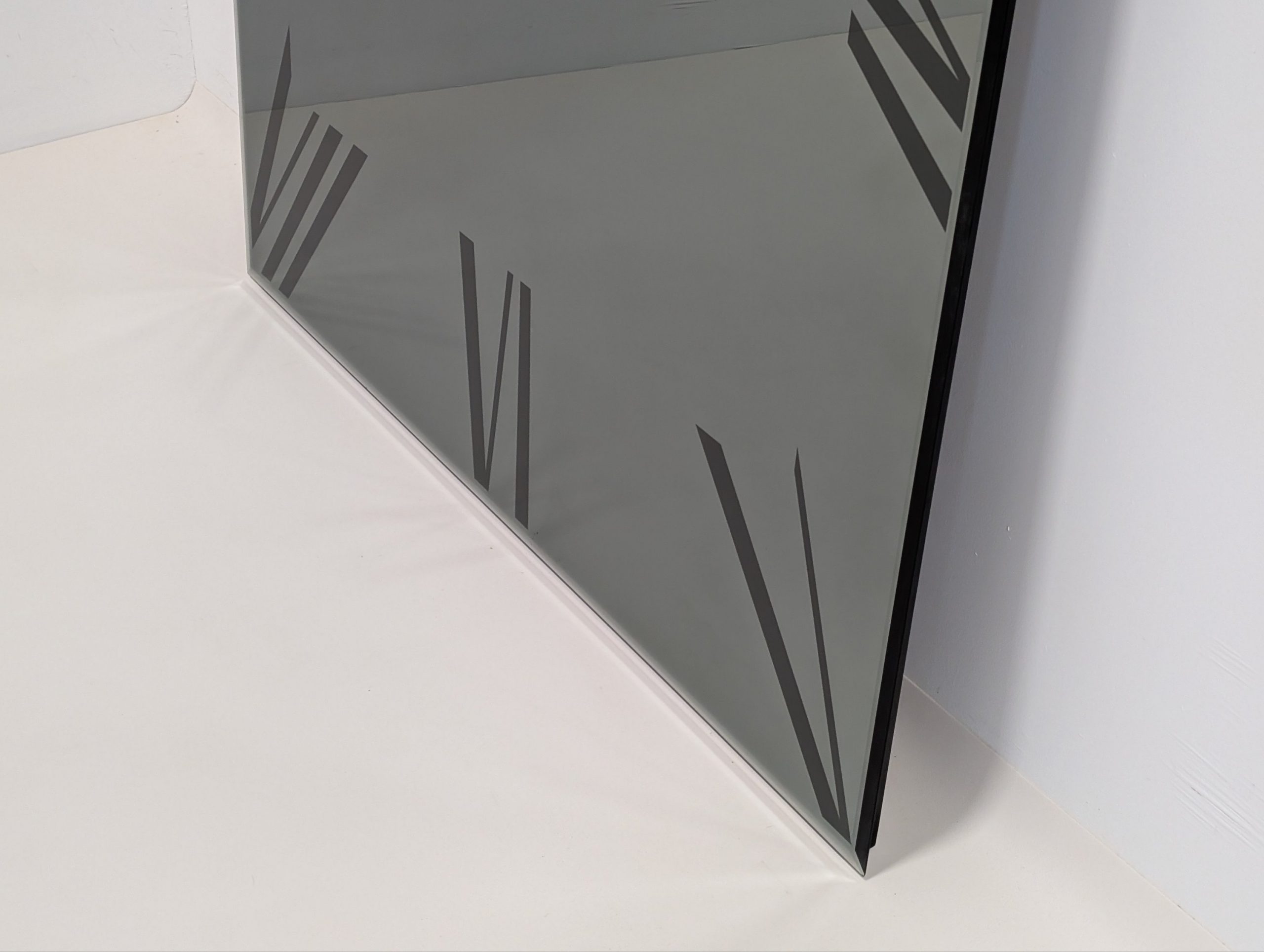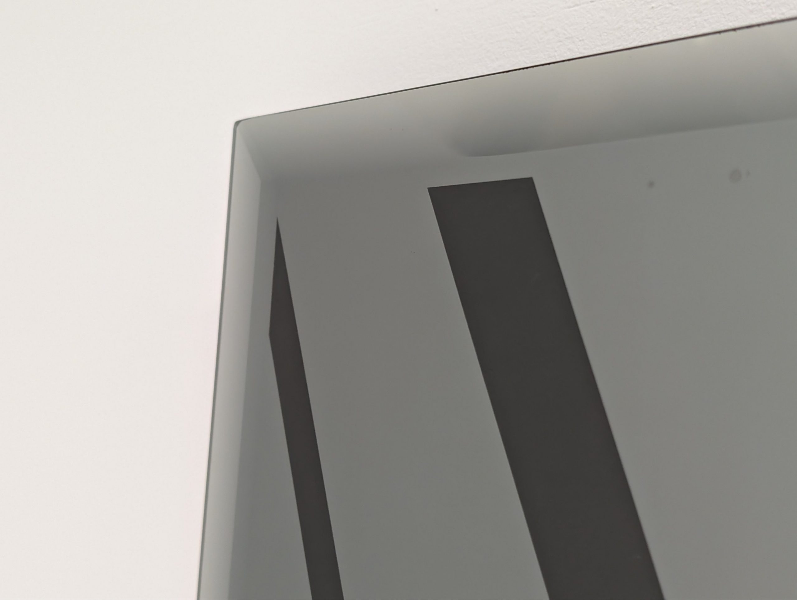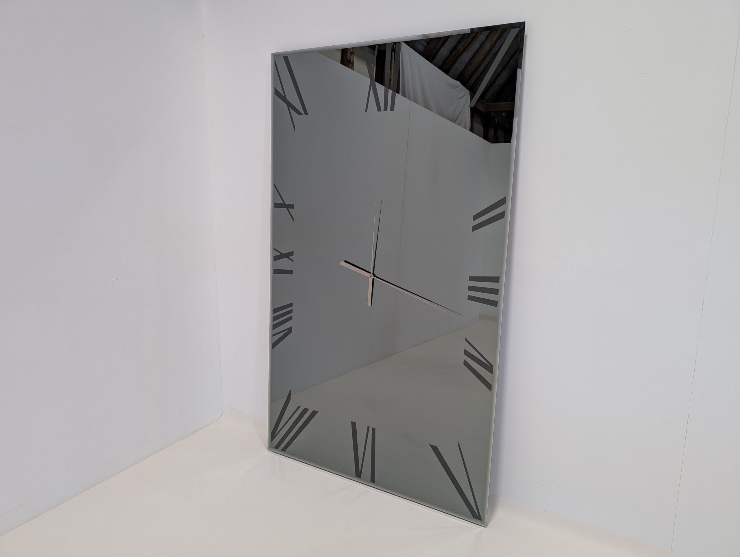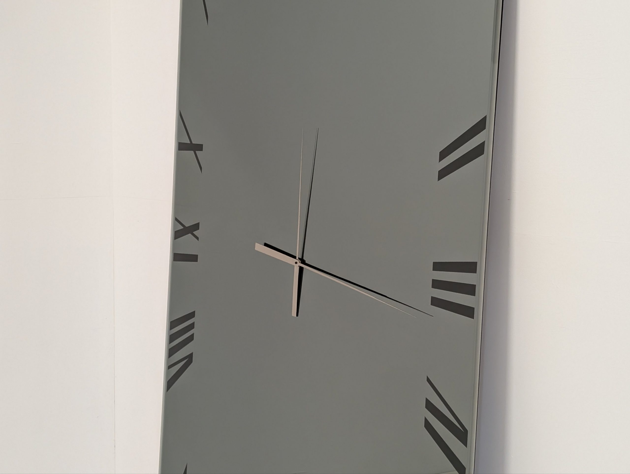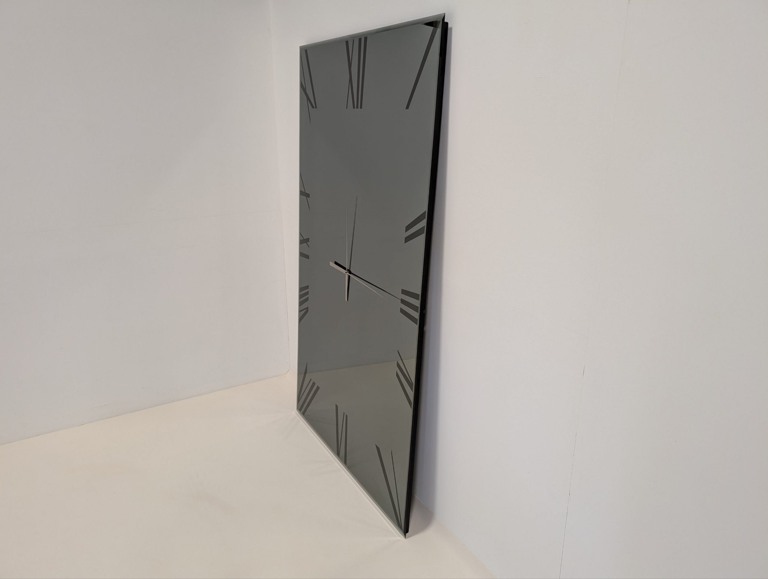 Smoked mirrored glass, its reflective surface is etched with Roman numerals in smoked serigraphy and punctuated by titanium hands—tracing classical order through a contemporary lens.
